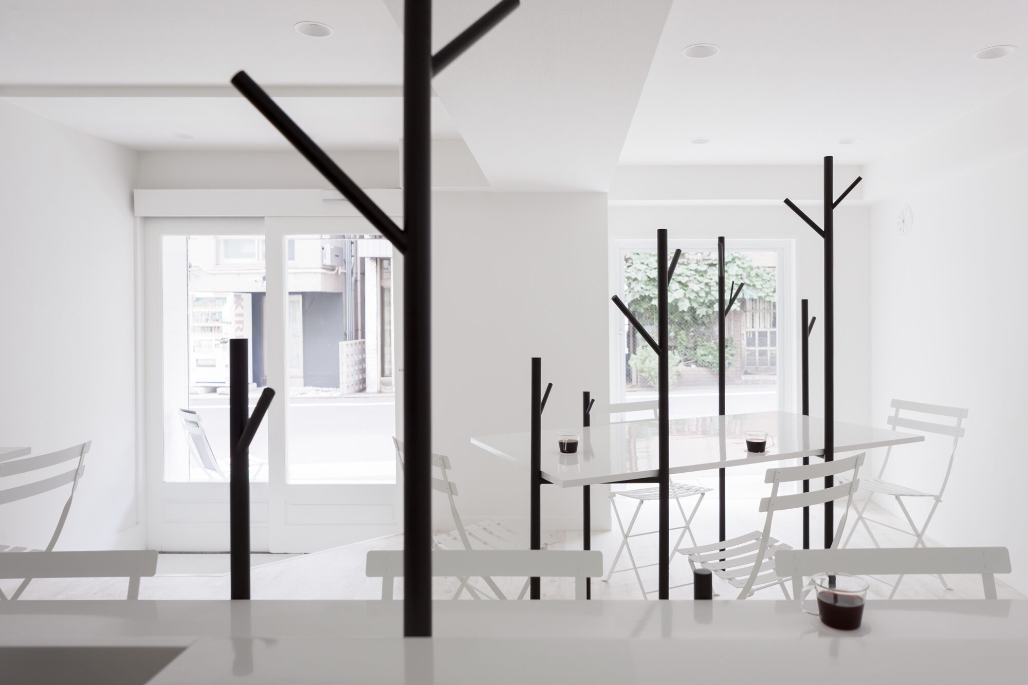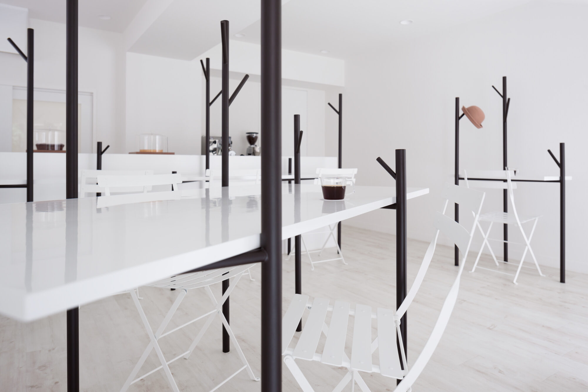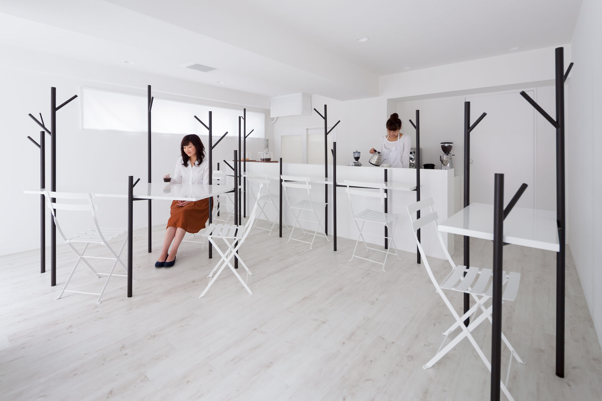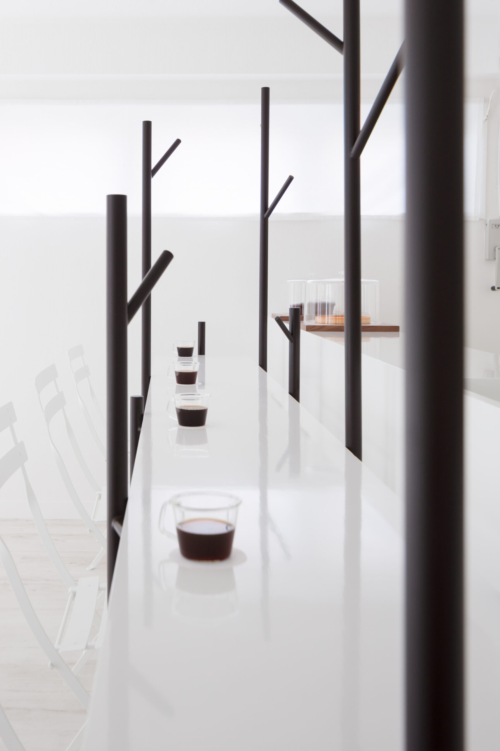 深い珈琲色の木立と、それを引き立てる真っ白な空間です。小さな空間でも広がりを感じられるように、大きなテーブルによって、何もない水平面を作りました。大きなテーブルは、大勢でも使えますが、木の枝が机上の空間を仕切ってくれるので、相席時も心地良い距離感を保つことが出来ます。テーブルを支える「木」の位置や高さは様々で、訪れた方はそれぞれお気に入りの場所を見つけ、思い思いにくつろぐことが出来ます。また、その時々で違った表情が見られるように、高く伸びた「木」は、帽子やコートを掛けられる設計になっています。木立によって、空間にレイヤーが生まれ、実際以上の奥行きが感じられる構成です。