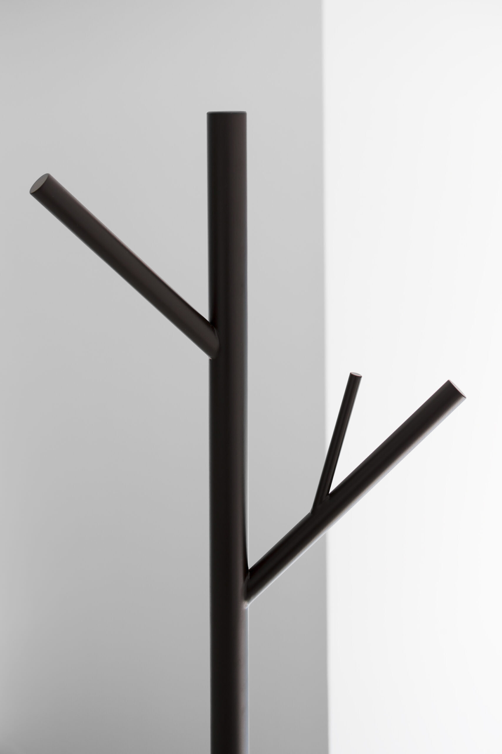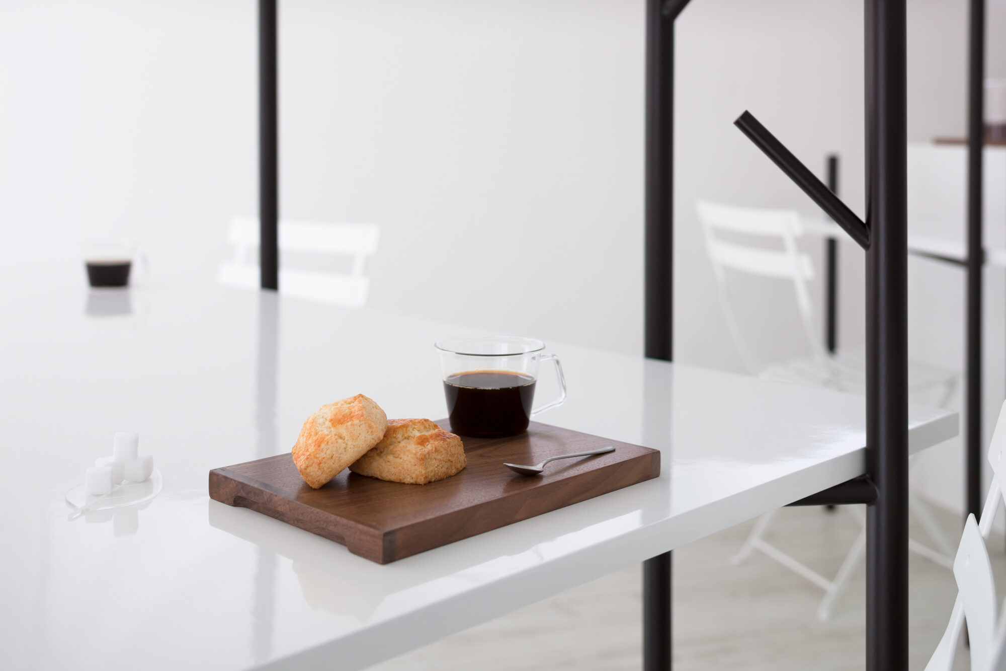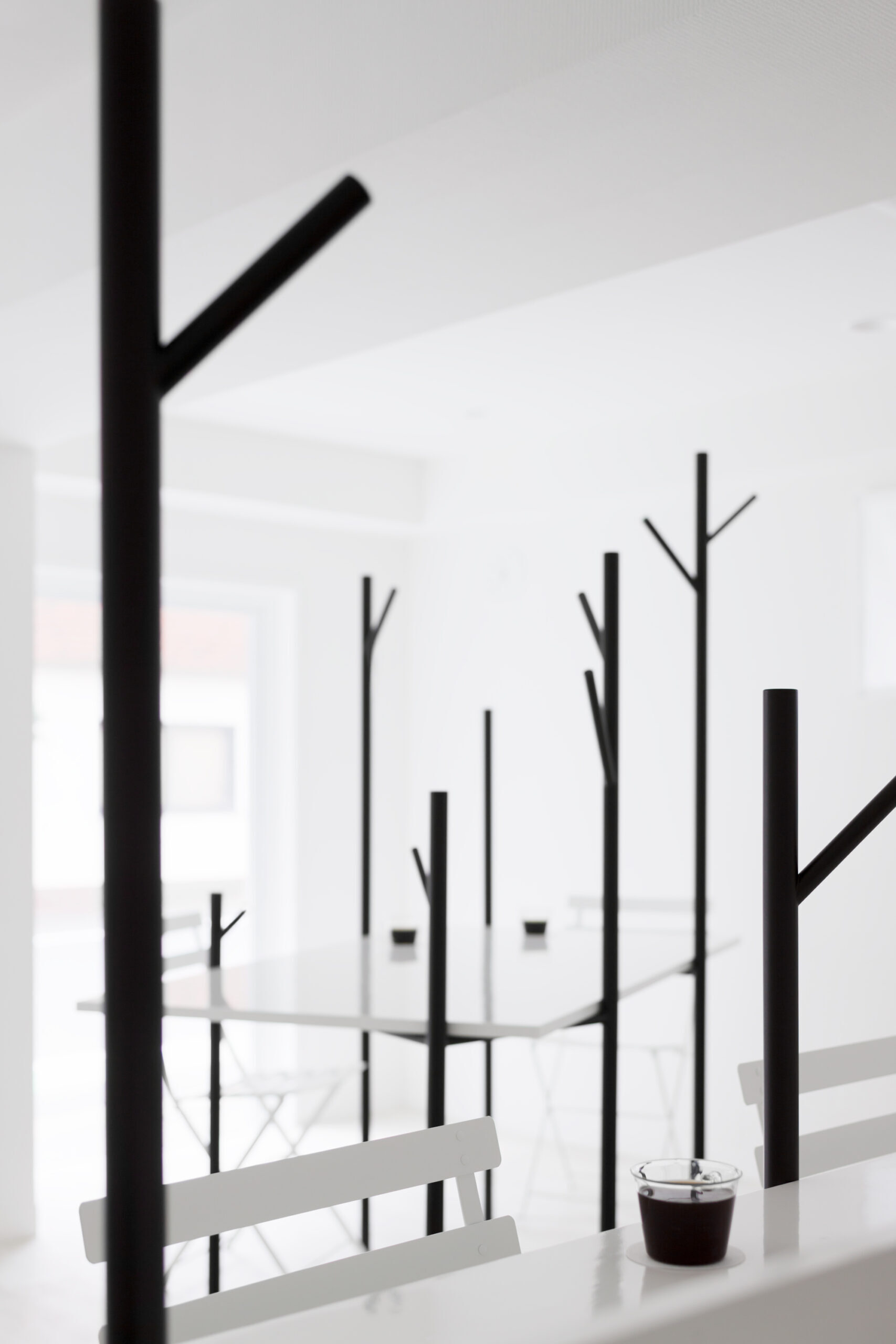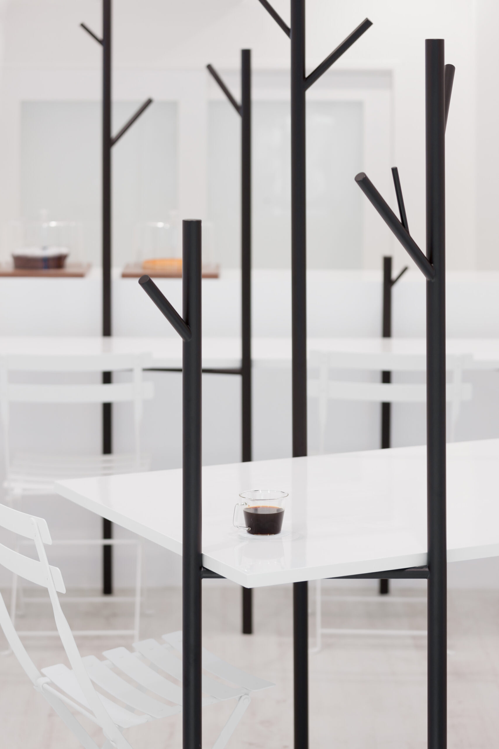 深い珈琲色の木立と、それを引き立てる真っ白な空間です。小さな空間でも広がりを感じられるように、大きなテーブルによって、何もない水平面を作りました。大きなテーブルは、大勢でも使えますが、木の枝が机上の空間を仕切ってくれるので、相席時も心地良い距離感を保つことが出来ます。テーブルを支える「木」の位置や高さは様々で、訪れた方はそれぞれお気に入りの場所を見つけ、思い思いにくつろぐことが出来ます。また、その時々で違った表情が見られるように、高く伸びた「木」は、帽子やコートを掛けられる設計になっています。木立によって、空間にレイヤーが生まれ、実際以上の奥行きが感じられる構成です。