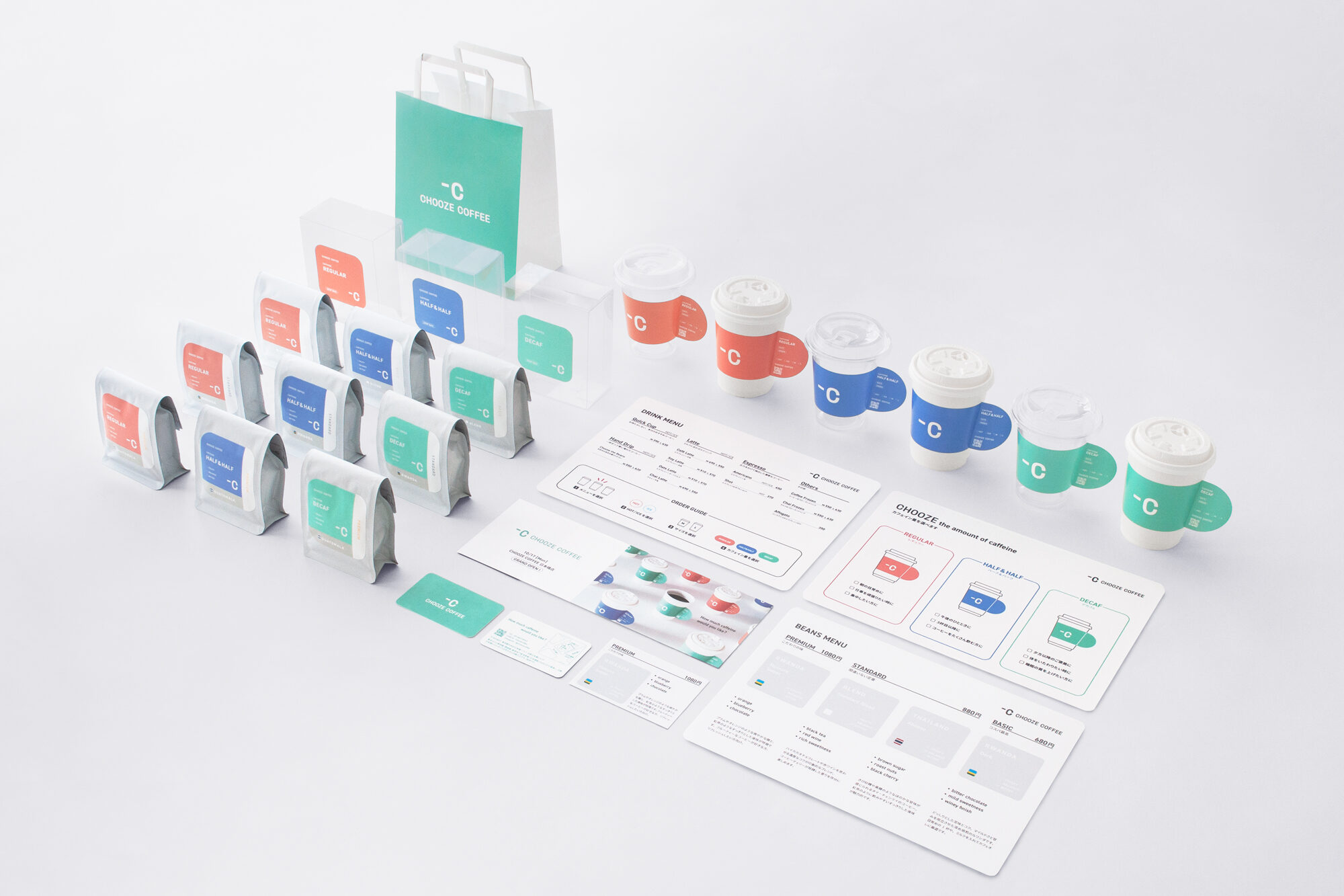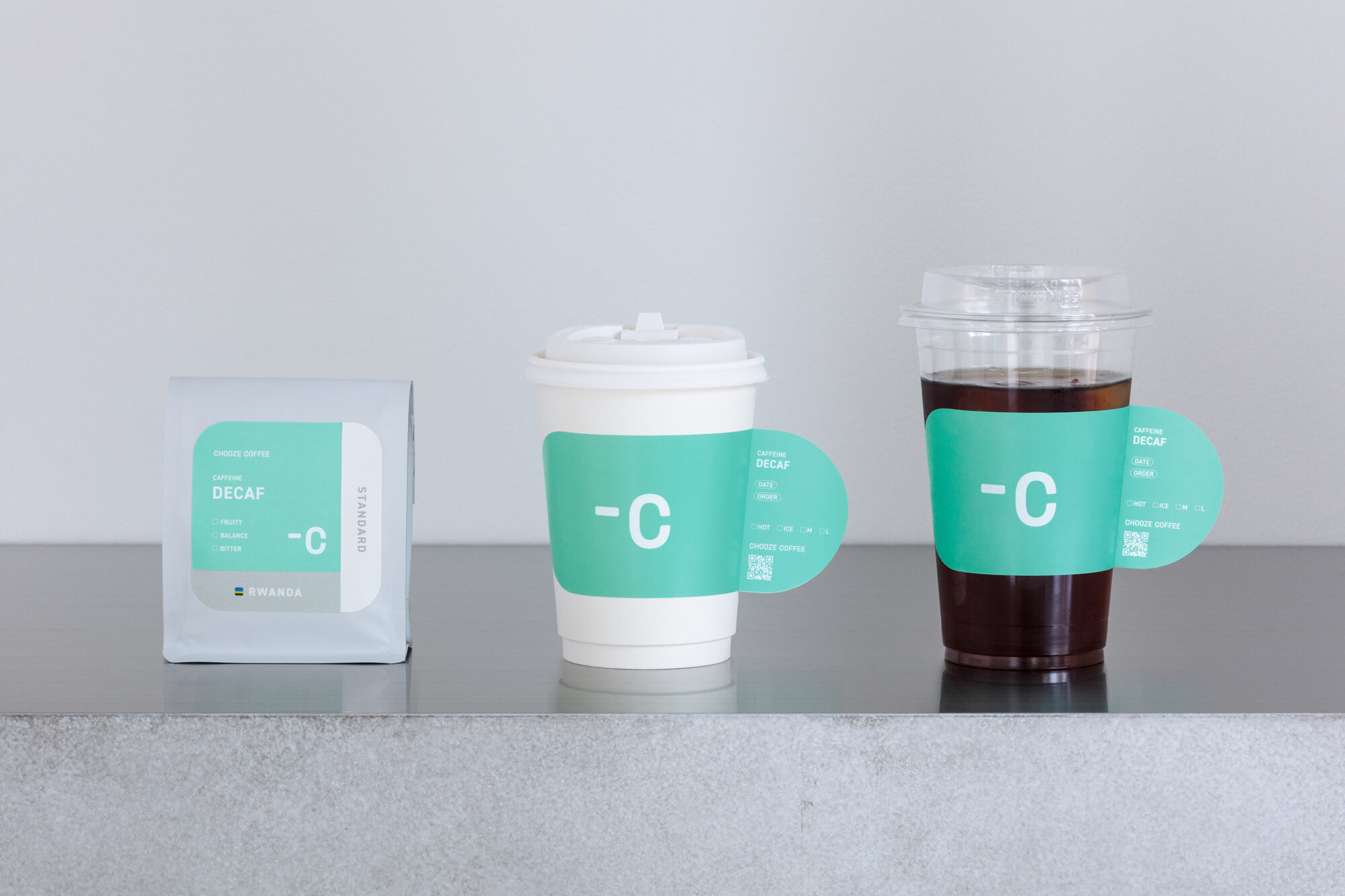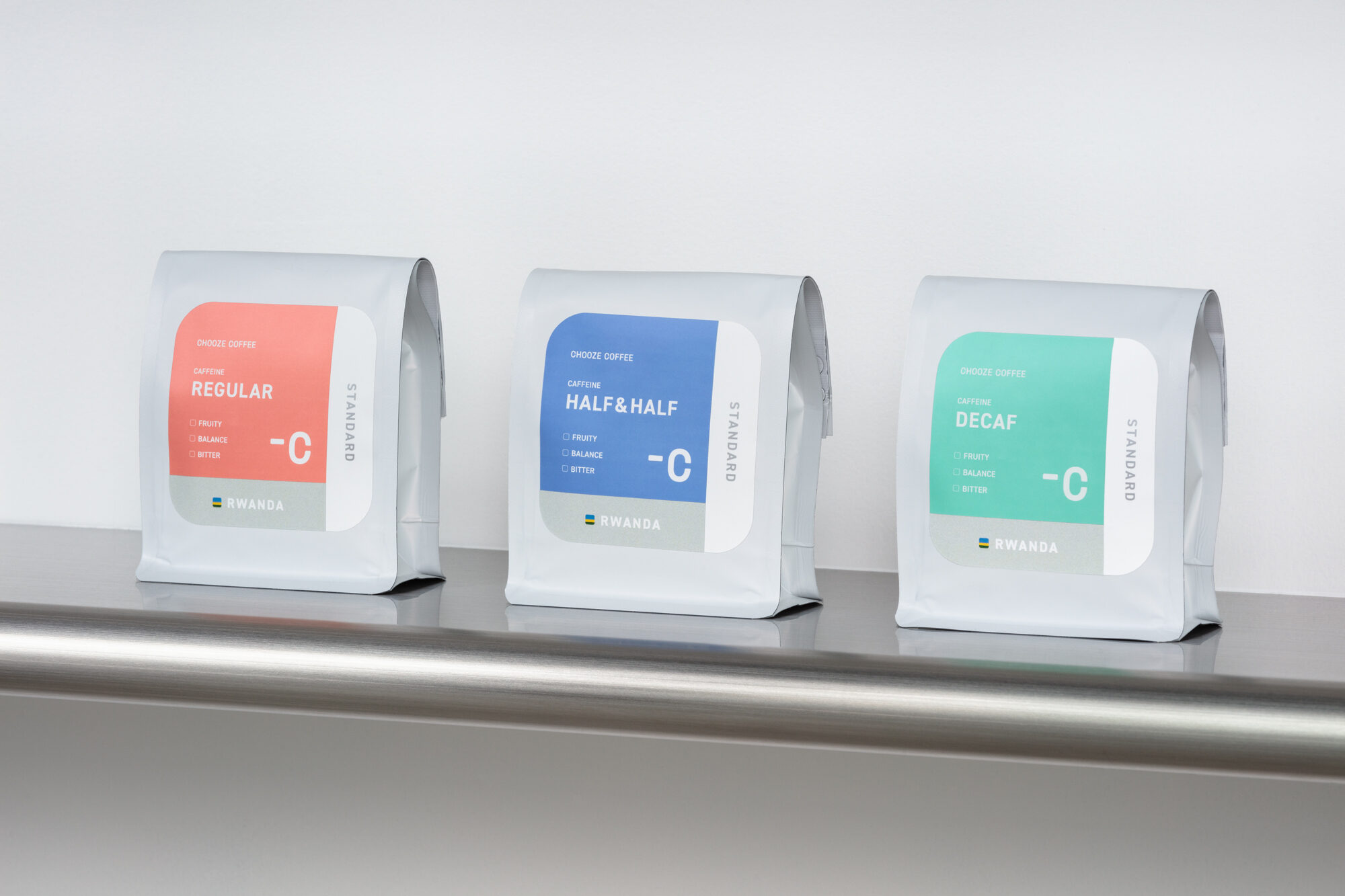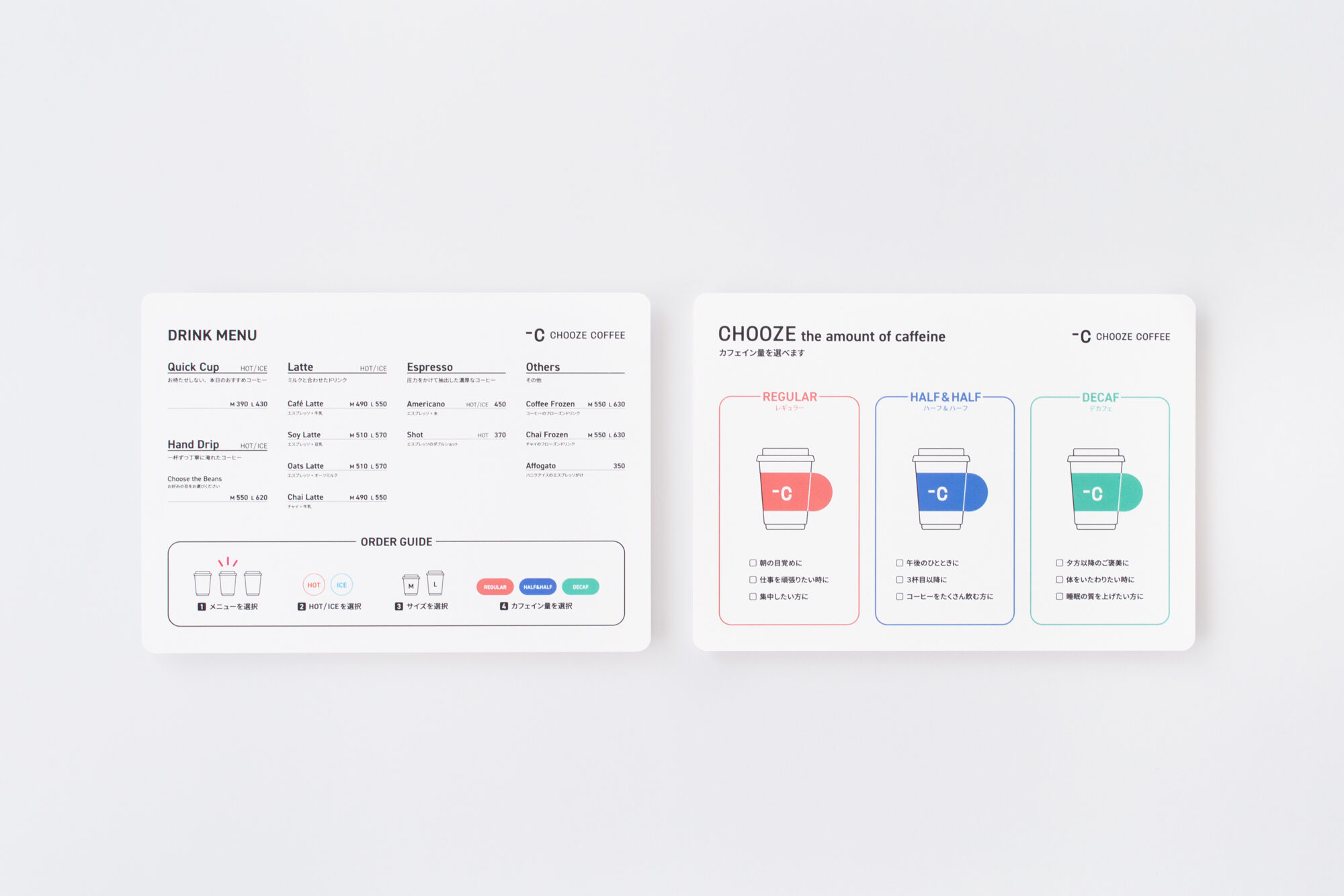 CHOOZE COFFEEは、高品質なスペシャルティコーヒーを用いたデカフェ豆を使用し、カフェイン量を選ぶ新しい体験を提案するコーヒーブランドです。ロゴは工業的で機能的な印象のフォントを起点にしています。縦長ですっきりしたアルファベットのO(オー)はコーヒー豆のようなフォルムをしています。O(オー)の一部を抜き取ることでオリジナルのC(シー)に仕立てました。既存のものから一部を抜き取ることで新しい別のものにすることを試みています。これは、コーヒー豆からカフェインを最適な方法で抜き取ることで、美味しいデカフェを完成させる工程を反映したものとなっています。記号的なロゴによって、言語の異なる文化圏においても機能することを目指しました。