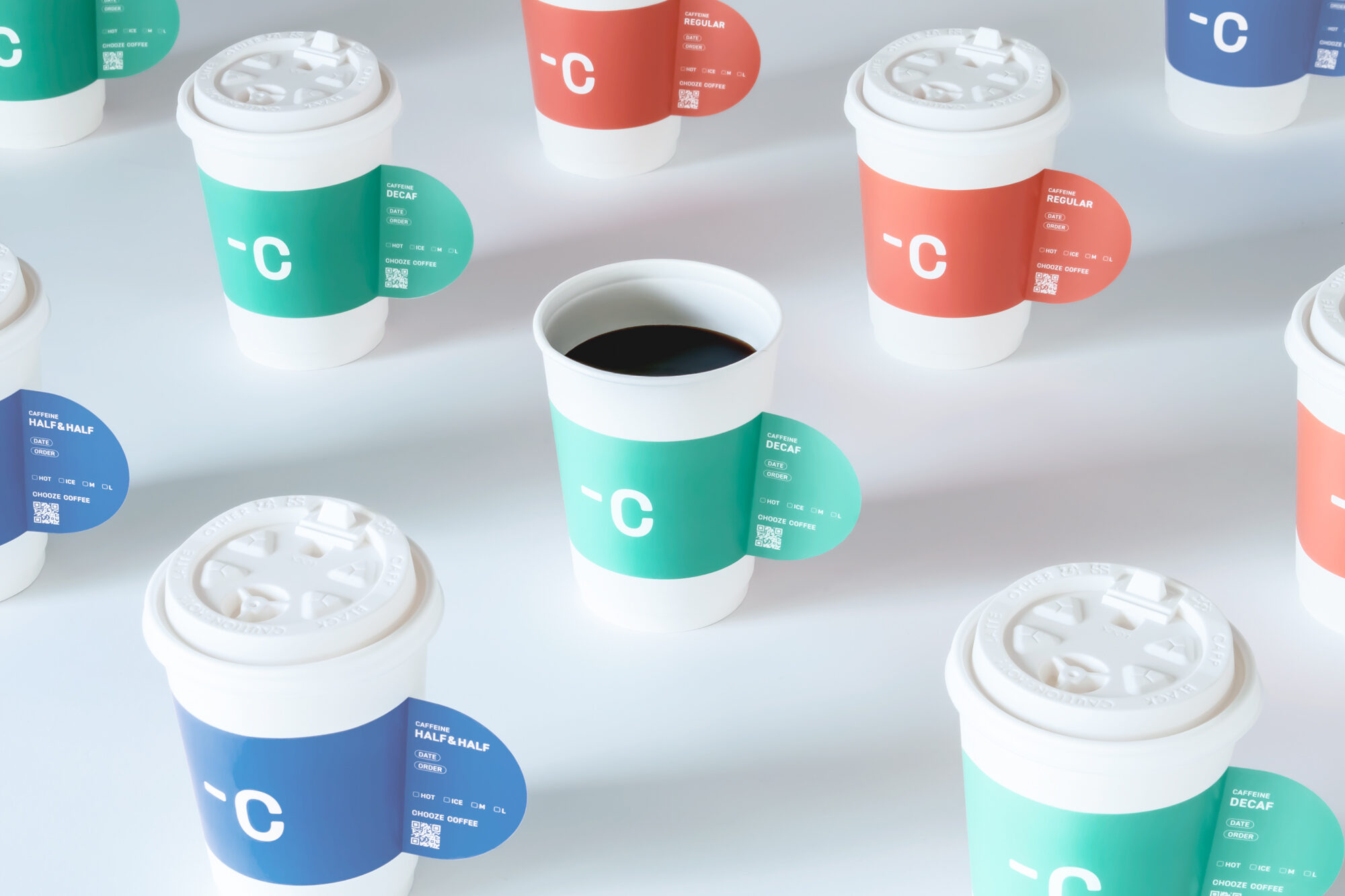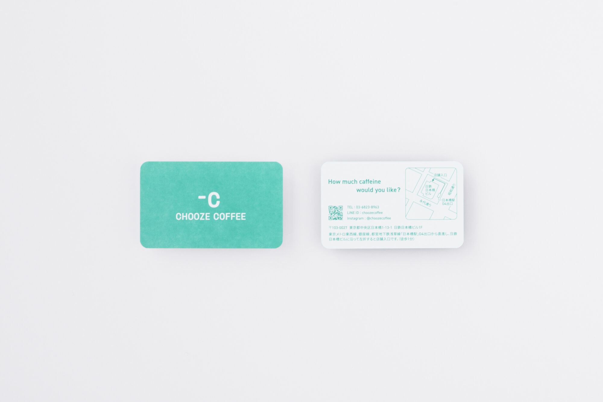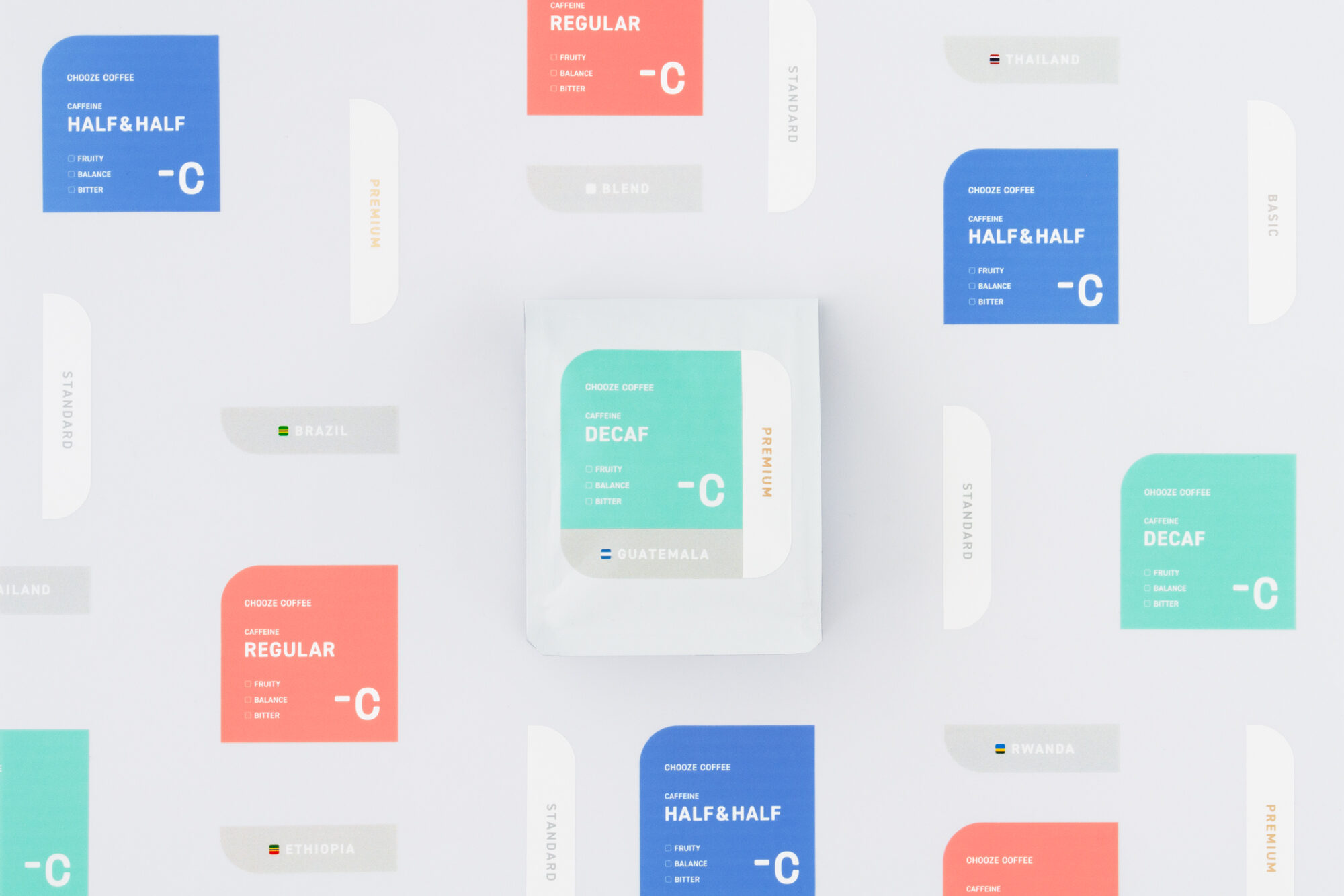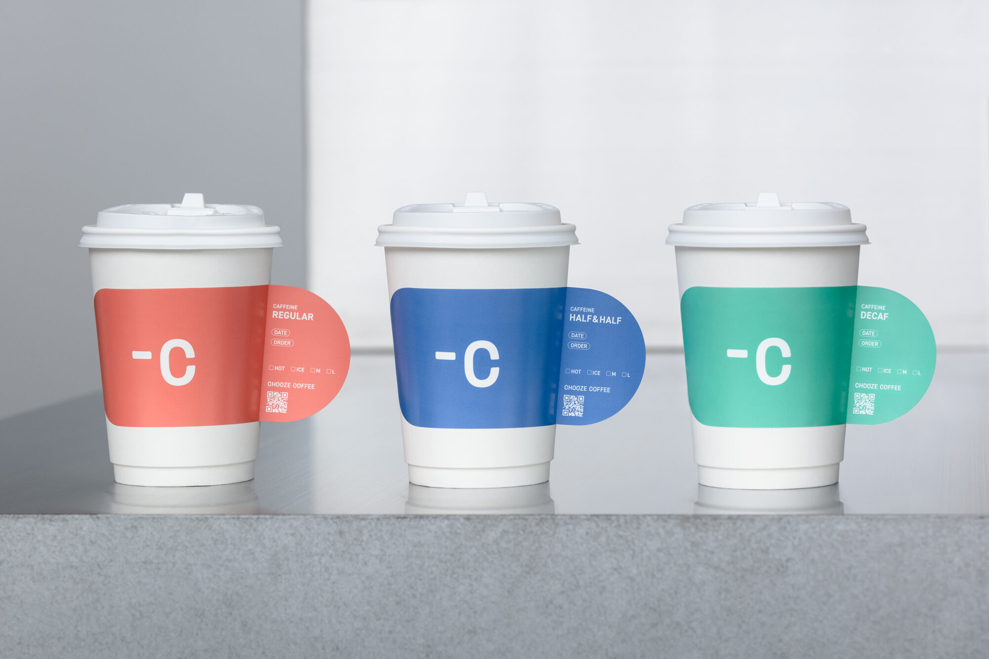 CHOOZE COFFEEは、高品質なスペシャルティコーヒーを用いたデカフェ豆を使用し、カフェイン量を選ぶ新しい体験を提案するコーヒーブランドです。ロゴは工業的で機能的な印象のフォントを起点にしています。縦長ですっきりしたアルファベットのO(オー)はコーヒー豆のようなフォルムをしています。O(オー)の一部を抜き取ることでオリジナルのC(シー)に仕立てました。既存のものから一部を抜き取ることで新しい別のものにすることを試みています。これは、コーヒー豆からカフェインを最適な方法で抜き取ることで、美味しいデカフェを完成させる工程を反映したものとなっています。記号的なロゴによって、言語の異なる文化圏においても機能することを目指しました。