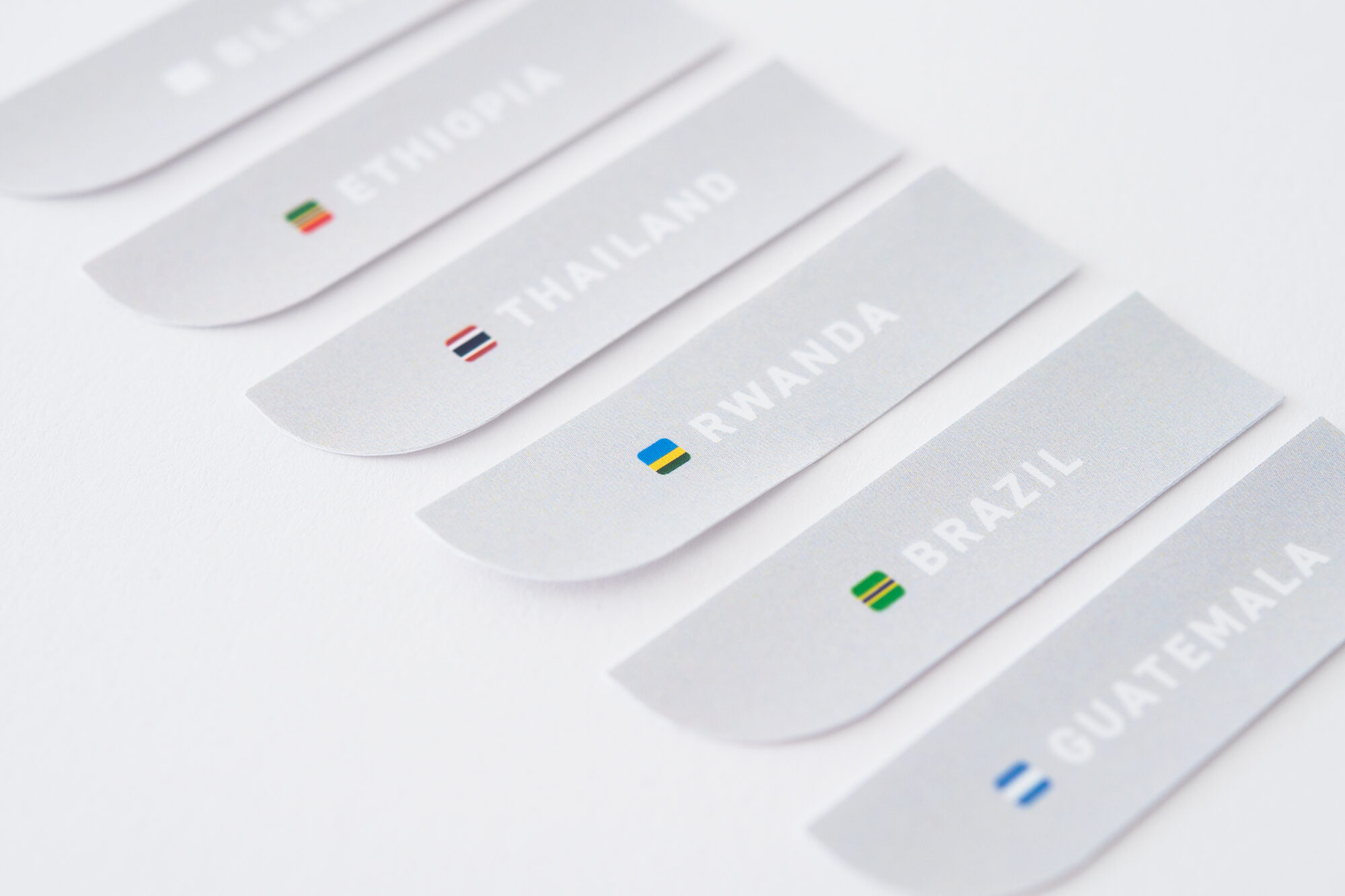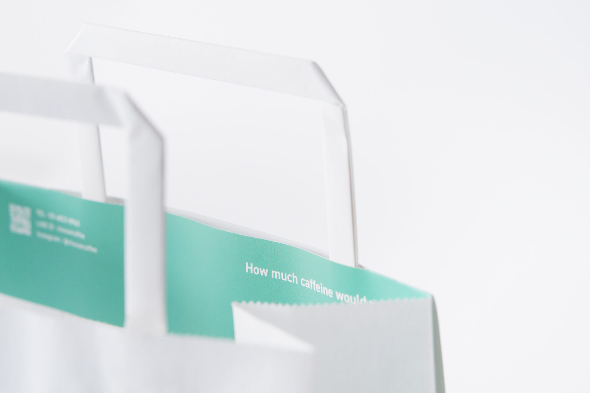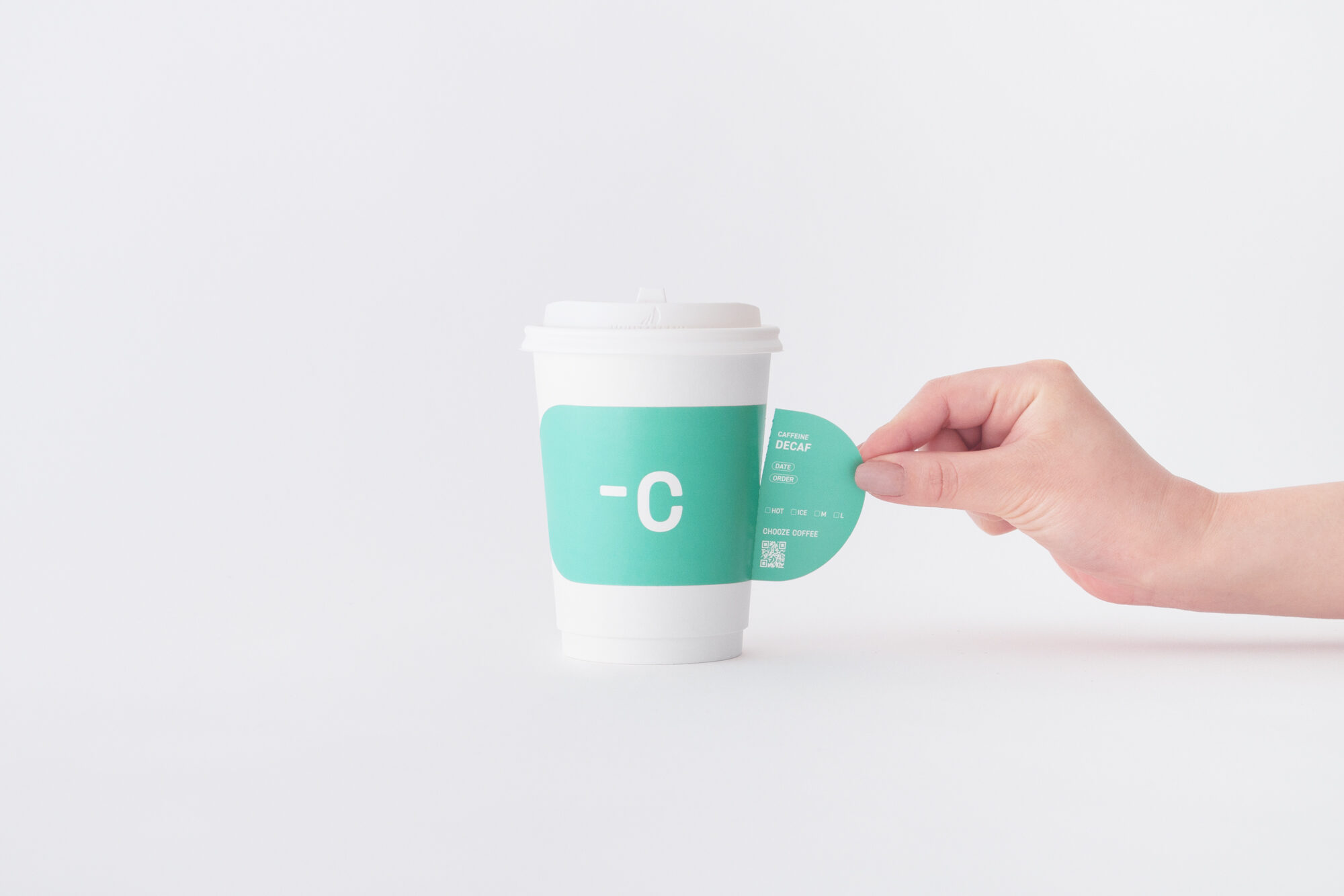 ブランドカラーは清潔感と柔らかさを備えたミントグリーンを選定しました。コーヒーカップやパッケージは、カフェイン量の違いを明確に示すカラー展開としています。コーヒーカップの「耳」のような部分は、切り取ることが出来、当日中利用可能な半券として活用できる仕組みです。また、コーヒー豆のパッケージは、3つのステッカーを組み合わせることで1つのグラフィックとして完成するようになっています。カフェイン量や産地など豊富なバリエーションに対応するためのしつらえです。