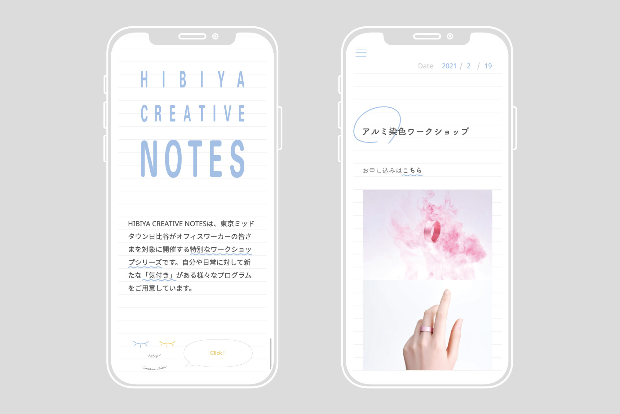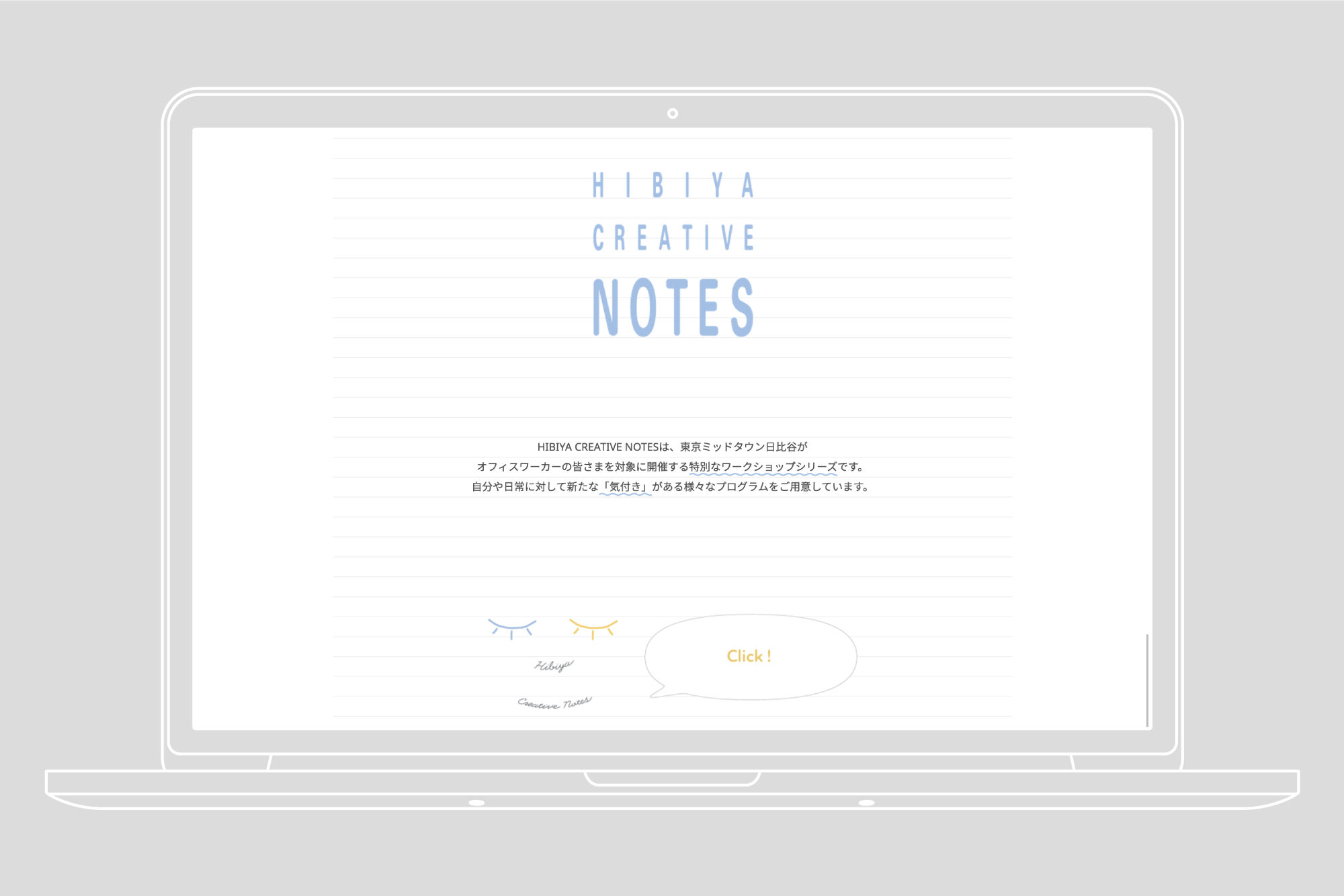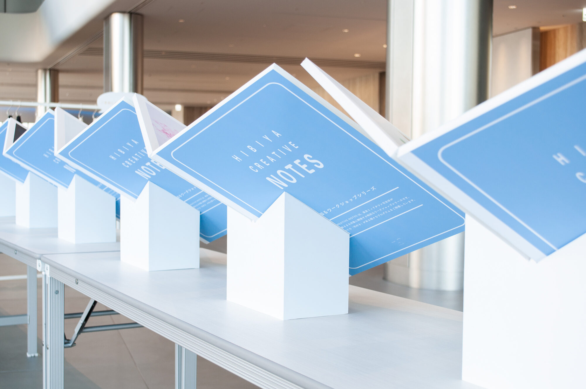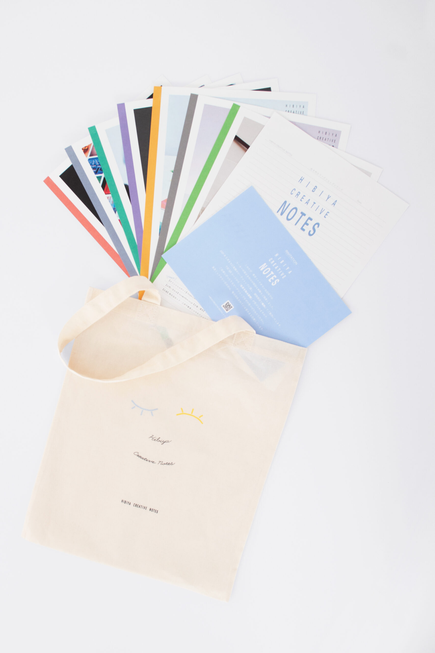 HIBIYA CREATIVE NOTESの活動を伝えるため、東京ミッドタウン日比谷のウェブサイト内にオフィシャルページを開設しました。また、そのページへの誘引のため、ノートをモティーフとしたリーフレットをトートバッグ・エコバッグに入れて配布しました。トートバッグ・エコバッグは、ワークショップ参加者にスクールバッグとして活用してもらうことを想定しています。