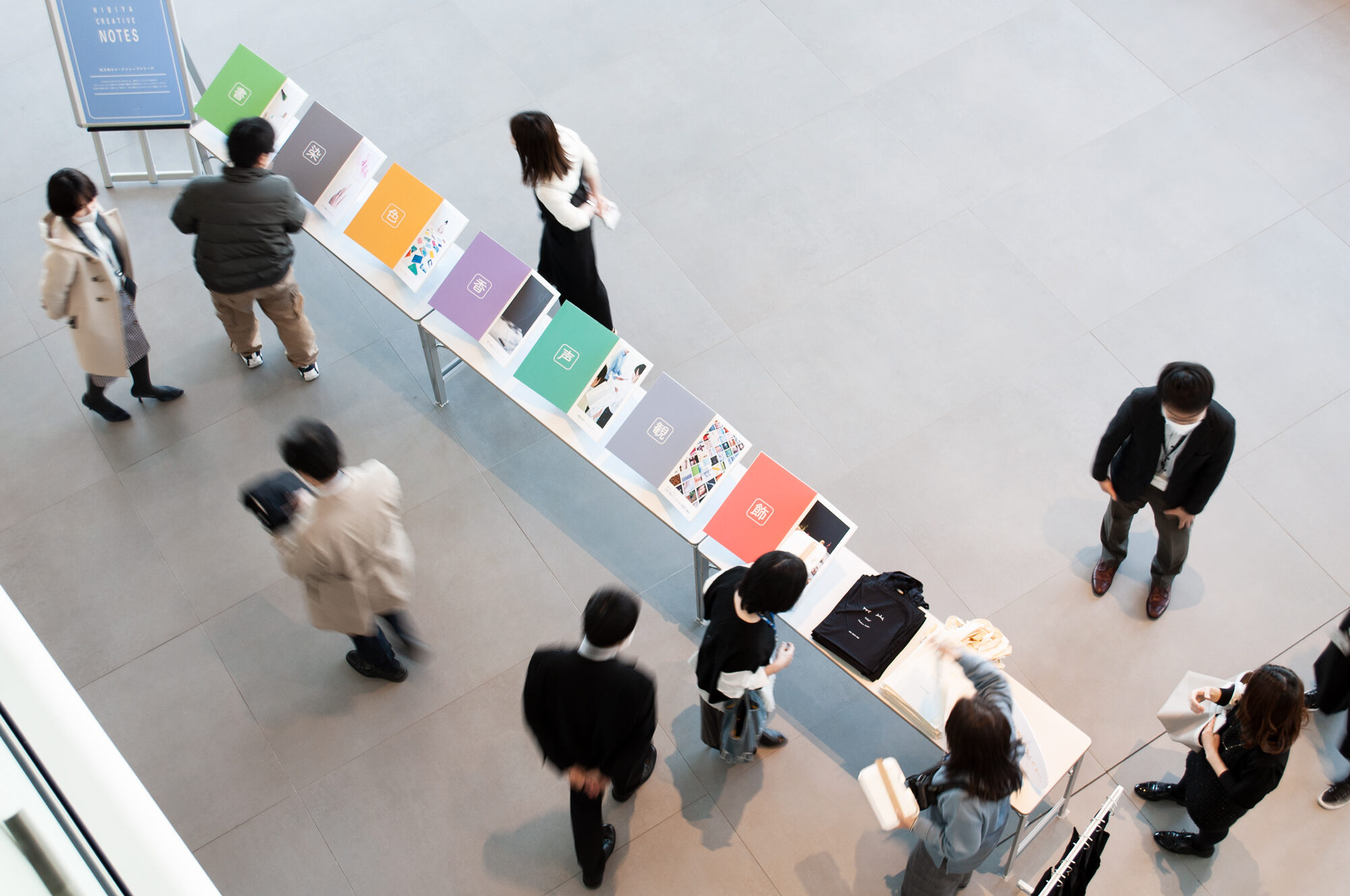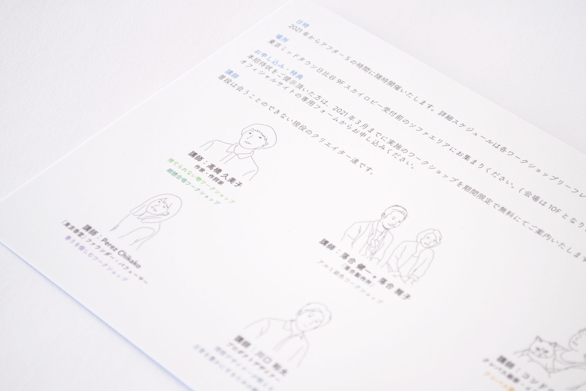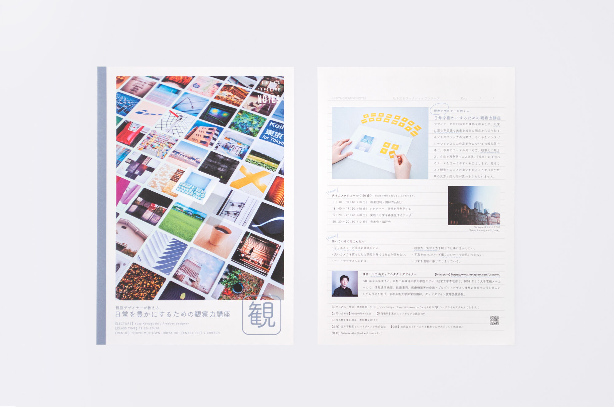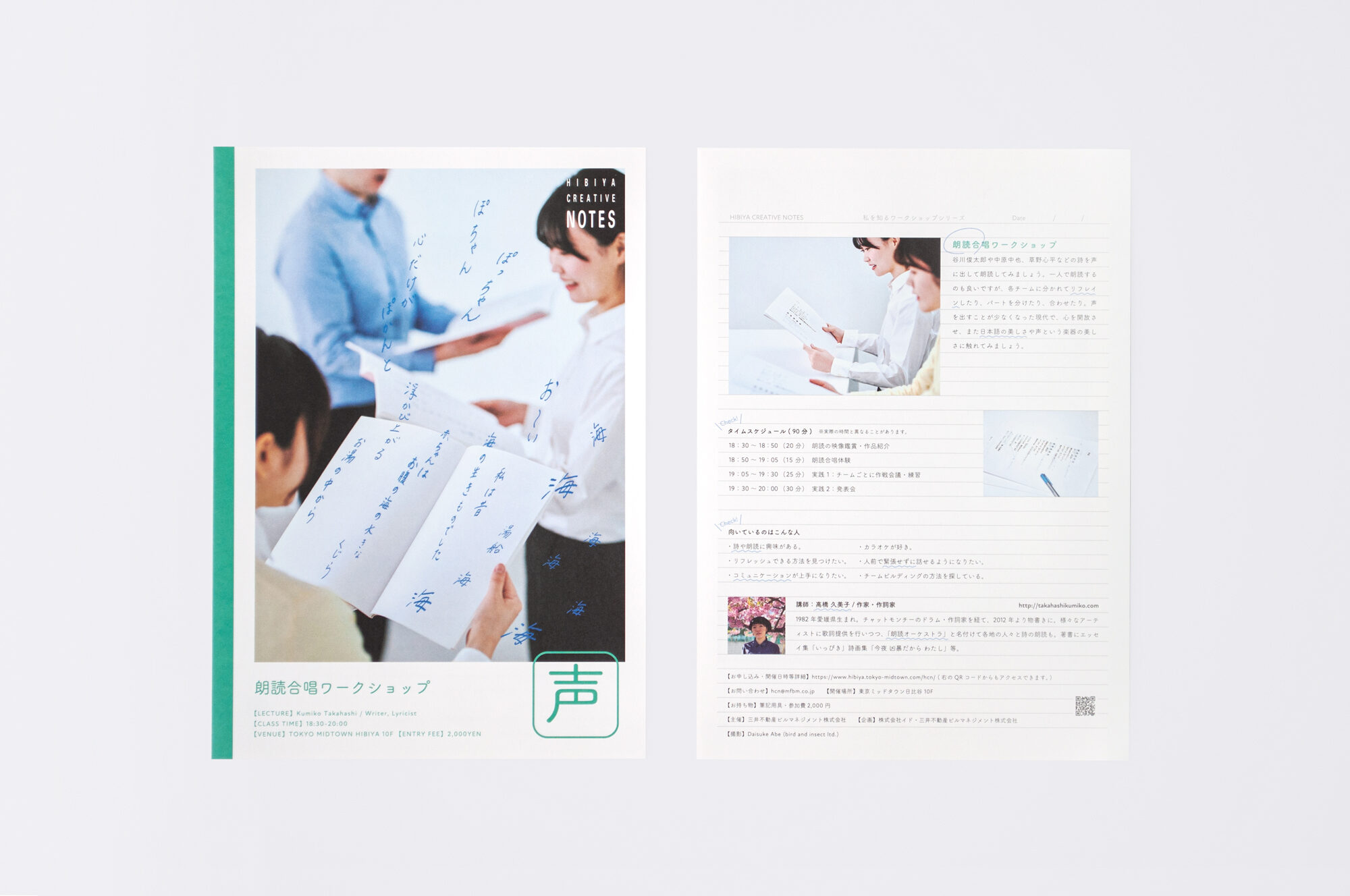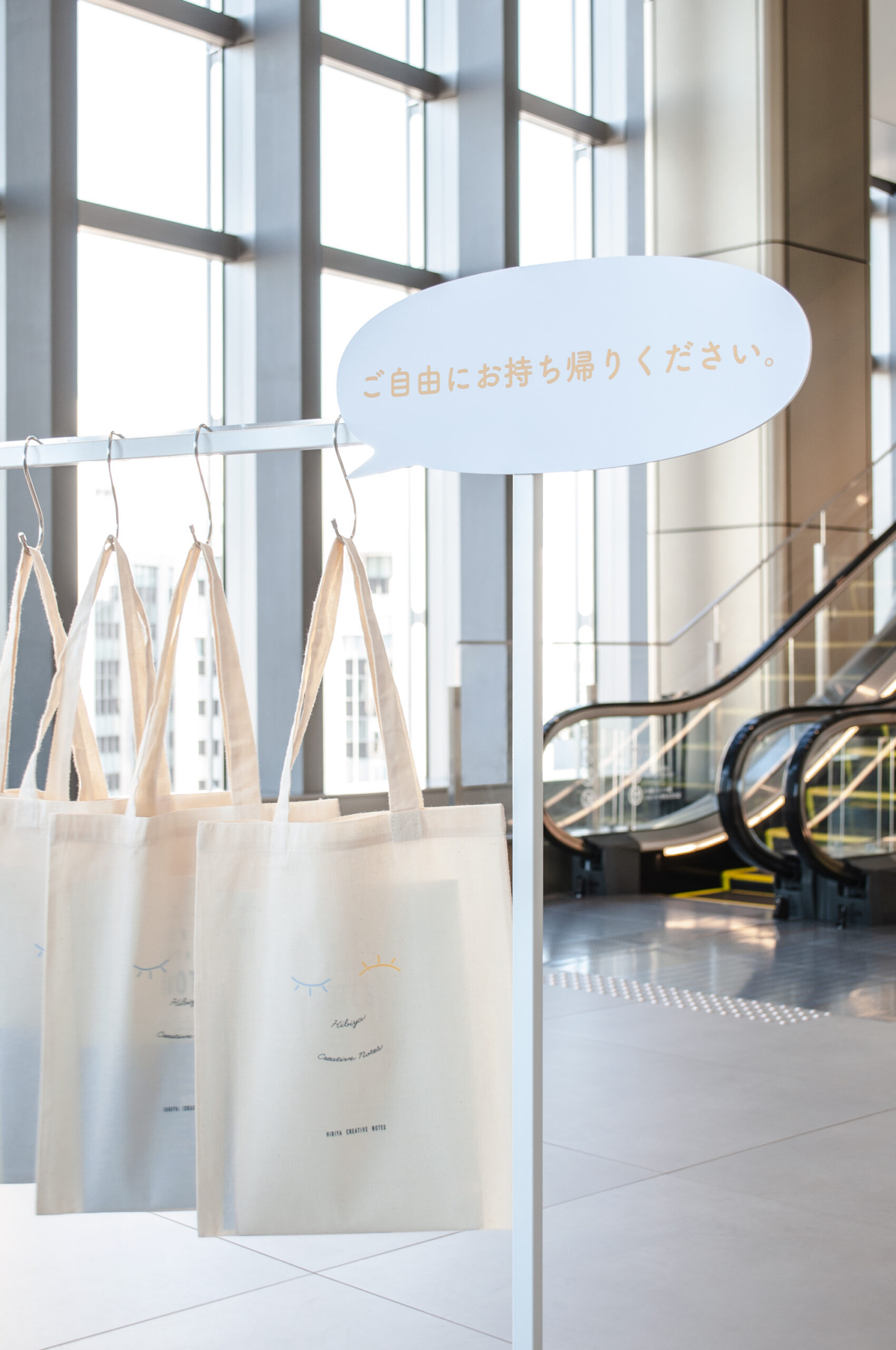 HIBIYA CREATIVE NOTESの活動を伝えるため、東京ミッドタウン日比谷のウェブサイト内にオフィシャルページを開設しました。また、そのページへの誘引のため、ノートをモティーフとしたリーフレットをトートバッグ・エコバッグに入れて配布しました。トートバッグ・エコバッグは、ワークショップ参加者にスクールバッグとして活用してもらうことを想定しています。