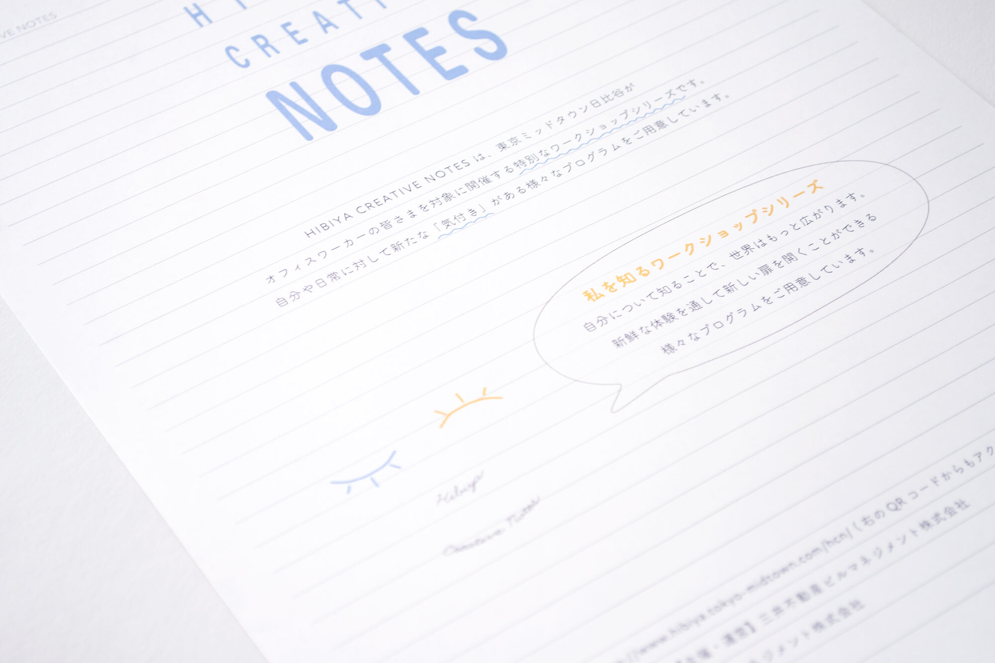HIBIYA CREATIVE NOTESは、東京ミッドタウン日比谷がオフィスワーカーを対象に開催する特別なワークショップシリーズです。最初の展開となる「私を知るワークショップシリーズ」は、知識や技術の習得を目的とするのではなく、自分や日常に対して新たに「気づく」ことを目的としたプログラムです。現役クリエイターとのコラボレーションによって、新しいネットワーキングの場を創ることを目標としています。