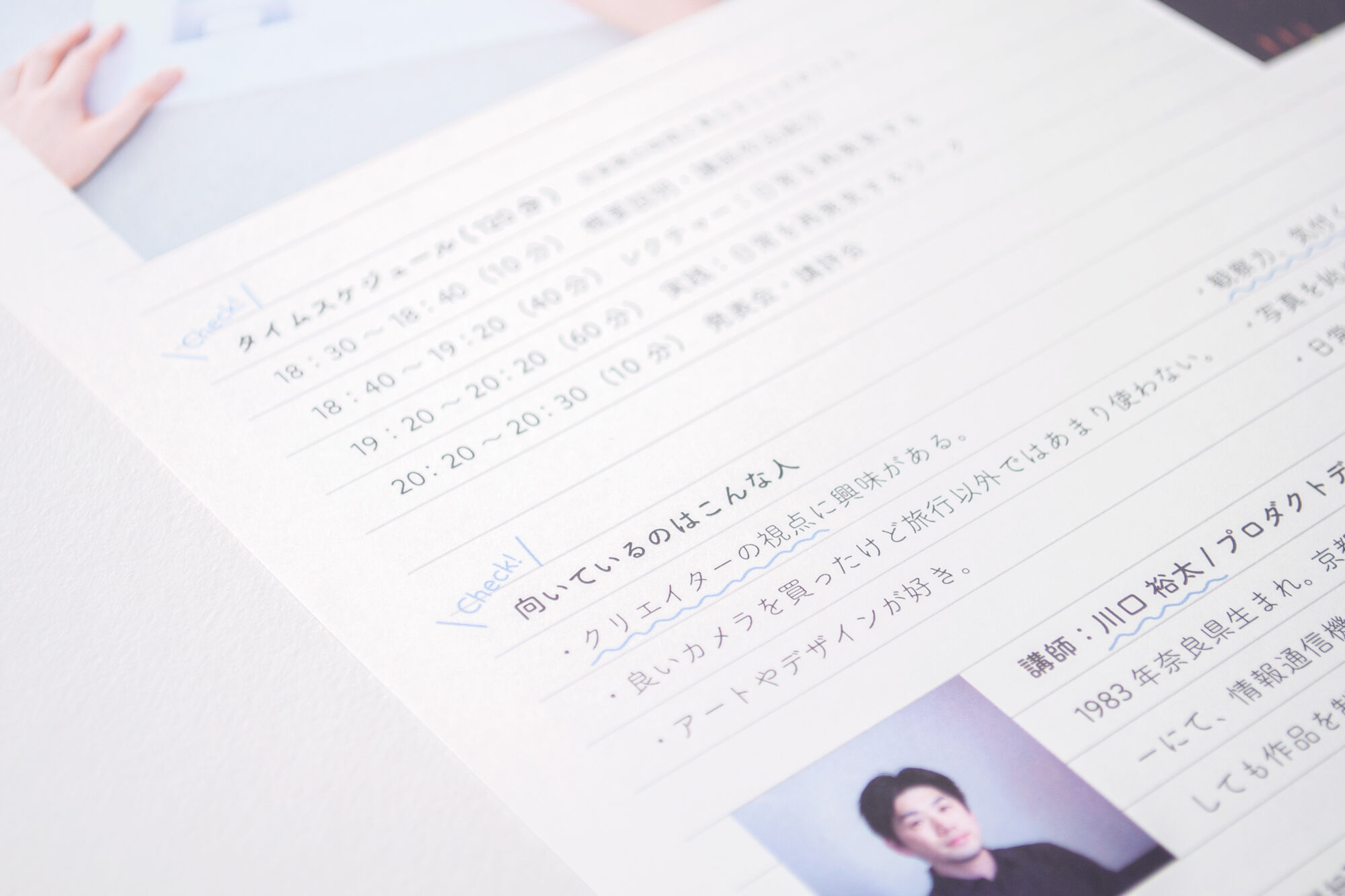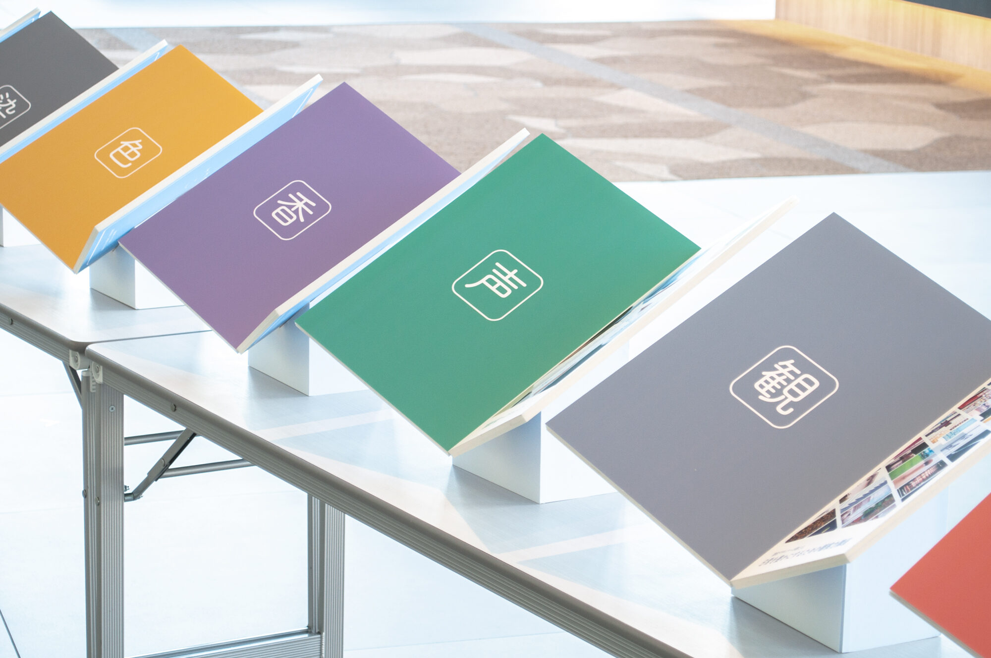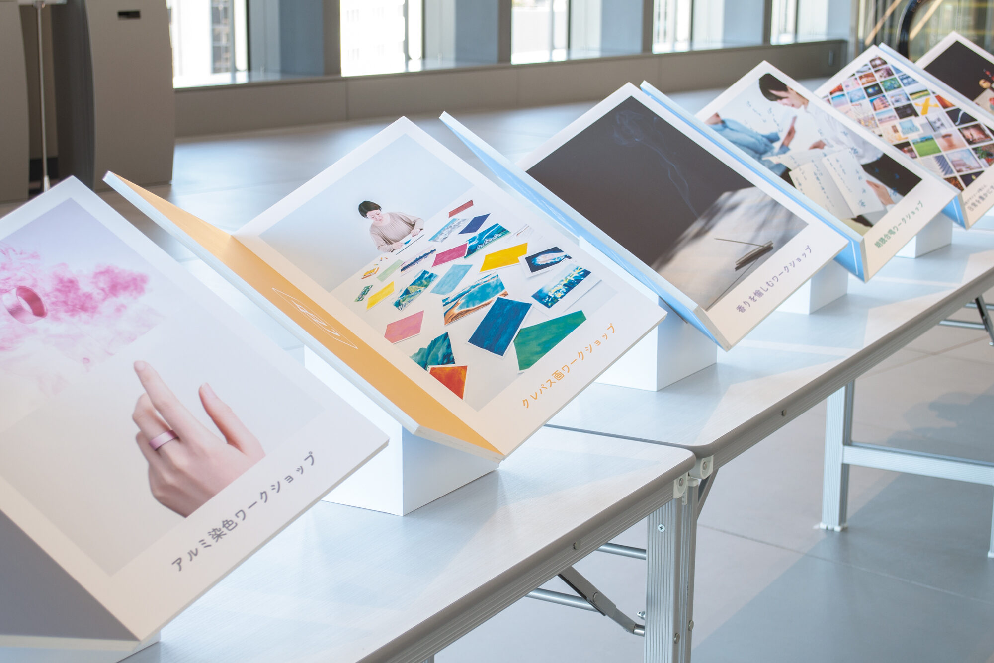 配布時には、ノートのように開いた形のポスターを並べました。各ワークショップの特色を伝えるため、写真・色・漢字を象徴的に用いています。説明的になり過ぎない「気付き」のあるPR空間になっています。ロゴマークは、フォントを縦に少し引き延ばすことで、成長していくイメージを表現し、角を丸くすることで柔らかな印象に仕上げました。登場するキャラクターの目は、眠っている目と笑っている目が同じ形状の反転で構成されています。これは少し視点を変えるだけで、世界は違って見えるという、活動の根底にある考えを反映したものとなっています。