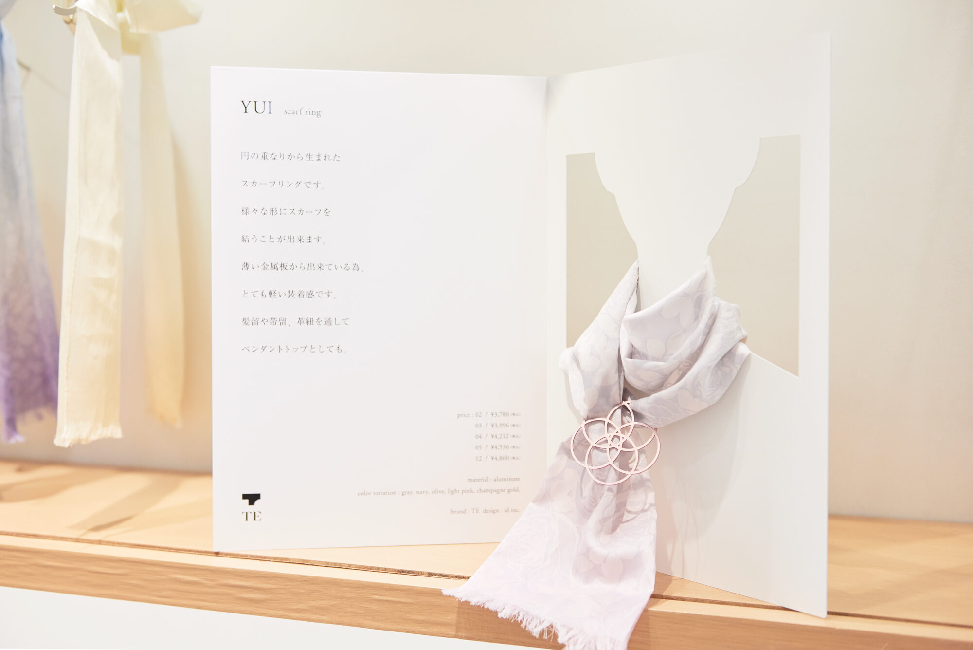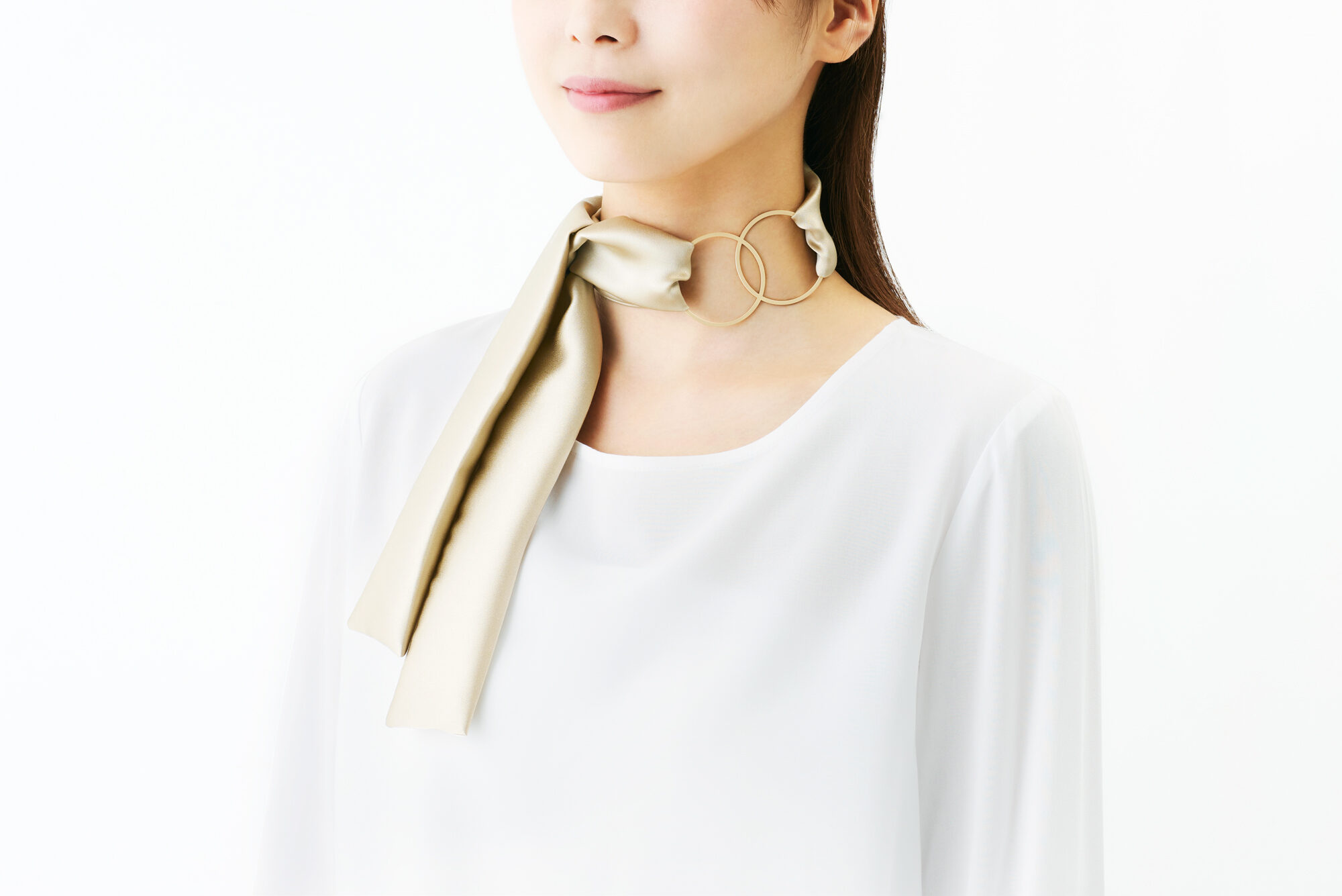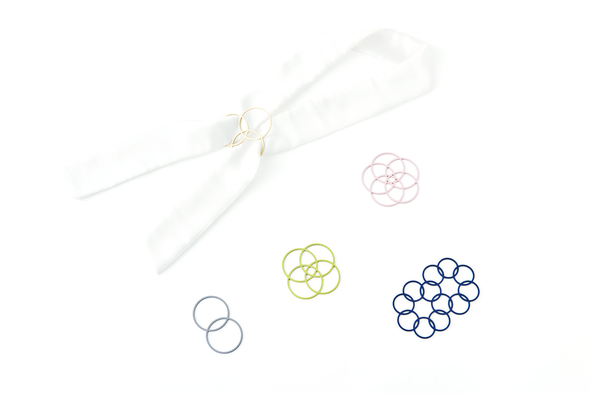 円の重なりから生まれたスカーフリング。様々な形にスカーフを結うことができます。薄い金属板から出来ている為、とても軽い装着感です。また、髪留や帯留としても使うことができます。