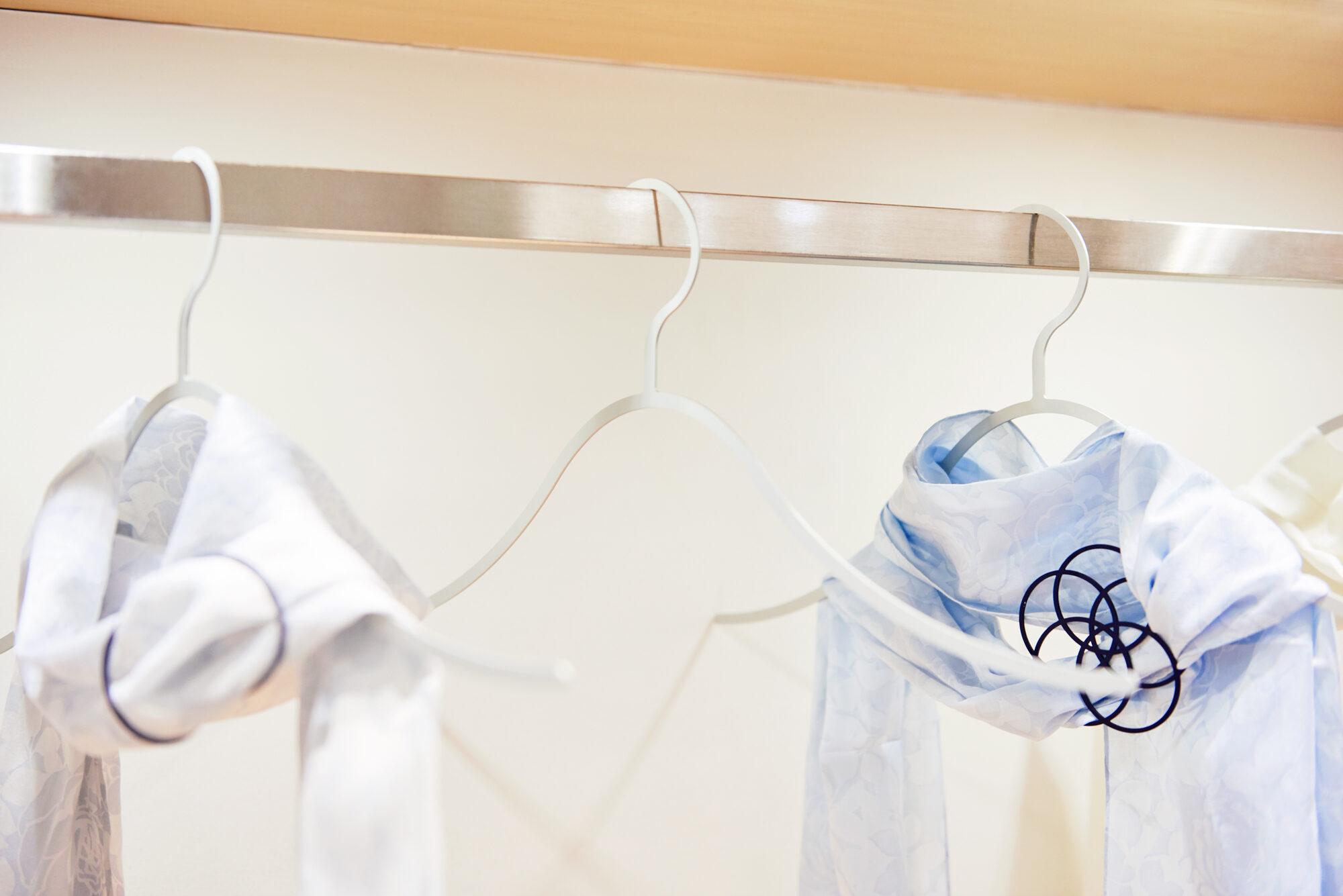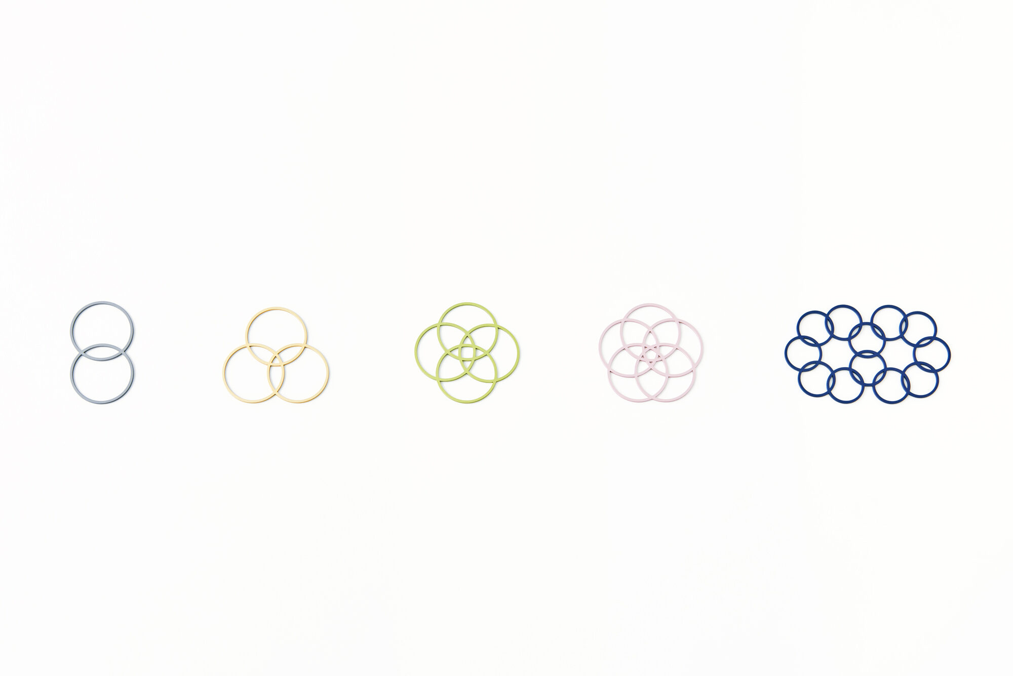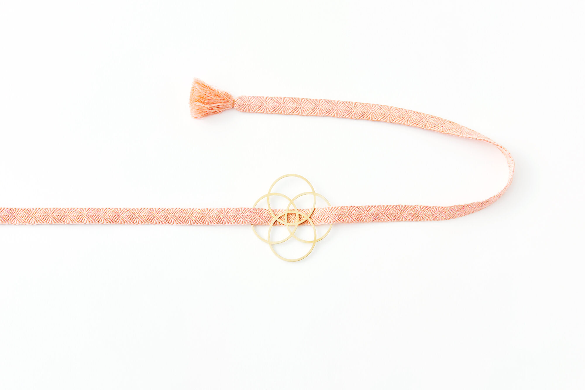 円の重なりから生まれたスカーフリング。様々な形にスカーフを結うことができます。薄い金属板から出来ている為、とても軽い装着感です。また、髪留や帯留としても使うことができます。