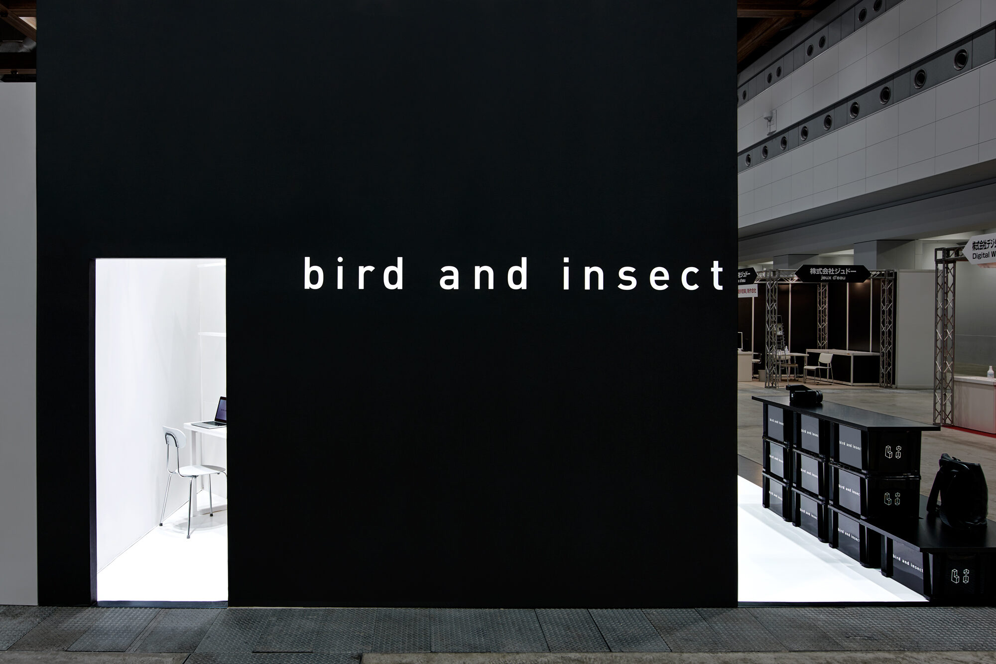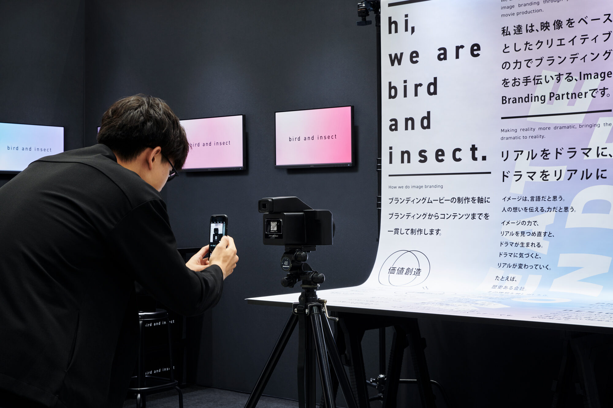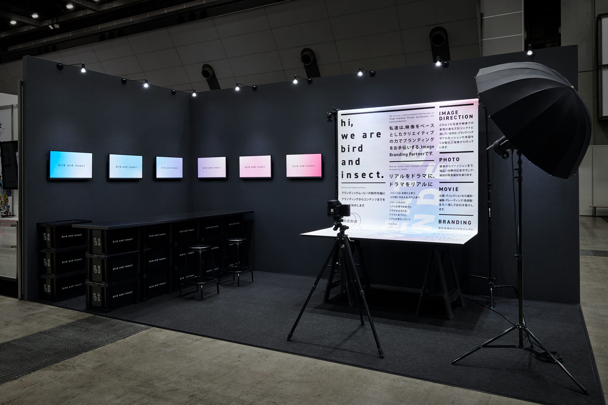 bird and insectの魅力は、専門性の高いメンバーによって生み出される高品質なアウトプットです。この魅力を伝えるために、プロフェッショナルの現場である撮影スタジオをブース内に出現させました。黒を効果的に用いて、周囲の空間からブースを切り取ることで、モニターへの誘目性を高めました。余計な要素を排除することで、ビジュアルの美しさが引き立ちます。ブース内では、撮影機材をレイアウトすることでスタジオの空気感を再現しました。これにより、レイアウト変更が容易になり、状況に応じて空間を変化させることができます。機材の特徴を活かしたユニークな見せ方で、的確に情報を伝えます。オリジナルのコンテナボックスは、ブースの形状や規模に応じて自由に組み替えることができます。これは会期中の備品の収納や搬入出時にも役立ちます。2020年から出展を続けているCONTENT TOKYOでの展示は、フィードバックをいただくことでより良い空間に進化を続けています。撮影機材とコンテナボックスという使い捨てない什器によって、継続的な出展を支えています。