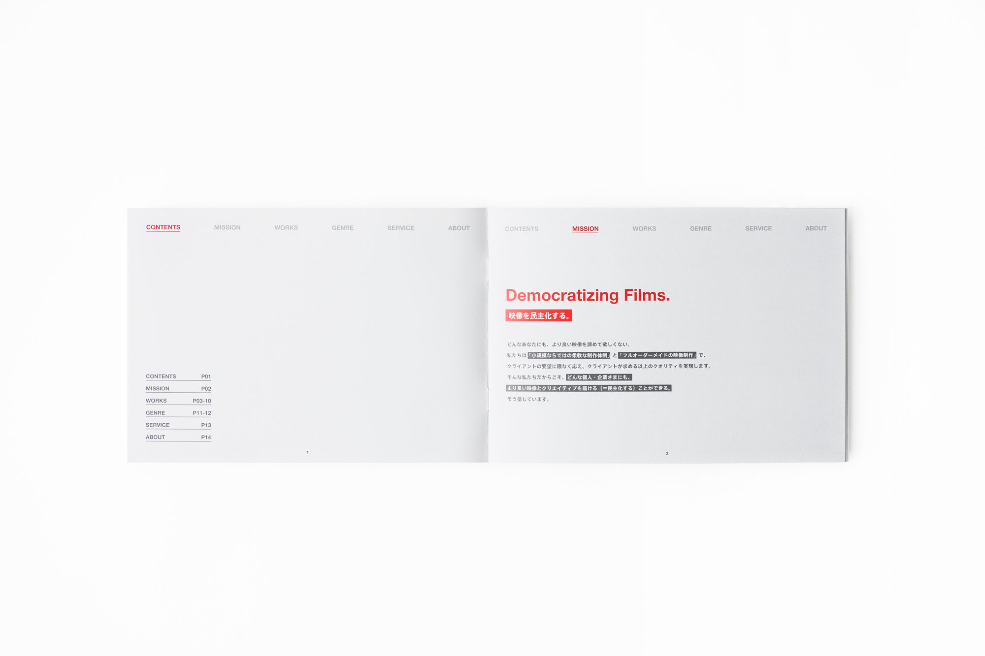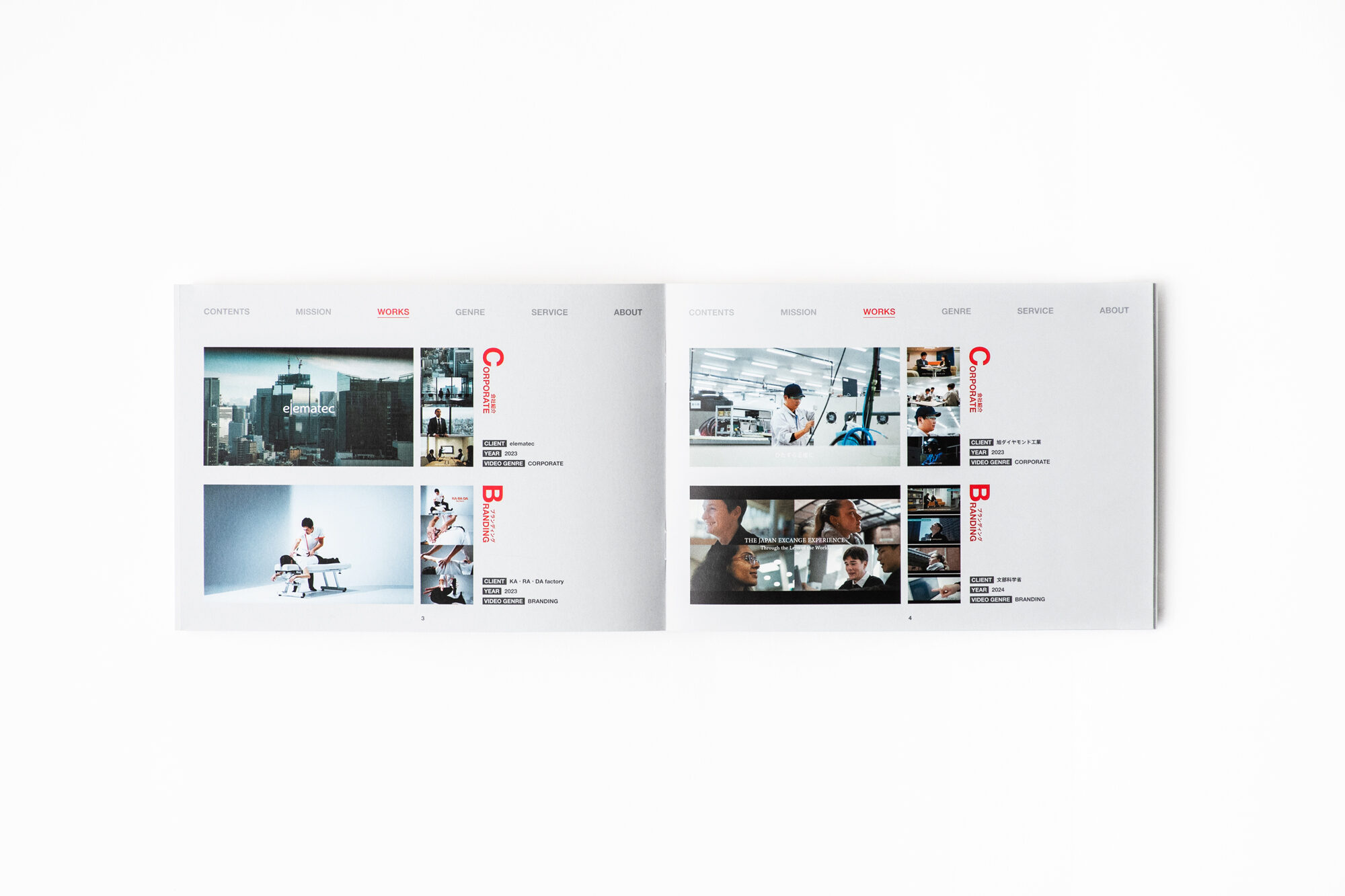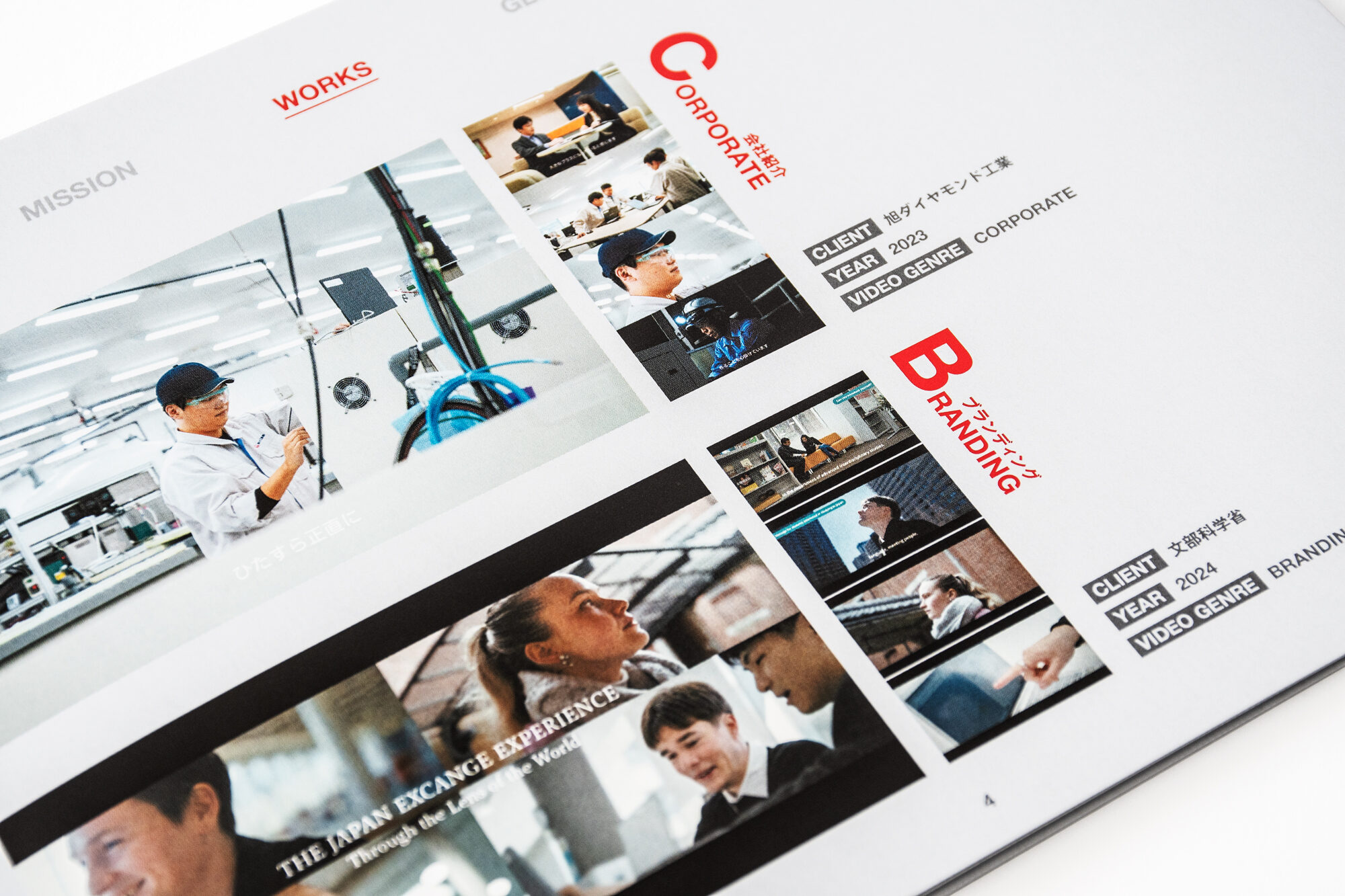 リーフレットもシルバー系統の色味で揃えました。表紙は、新しいプロジェクトと映像の光を想起させる余白を矩形のグラデーションで表現しました。中頁では、いくつもの魅力的なシーンがある映像を印刷物で表現するため、複数枚の写真を並べて構成しました。展示ブースデザインとグラフィックデザインを同じ視点で捉えることにより、魅力を鮮明に伝えます。