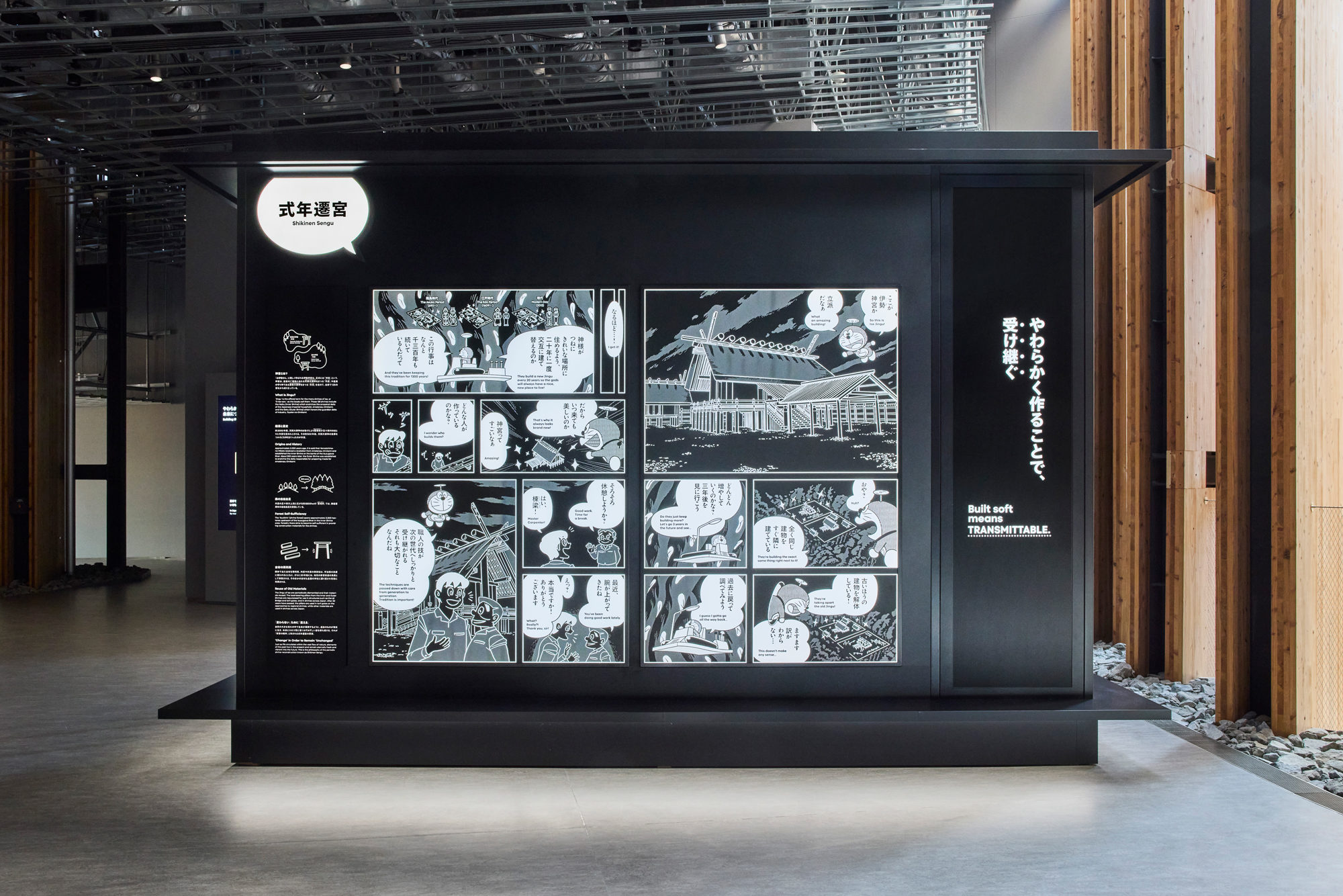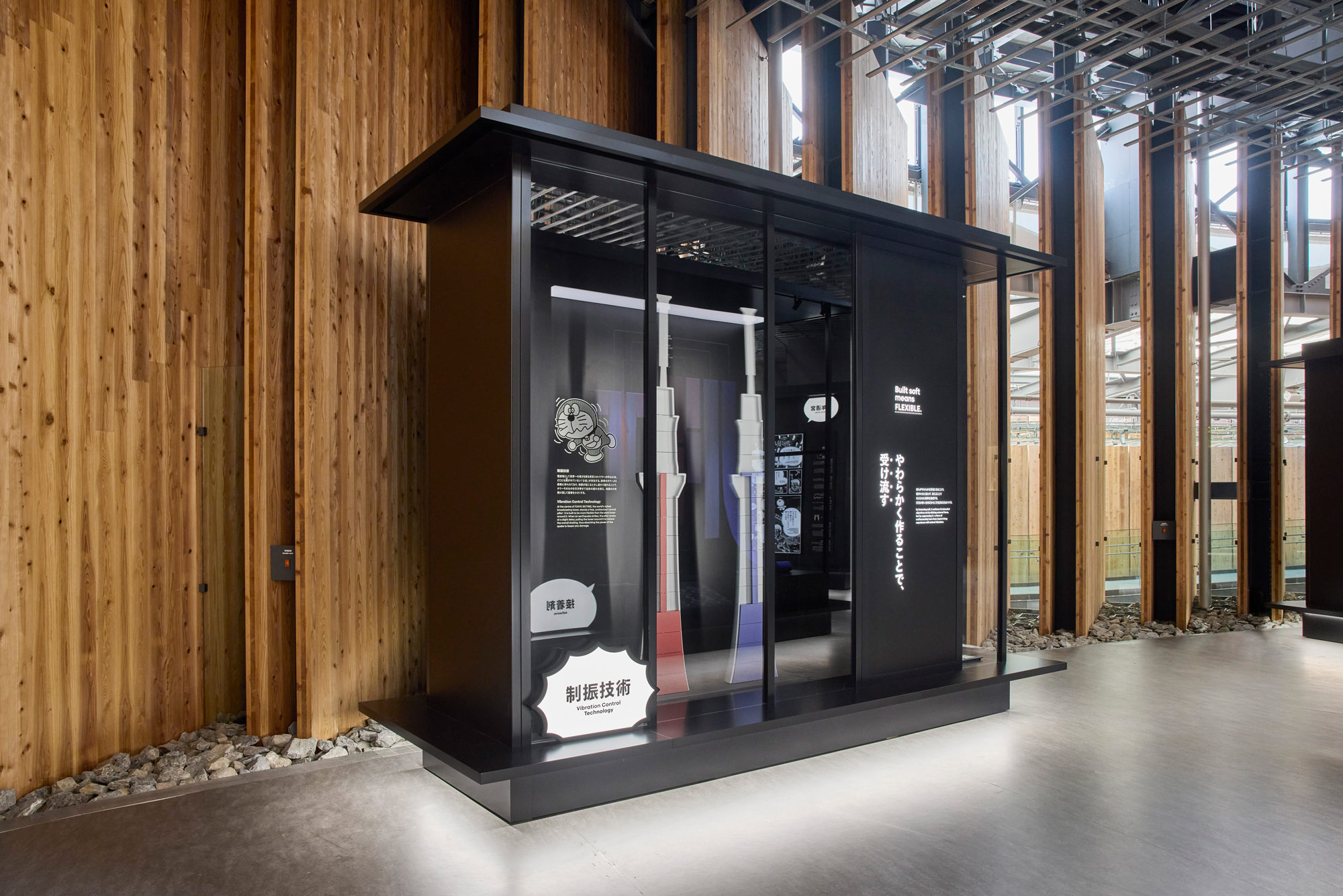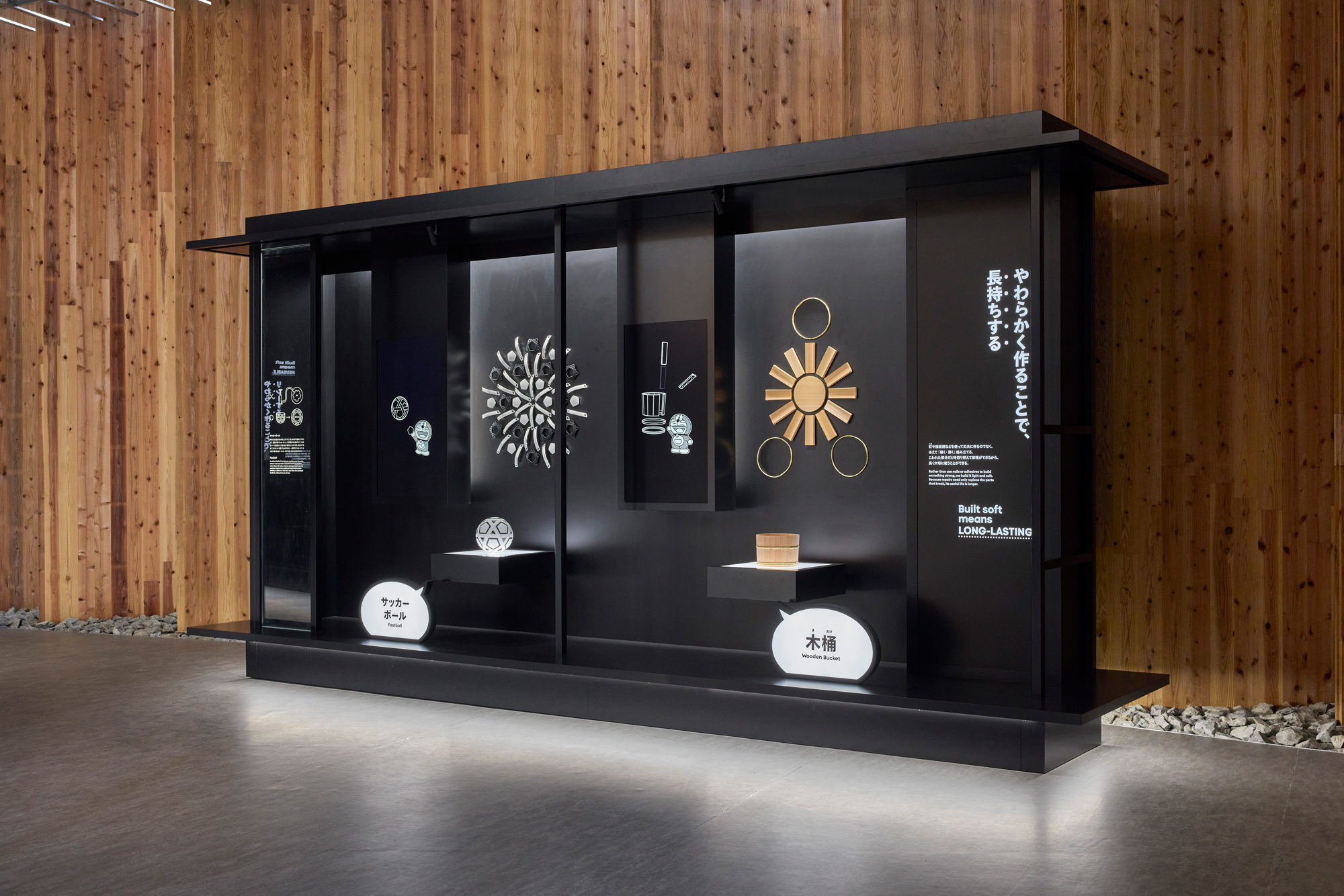 ファクトリーエリアに「ドラえもん」が登場! ⽇本ならではの「循環型ものづくり」を物語る様々な技術展⽰を解説。⽇本館「ファクトリーエリア」では、数百年以上前から現代に⾄るまで、⽇本のものづくりが“やわらかい”構造を志向し、資源や素材の「循環」という発想を強く意識することにより培ってきた「循環型ものづくり⽂化」を様々な製品や技術の展⽰を通して紹介します。展⽰エリアでは、8つの切り⼝で、“やわらかく作る”という⽇本のものづくりの特徴的な⼿法を伝統的な取組と最先端の技術での活⽤を対⽐しながら紹介します。
