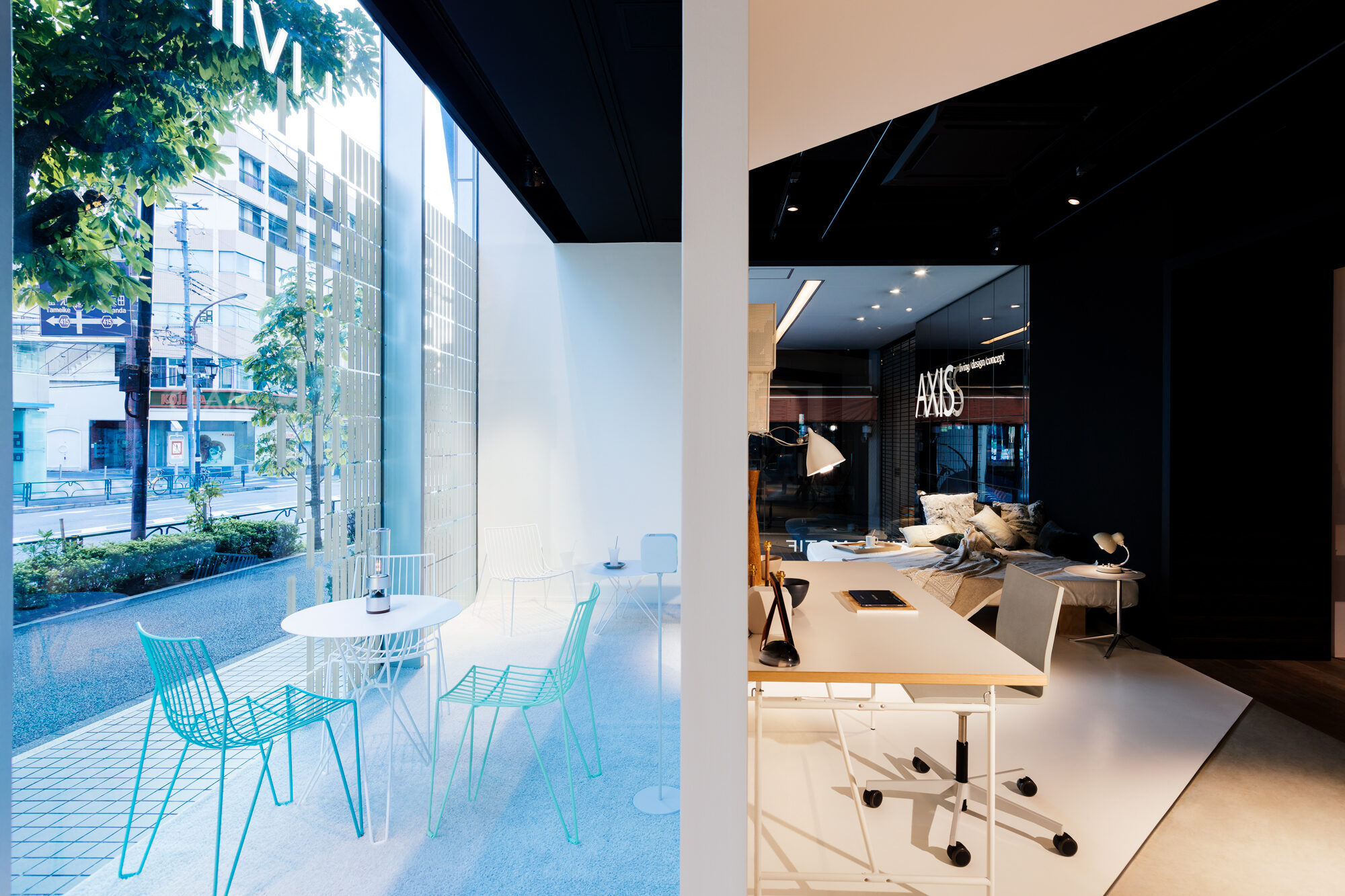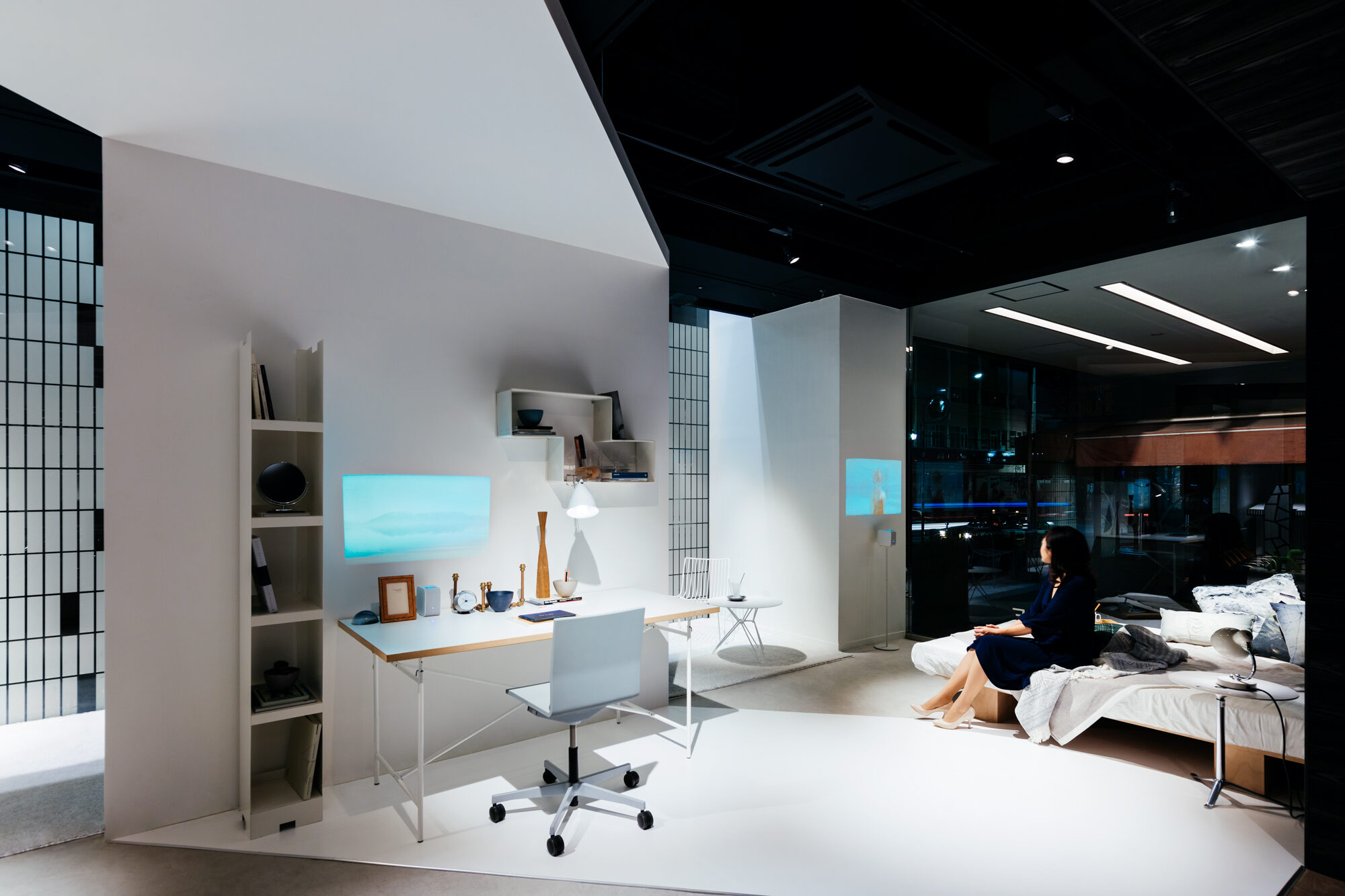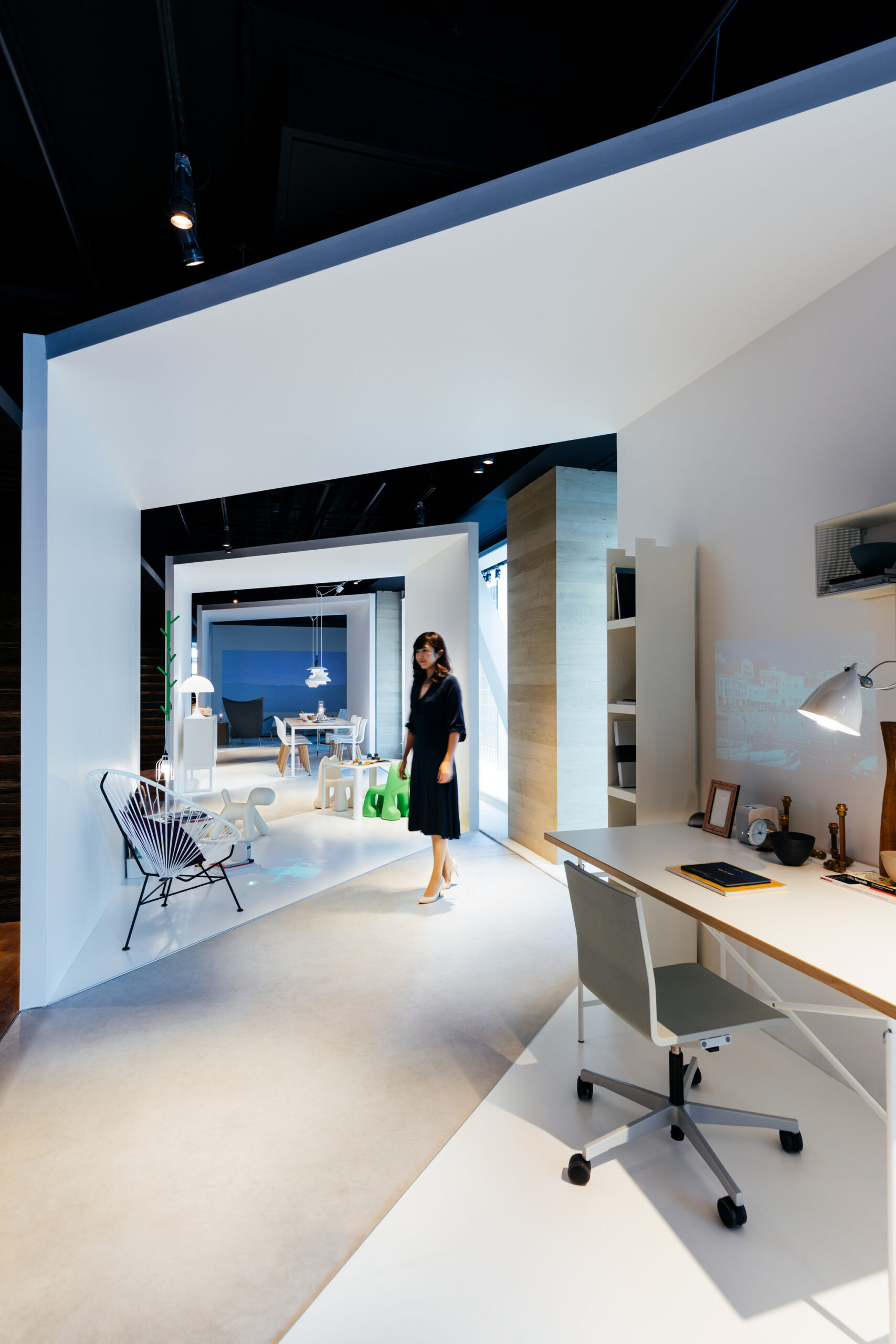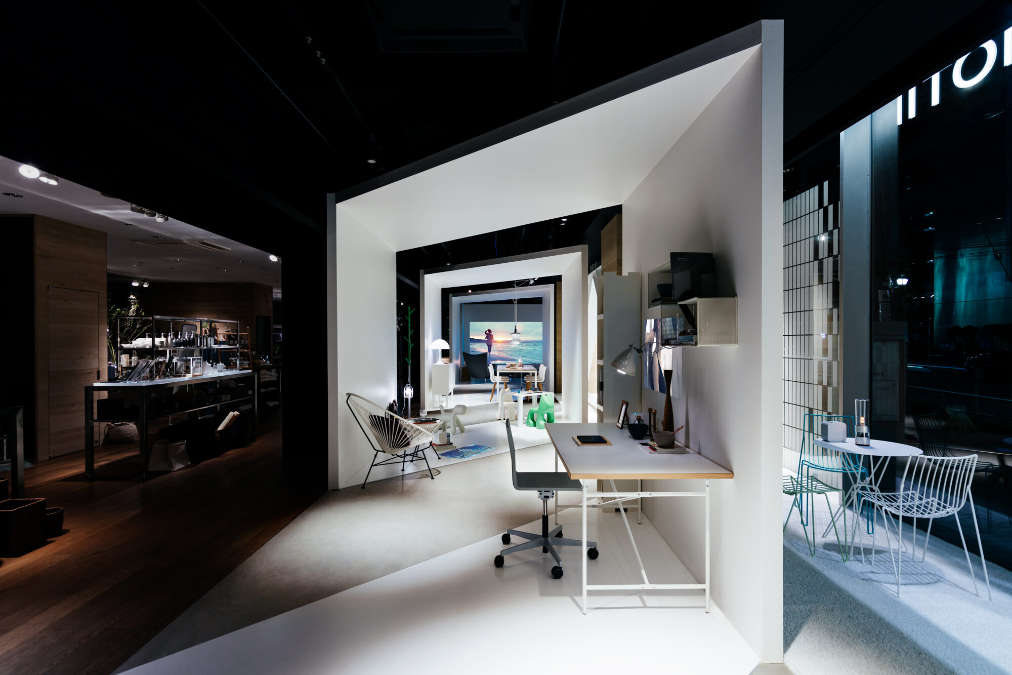 インテリアショップであるLIVING MOTIFで行われる展覧会であることから、家具との共演の背景となる 「白」の空間を考えました。 「Life Space UX」のプロダクトは、空間に溶け込みながらも、生活行為や、場と人を途切れなく繋ぐ、 可能性に満ちたものであると感じられます。その魅力を体現するため、床、壁、天井がシームレスな空間を 形にしました。 「白」の空間は、大きく緩やかなループ形状である為、動線の自由度が高く、店舗のどこからでも 展覧会場へ立ち寄ってもらうことが出来ます。ファサードは既存の外装タイルのパターンを用いて、 大きなウィンドウを覆い、適切な明るさとなるよう工夫しました。