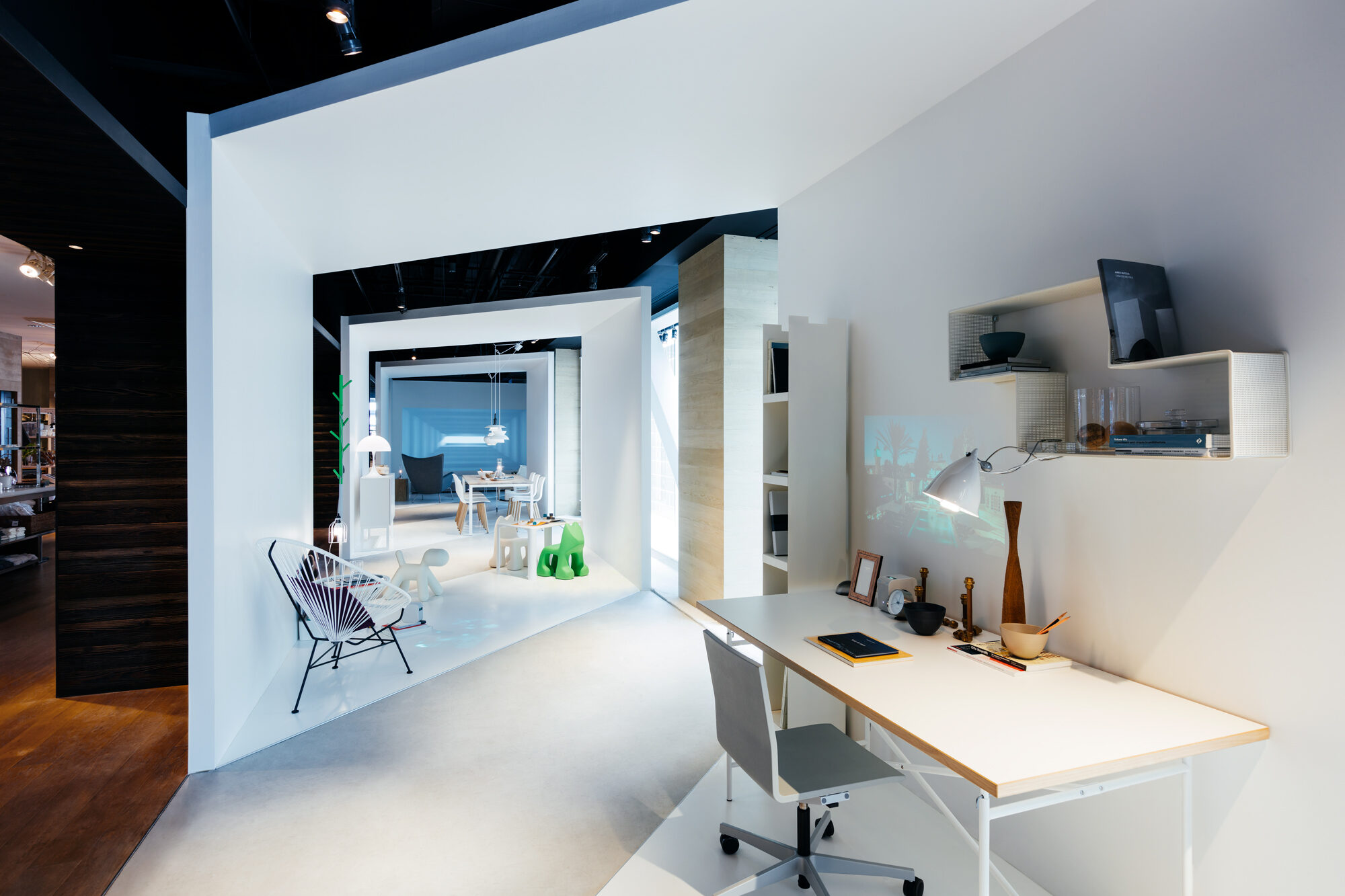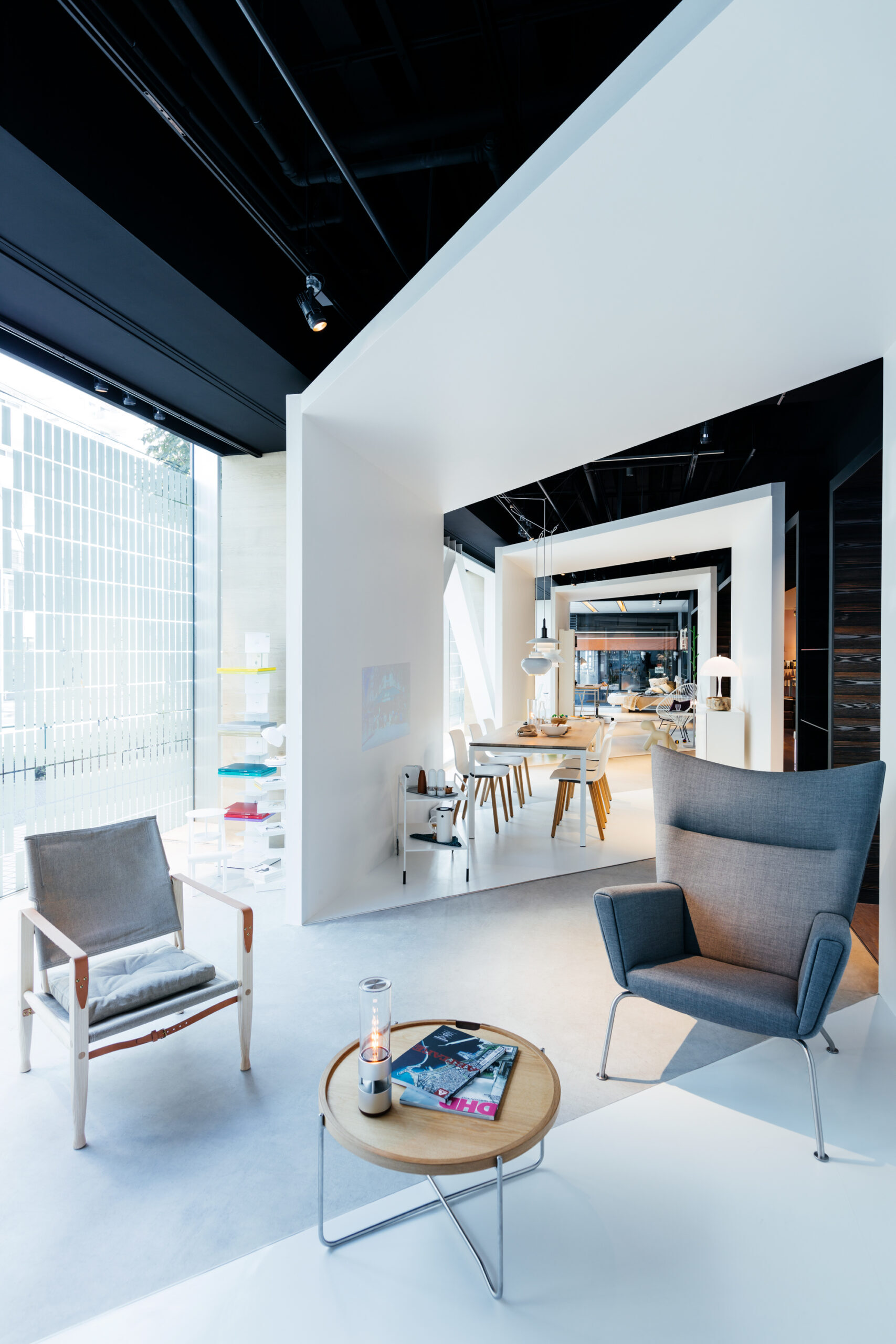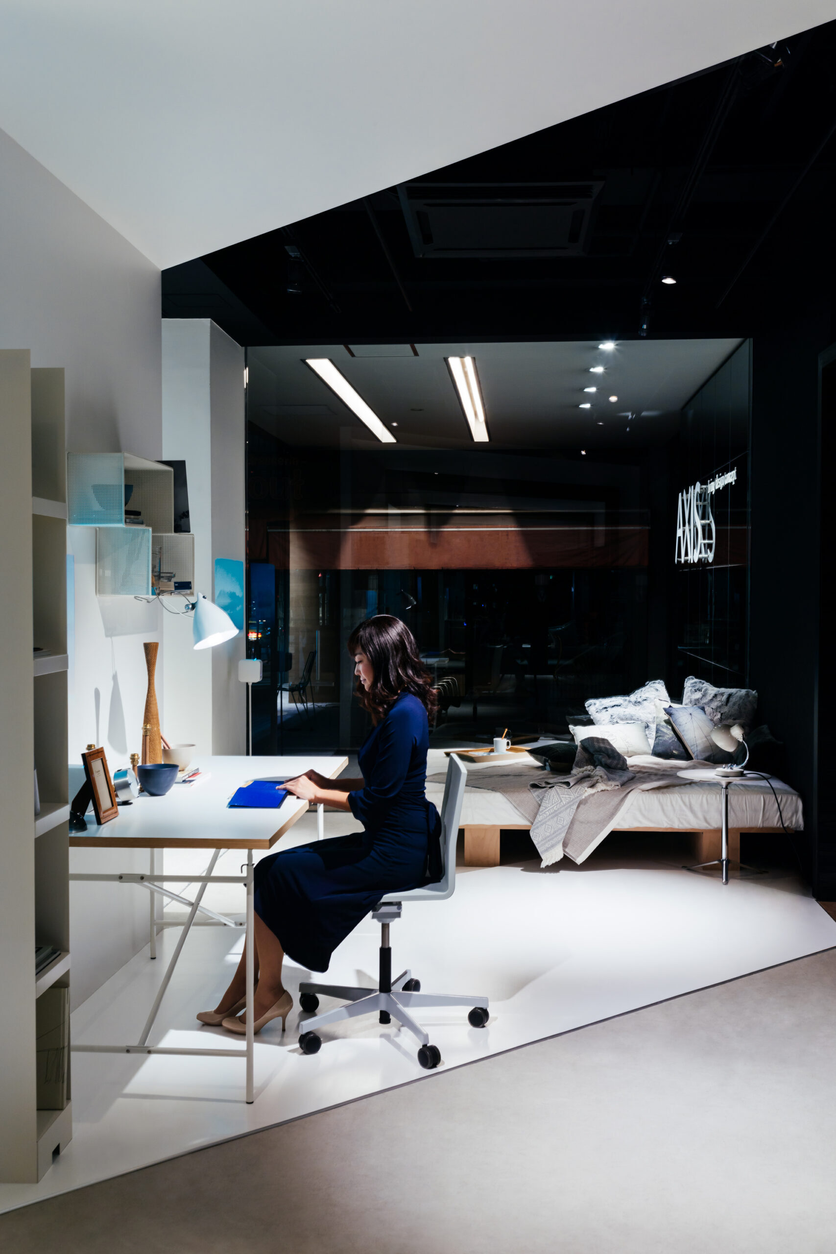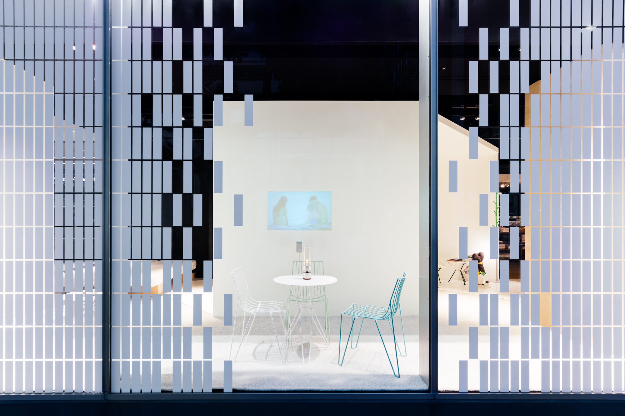 インテリアショップであるLIVING MOTIFで行われる展覧会であることから、家具との共演の背景となる 「白」の空間を考えました。 「Life Space UX」のプロダクトは、空間に溶け込みながらも、生活行為や、場と人を途切れなく繋ぐ、 可能性に満ちたものであると感じられます。その魅力を体現するため、床、壁、天井がシームレスな空間を 形にしました。 「白」の空間は、大きく緩やかなループ形状である為、動線の自由度が高く、店舗のどこからでも 展覧会場へ立ち寄ってもらうことが出来ます。ファサードは既存の外装タイルのパターンを用いて、 大きなウィンドウを覆い、適切な明るさとなるよう工夫しました。