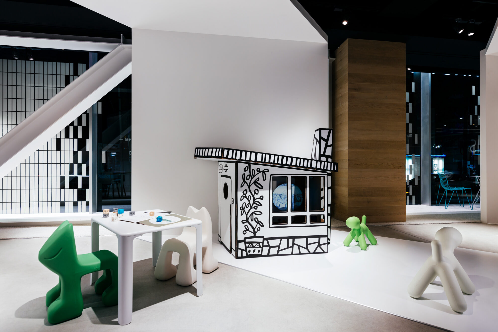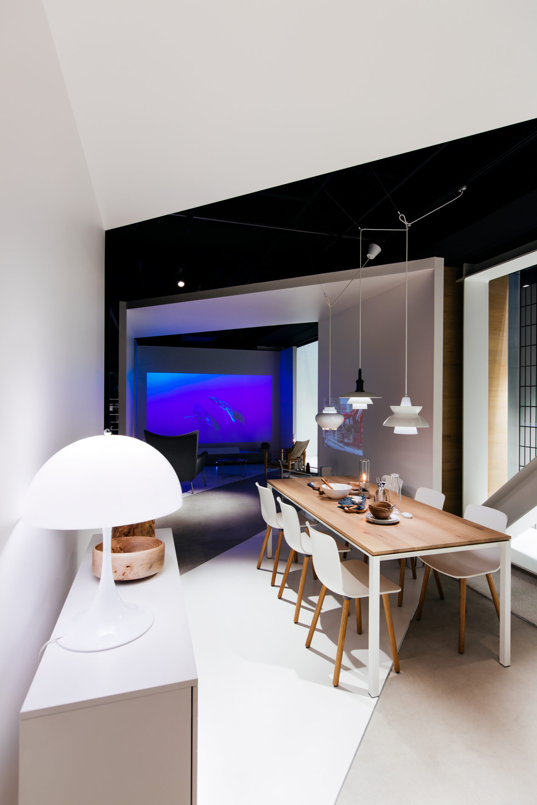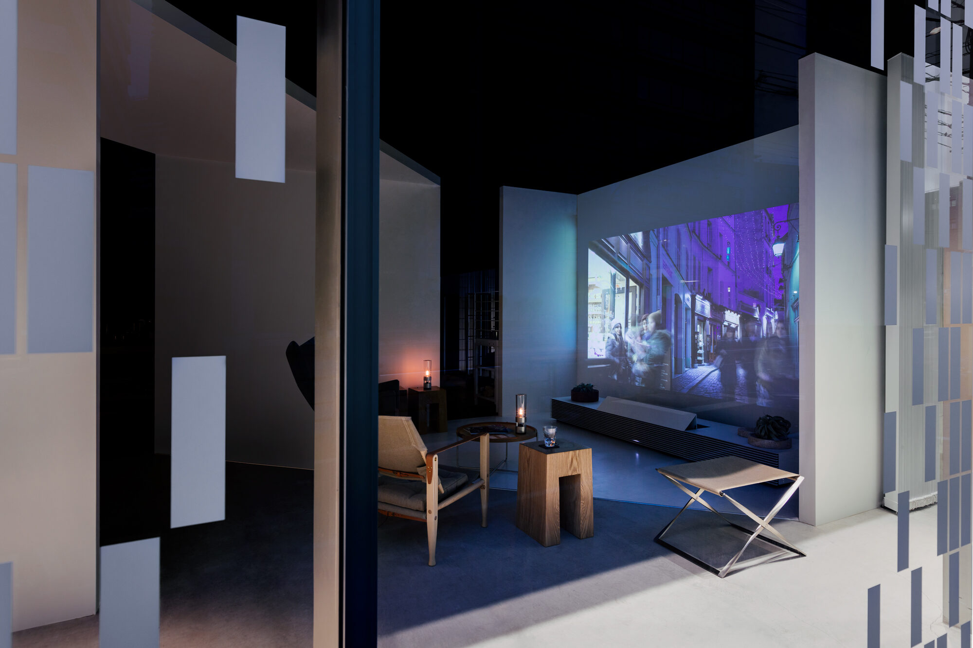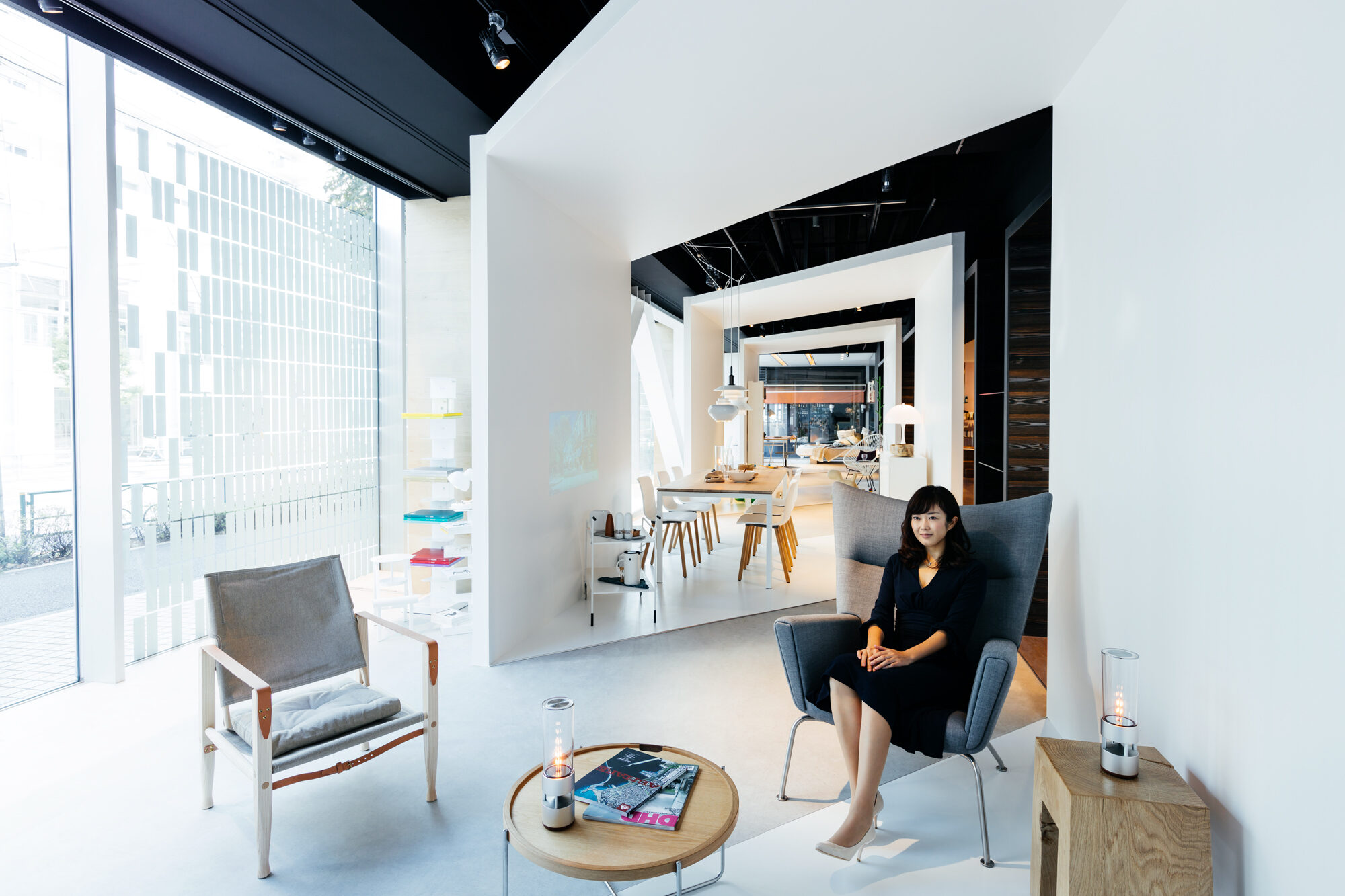 インテリアショップであるLIVING MOTIFで行われる展覧会であることから、家具との共演の背景となる 「白」の空間を考えました。 「Life Space UX」のプロダクトは、空間に溶け込みながらも、生活行為や、場と人を途切れなく繋ぐ、 可能性に満ちたものであると感じられます。その魅力を体現するため、床、壁、天井がシームレスな空間を 形にしました。 「白」の空間は、大きく緩やかなループ形状である為、動線の自由度が高く、店舗のどこからでも 展覧会場へ立ち寄ってもらうことが出来ます。ファサードは既存の外装タイルのパターンを用いて、 大きなウィンドウを覆い、適切な明るさとなるよう工夫しました。