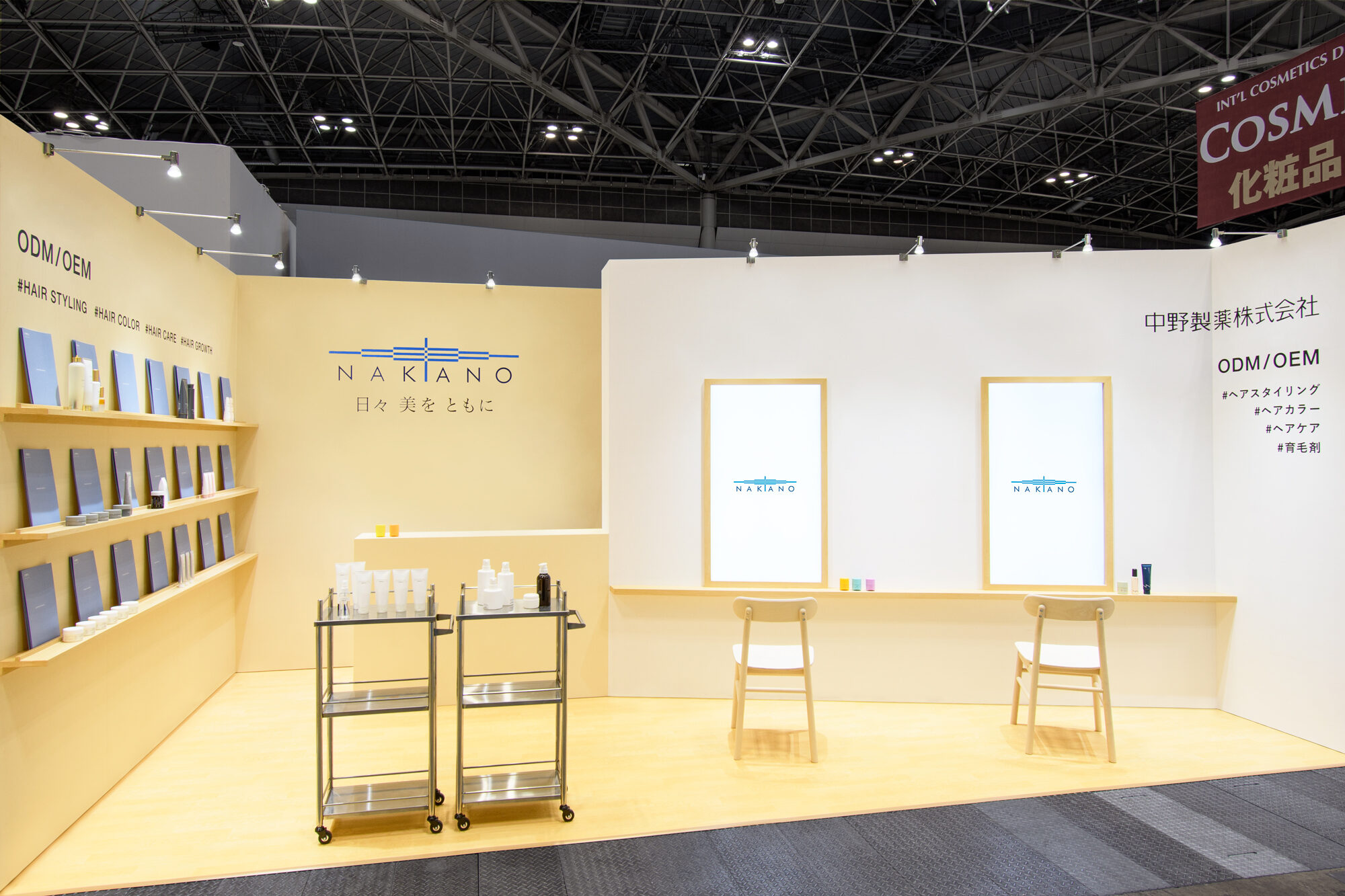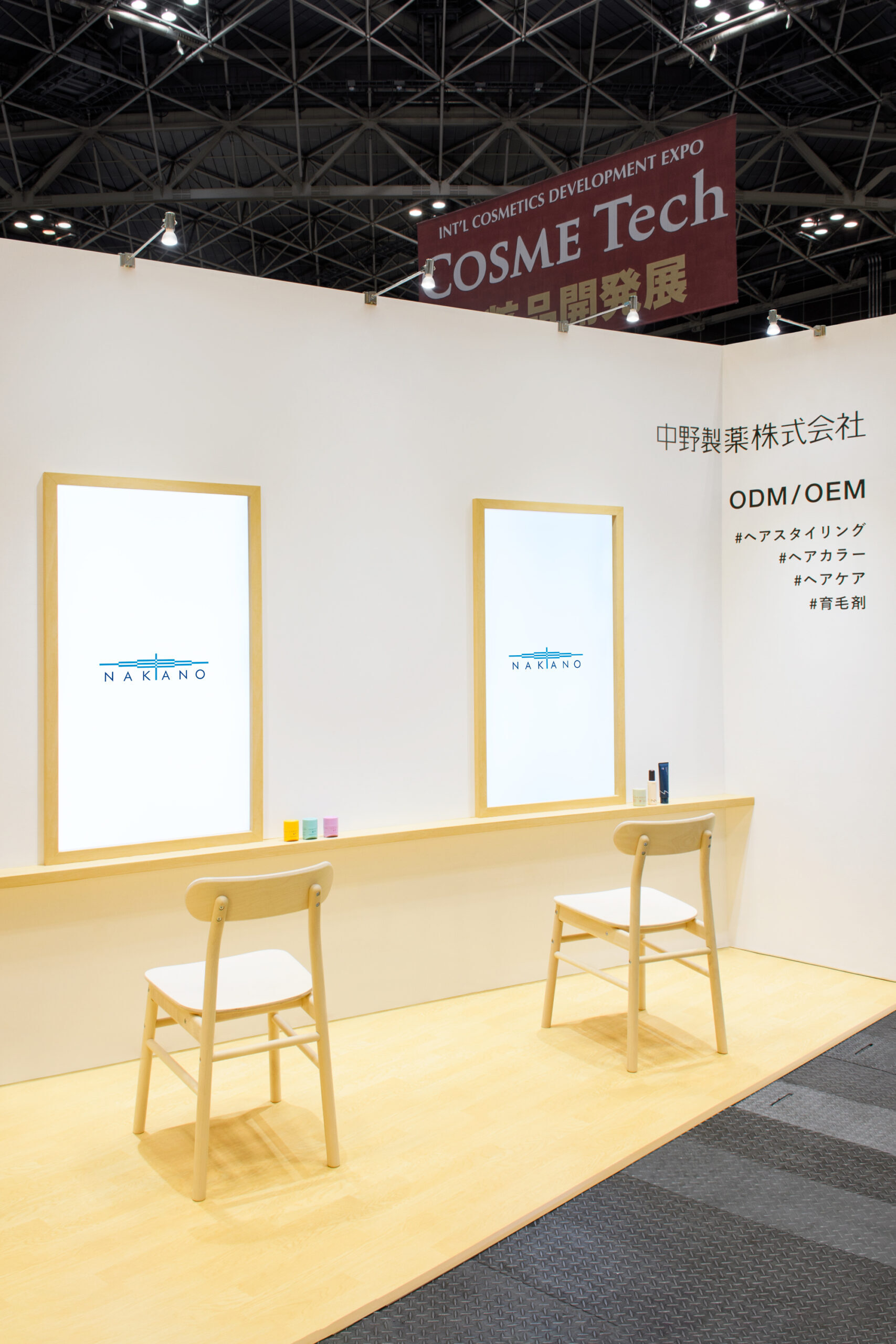 京都に本社を持ち、日本で高い品質の商品を作り続ける中野製薬株式会社のCOSME Tech 2024 TOKYOでの展示ブースデザイン。