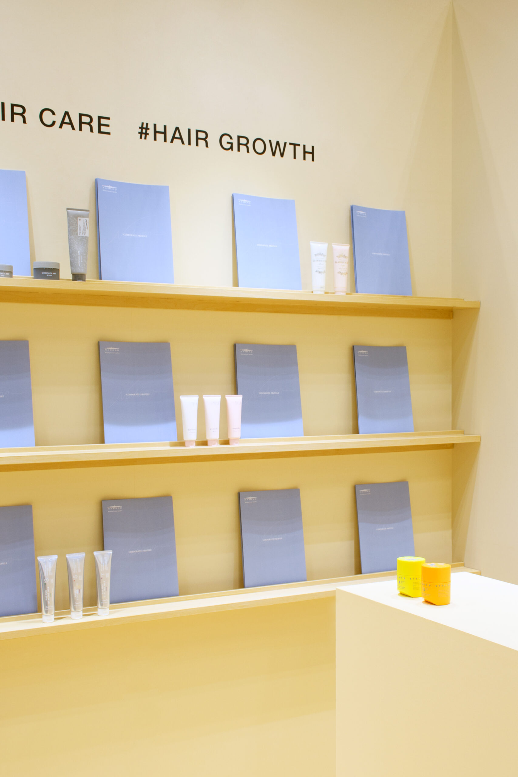髪に纏わるプロダクトのODMやOEMを受けている特徴を表現するため、ヘアサロンを想起させる空間に仕上げました。穏やかな空気の中で商品やサービスを体験していただくため、空間全体を柔らかな印象のカラーパレットでまとめました。ミラーに代わり、モニターを収めた壁面は、色を切り替えて斜めに配置しています。これにより、来場者に対しての視認性を上げると共に、ブース内へ自然と入っていける構成になっています。