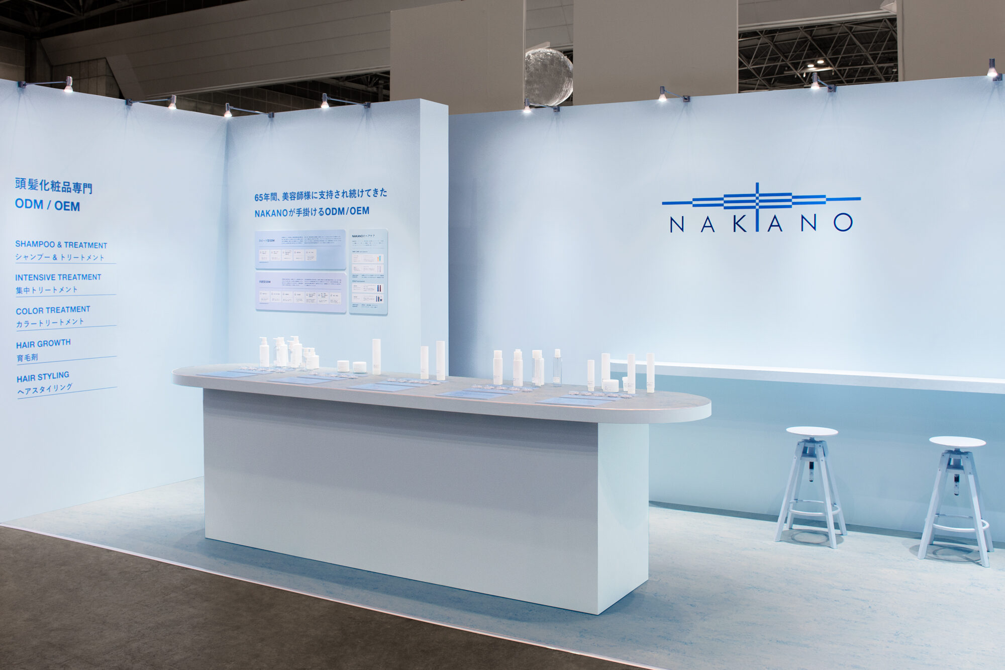 京都に本社を持ち、日本で高い品質の商品を作り続ける中野製薬株式会社のCOSME Tech 2025 TOKYOでの展示ブースデザイン。