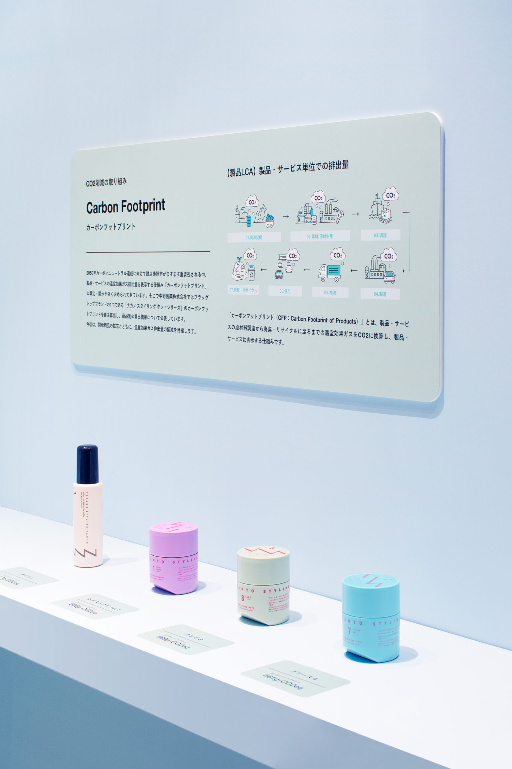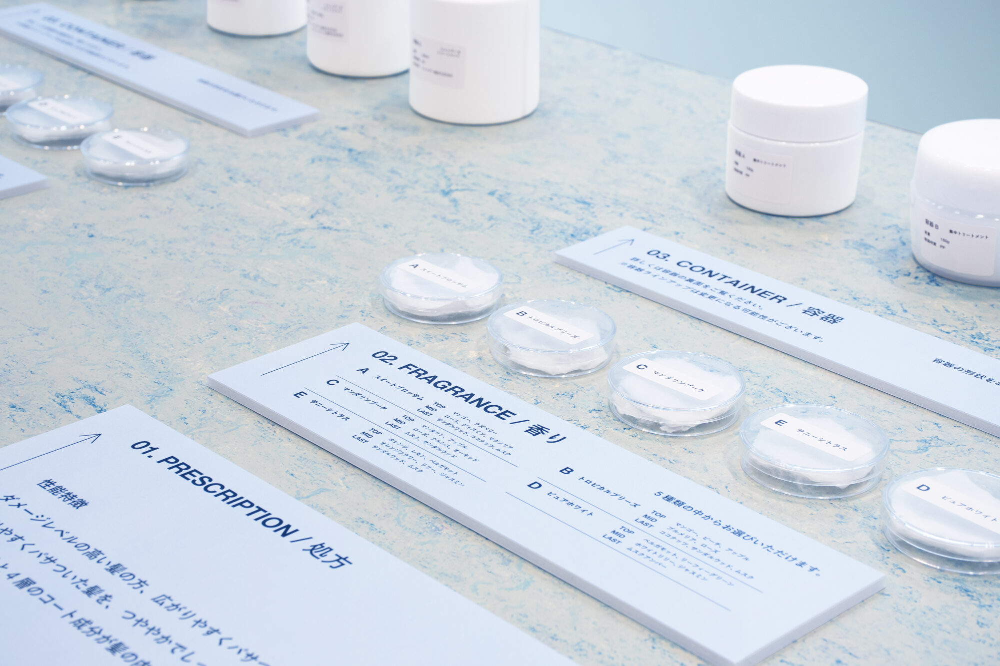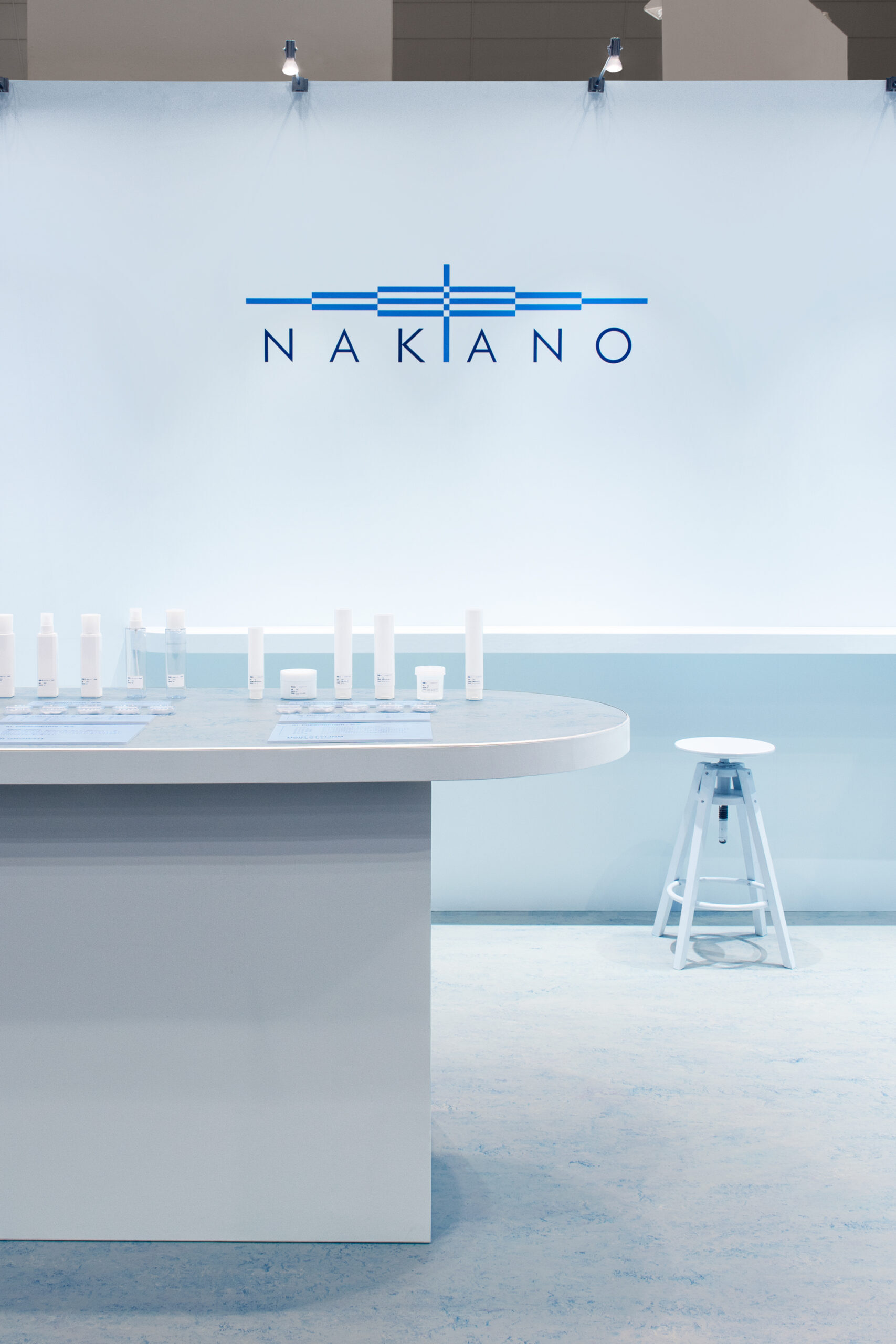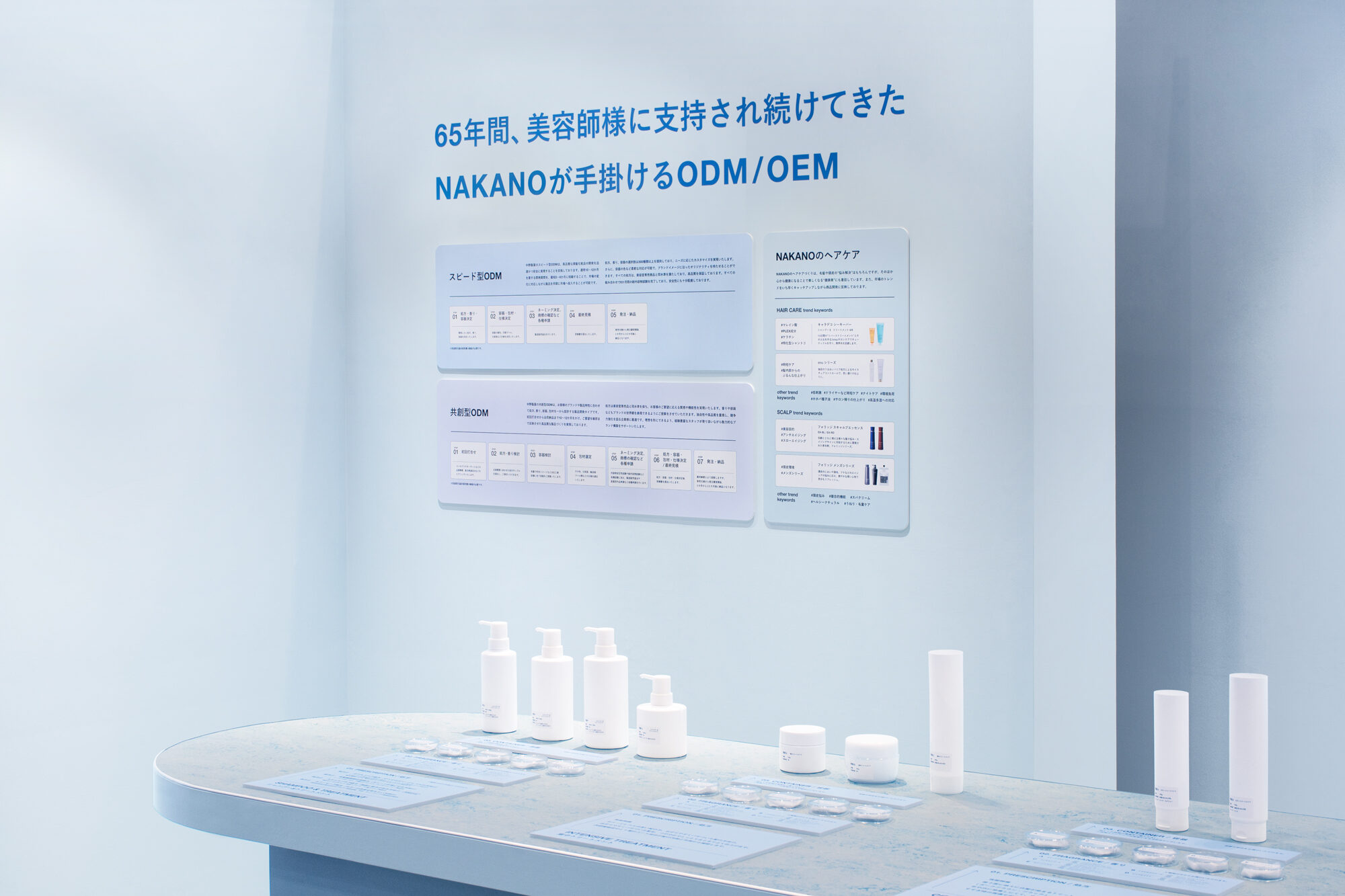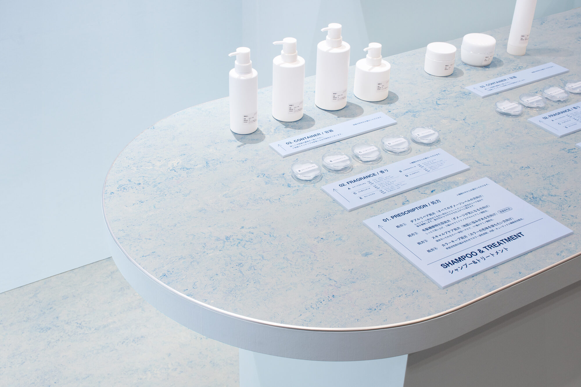 ロゴのブルーをインスピレーションに、水と関わりの強い頭髪化粧品という領域や、水辺にある企業立地を想起させるライトブルーの空間に仕上げました。ODMの特徴を伝えるため、多くの来場者の方々が集うことの出来る大きなテーブルを用意しました。処方、香り、容器、とサンプルを確認しながらODMの進行を体感することができます。天板は、環境負荷の少ない植物性の床材を切り出して使用しています。環境負荷低減に取り組む企業姿勢を伝えるとともに、自然の風景からのインスピレーションを抽象的な柄で表現した表層によって、パネルや空容器といった業務的な展示物の印象を向上させます。また、壁面には伝えたい内容によって少しずつ背景色が異なるパネルを掲出しています。来場者の方が一人でも理解を深めることができる機能性を備えながらも、柔らかで静謐な印象の空間を目指しました。