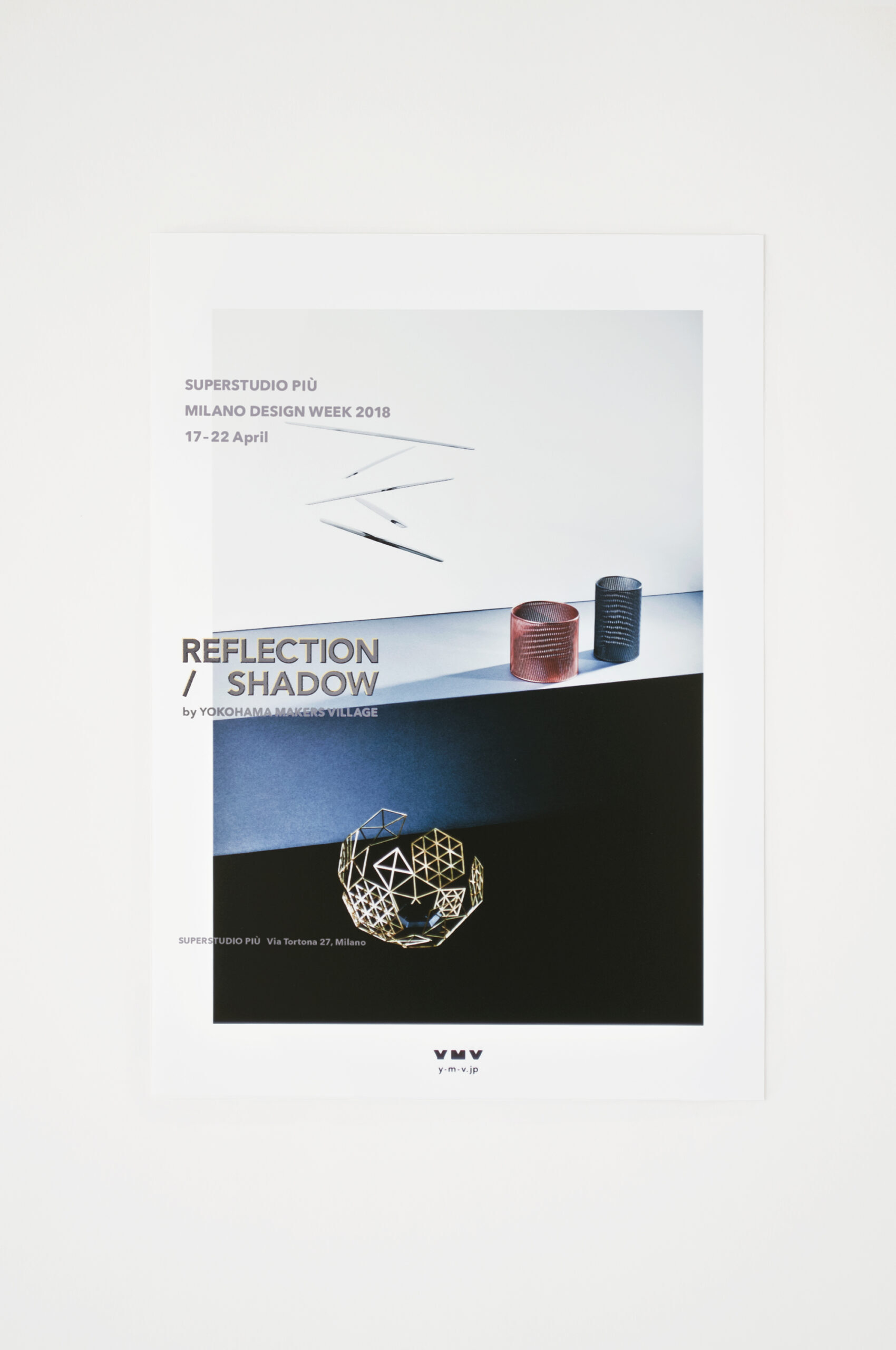 ミラノのSuperstudio Piùでの展示空間は、反射と影というテーマをより鮮明に伝える為に、作品だけに目がいくような暗闇を作りました。間接照明の少しの光だけで上質な印象に仕上げました。また、反射と影を象徴するイエローとグレーをキーカラーにメインヴィジュアルを展開しました。