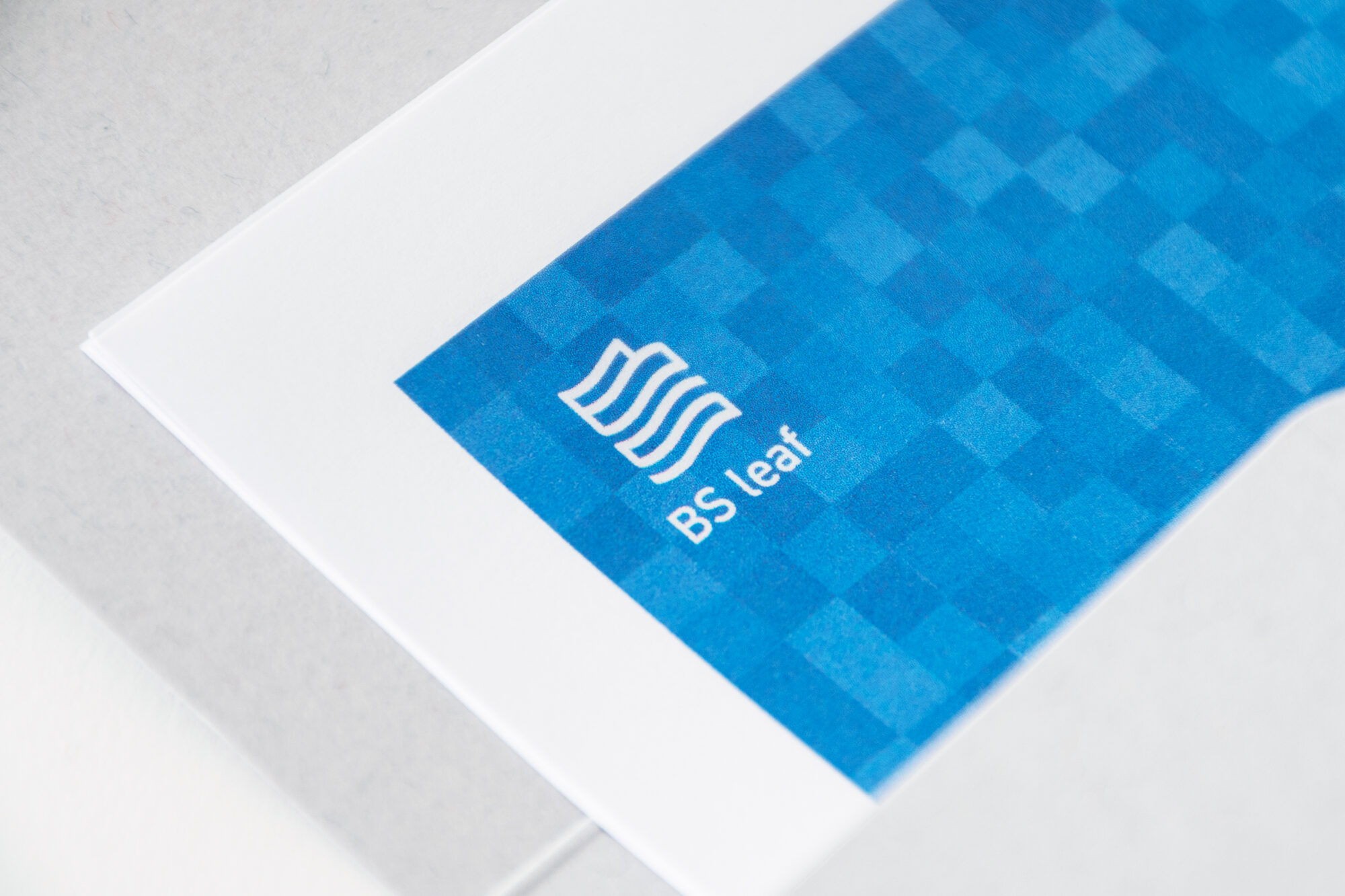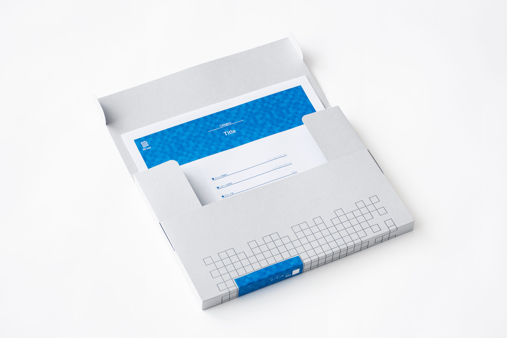 BS leaf は、プロジェクトの報告を社内共有するための伝達ツールです。レポートのフォーマットとプリントアウトしたものをストックしておくドキュメントホルダーを制作しました。ロゴは、紙のレポートが持つなめらかさや軽やかさを連想させる形です。よく見るとBusiness Solutionの頭文字である「B」と「S」で構成されています。よく見ることで発見を生む、知ることで思考の流れが始まるというこのレポートの在り方を体現するものに仕上げました。BS leafが展示、収納される場所であるB Squareのロゴと姉妹感のある表現です。