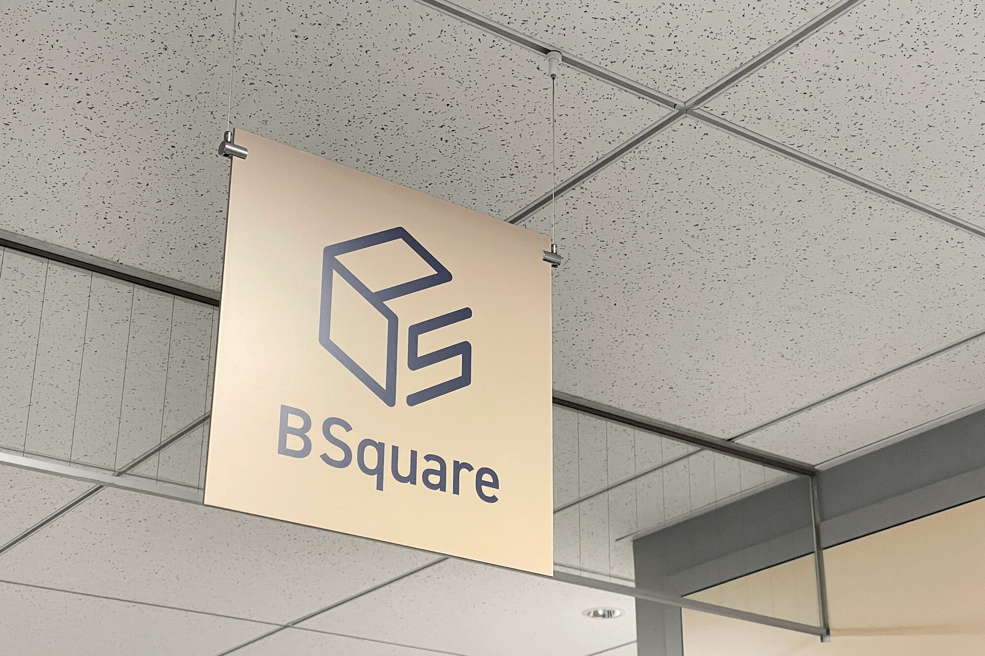 B Squareはオフィスフロアの一角に生まれた、情報やワーカーが集まるための場所です。ここでは、プロジェクトの報告を社内共有するための伝達ツールであるBS leafを展示、収納しています。ロゴは、本棚に収められたドキュメントホルダーを連想させる形です。よく見るとBusiness Solutionの頭文字である「B」と「S」で構成されています。よく見ることで発見を生む、知ることで思考の流れが始まるというこの場所の在り方を体現するものに仕上げました。この場所に展示収納される伝達ツールBS leafのロゴと姉妹感のある表現です。
