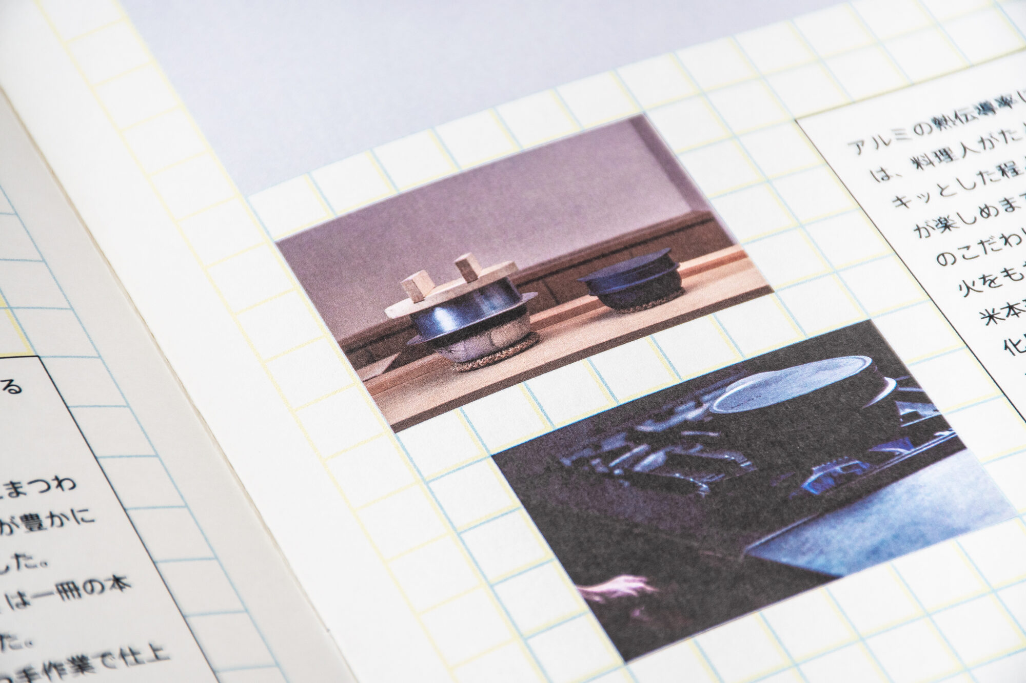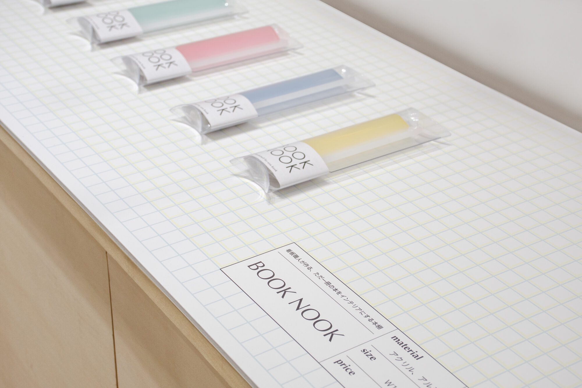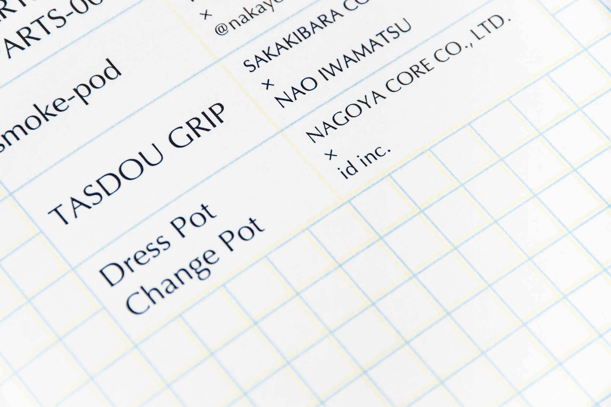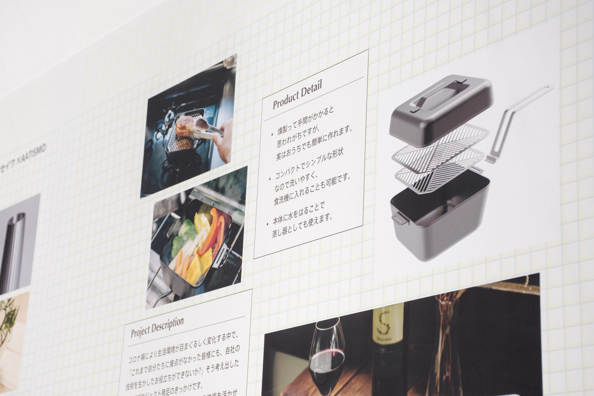 ものづくりを連想させる方眼紙をモチーフに背景を構成しました。青と黄色の方眼を掛け合わせることで離れてみた時には緑に見える視覚効果を利用して、コラボレーションによって生まれる新しい色を表現しました。