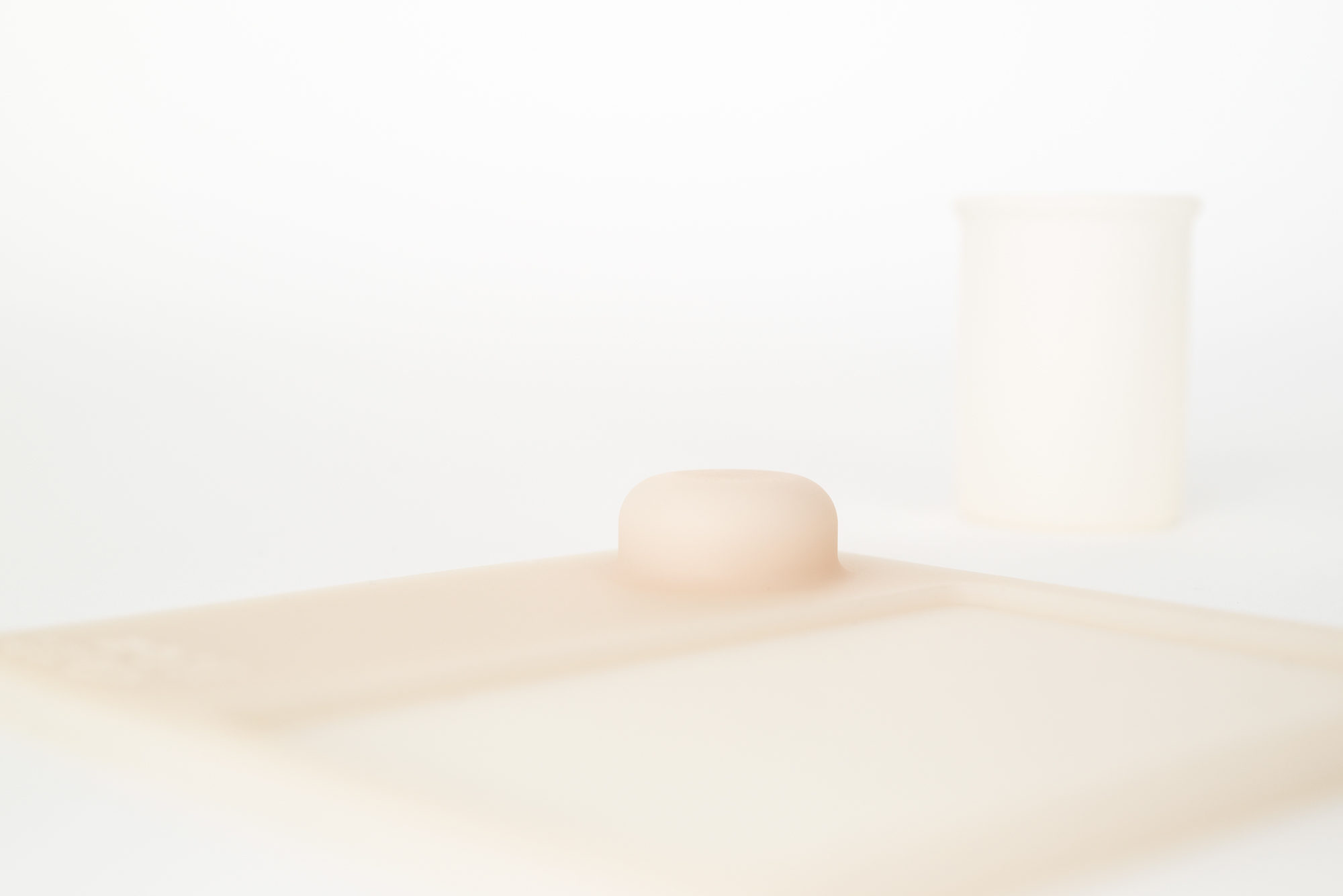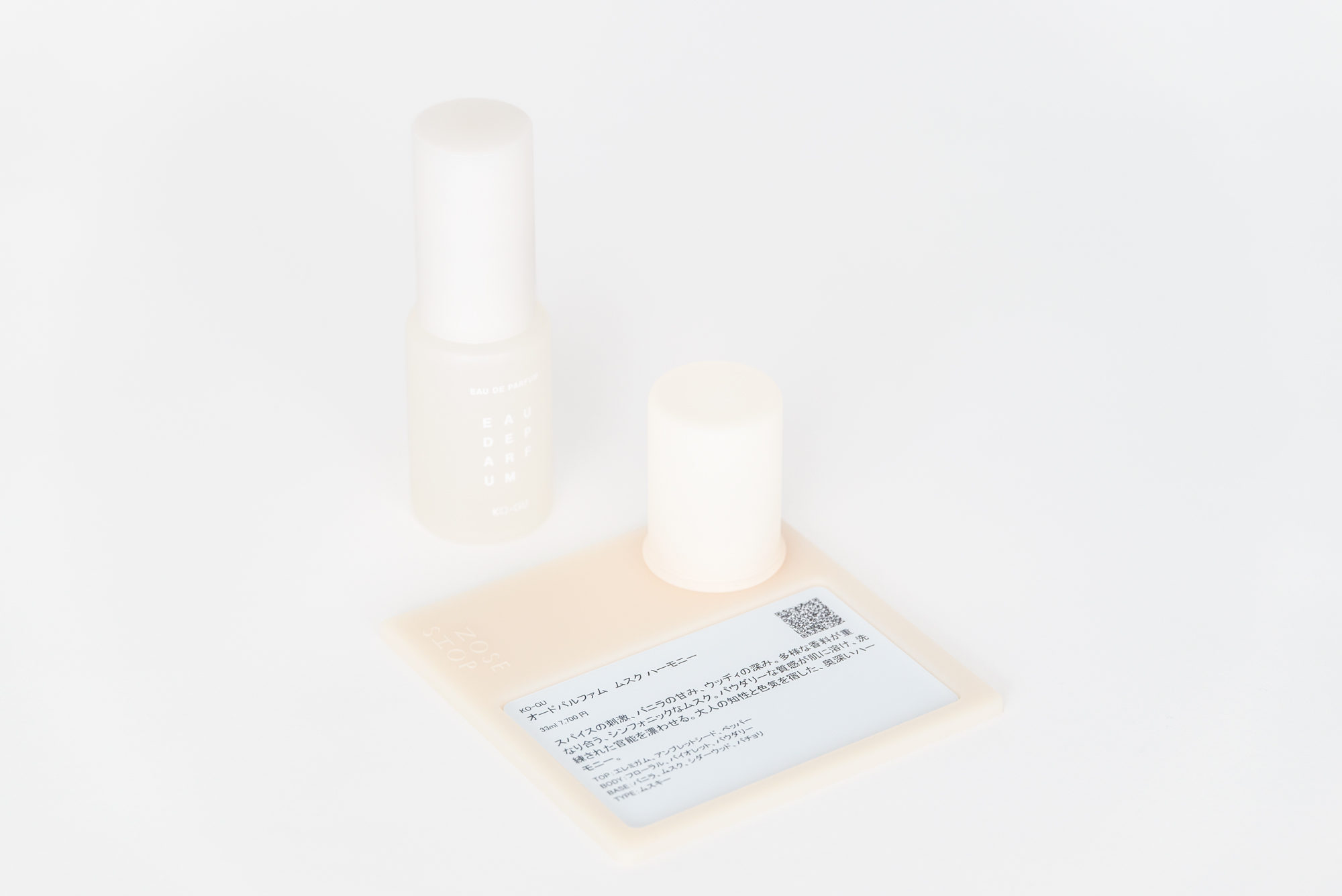 ブランドの核となるオードパルファムは、多様な使い方に対応できるよう容量を見直し、安定感のあるフォルムに変更されました。マットな質感のやわらかなベージュのガラスを背景に、上述のグラフィックを配置しました。紙箱にも同じ構成をエンボス加工と淡いベージュの印刷で反映しています。紙箱にはカードが収められており、背面に設けられた二つの窓から印刷された香りの名称と製品情報を覗くことができます。もう一方の面には香りの名称のほか、ボトルの底面に呼応する円が描かれており、自然とその上にボトルを置きたくなるような設えです。控えめな仕掛けの中に、ささやかな愉しみを込めました。整えられた佇まいは、特別な贈り物にも最適です。