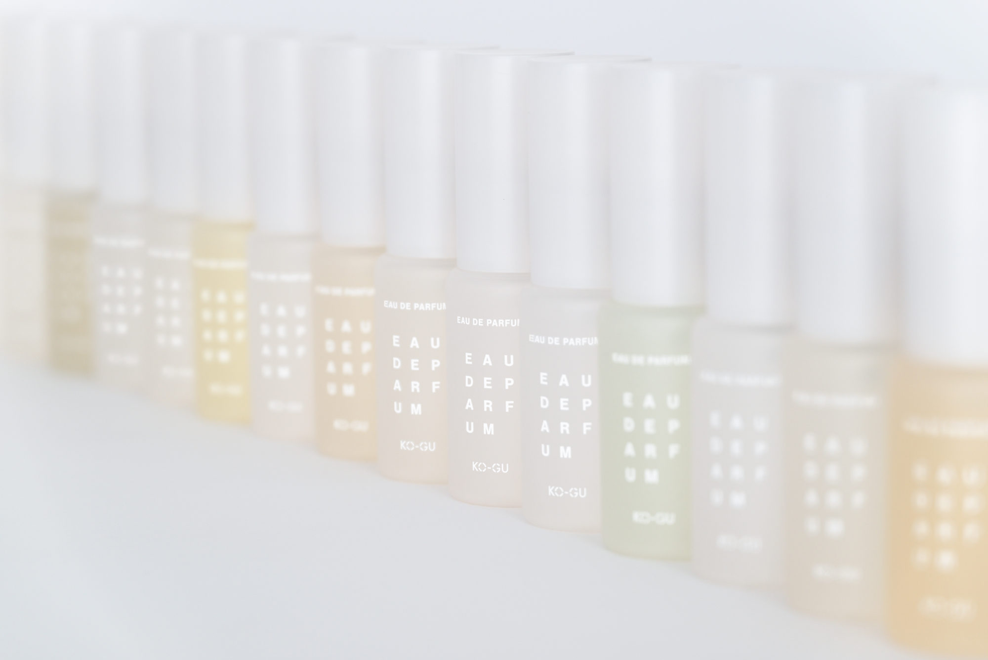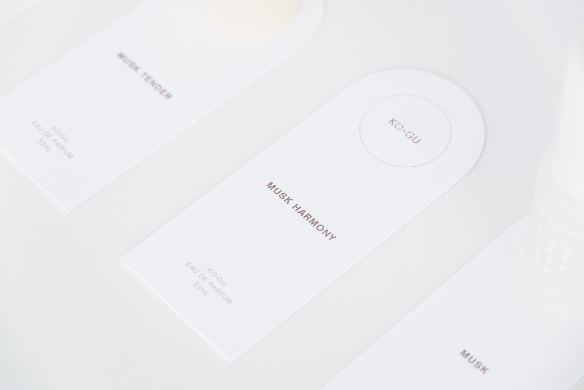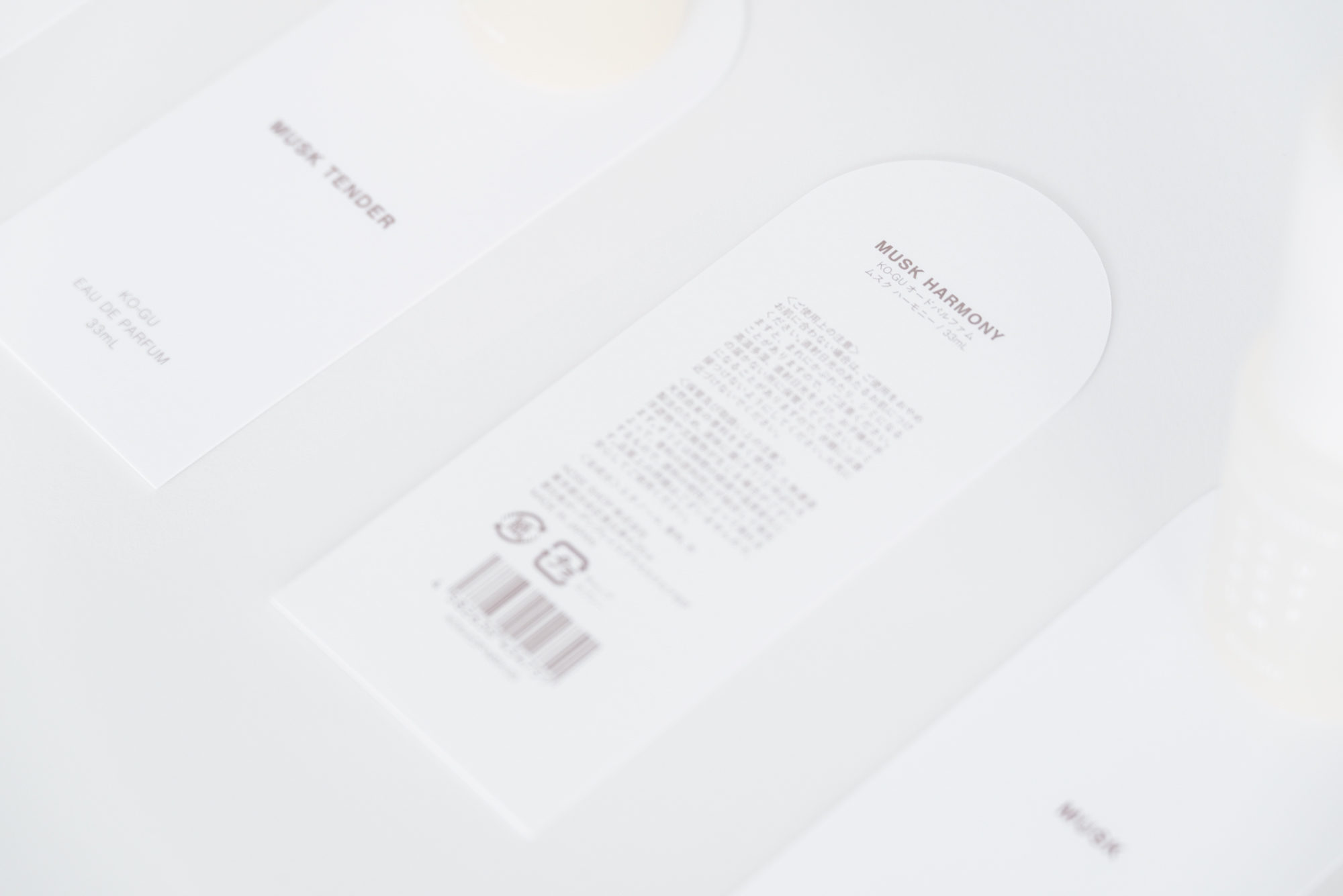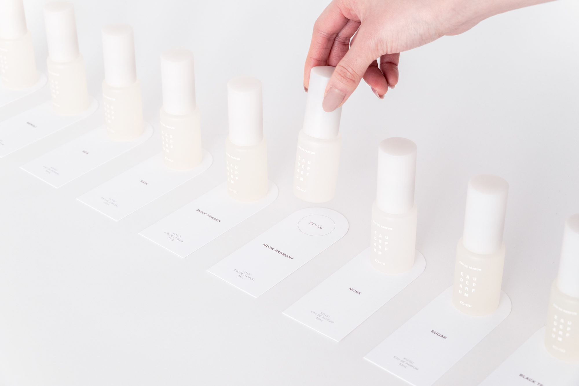 KO-GUは、使う人の暮らしを豊かにするために、香りを“道具”として位置付けています。ストーリーやヴィジュアルによる演出をあえて控え、使い手の感覚や創造性に委ねる余白を大切にしています。この思想を受け、パッケージデザインでは必要最小限の情報である文字のみを構成要素とし、その在り方と向き合いました。3文字ごとに規則的に改行される構成は、見る距離や意識の仕方によって印象が変化します。ぼんやりと眺めると図形のように、意識して見ると情報として読み取ることができます。コンクリートポエトリー(視覚詩)から着想を得たこの構成は、使用する環境や使う人の感覚を静かに受け止めます。
