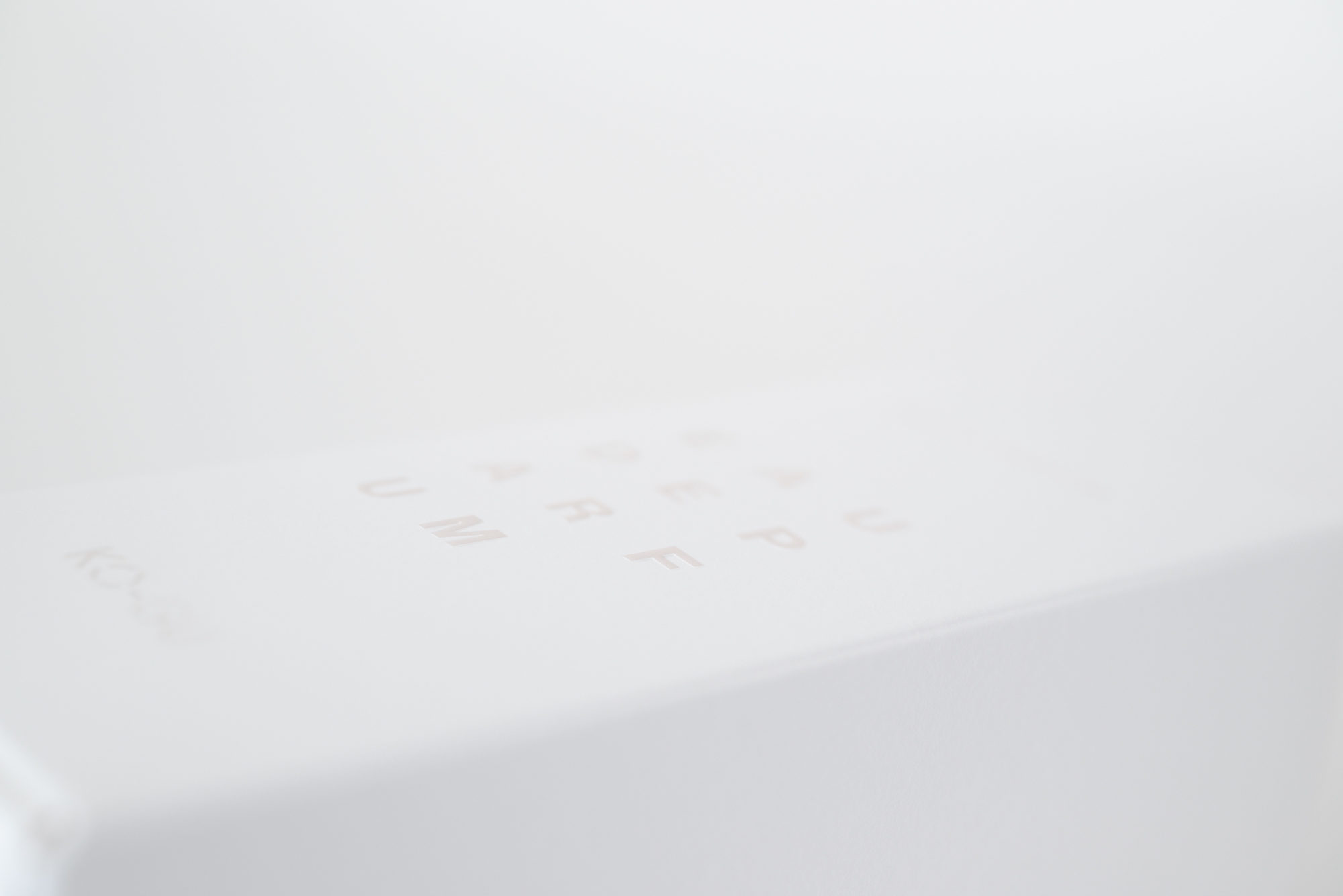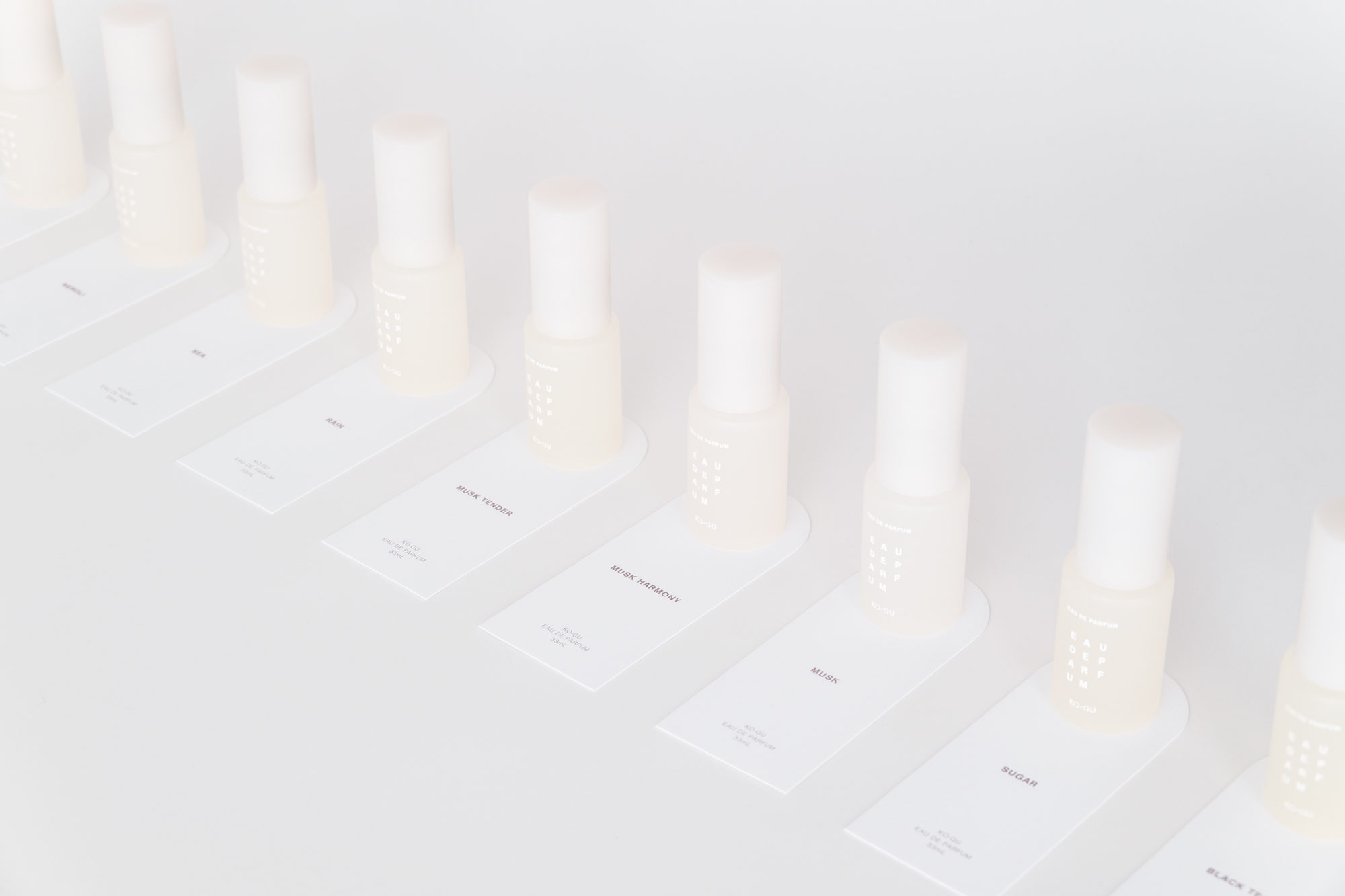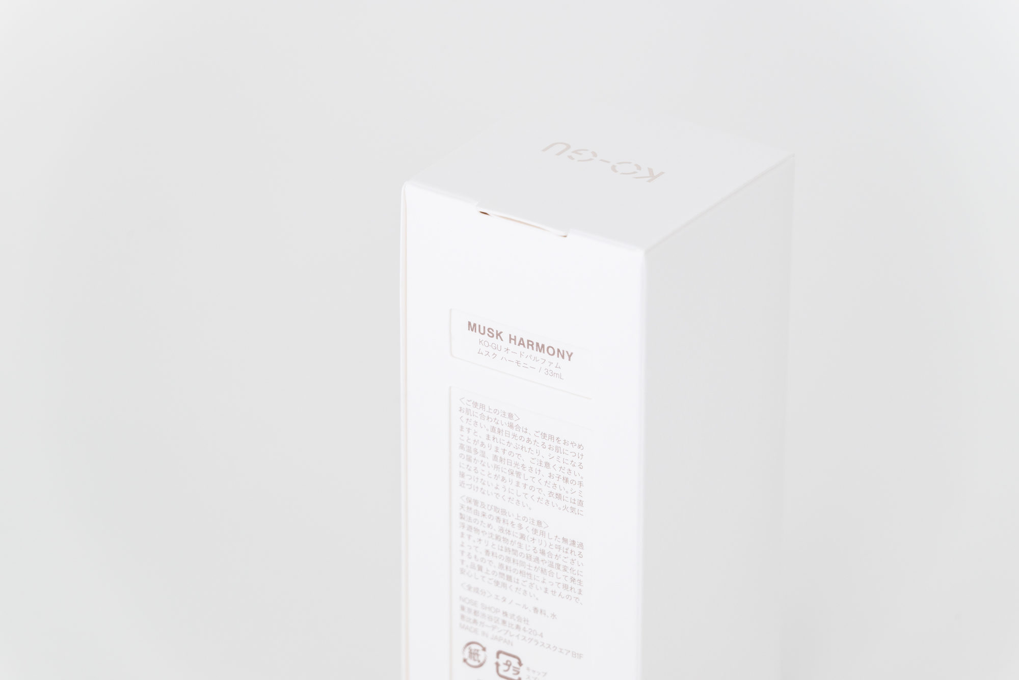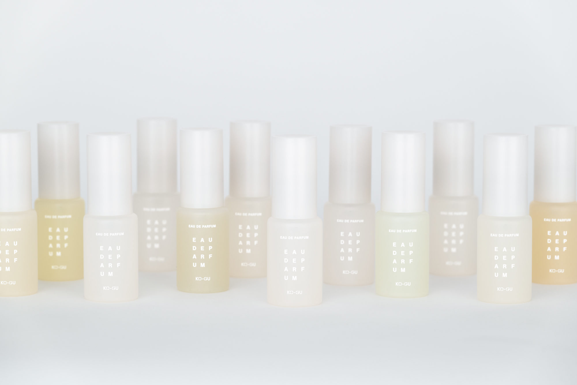 KO-GUは、使う人の暮らしを豊かにするために、香りを“道具”として位置付けています。ストーリーやヴィジュアルによる演出をあえて控え、使い手の感覚や創造性に委ねる余白を大切にしています。この思想を受け、パッケージデザインでは必要最小限の情報である文字のみを構成要素とし、その在り方と向き合いました。3文字ごとに規則的に改行される構成は、見る距離や意識の仕方によって印象が変化します。ぼんやりと眺めると図形のように、意識して見ると情報として読み取ることができます。コンクリートポエトリー(視覚詩)から着想を得たこの構成は、使用する環境や使う人の感覚を静かに受け止めます。