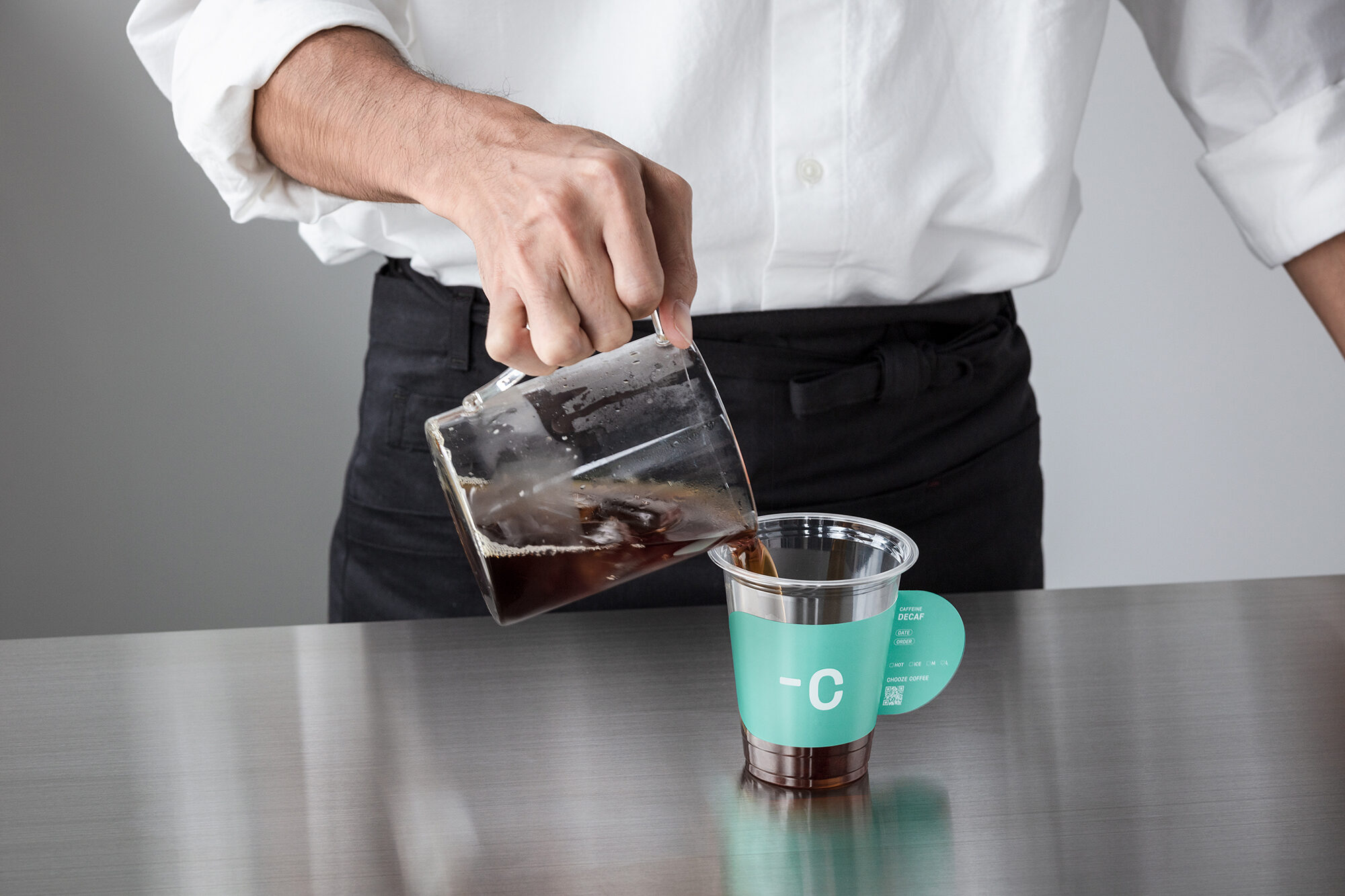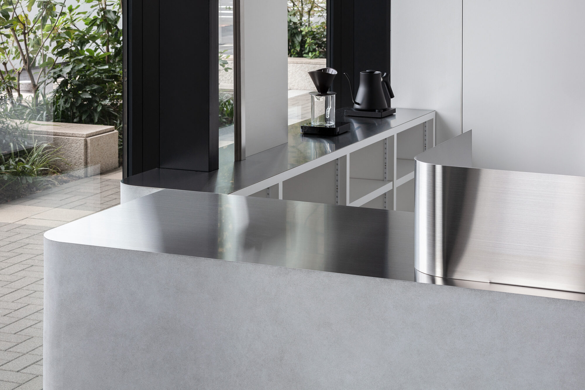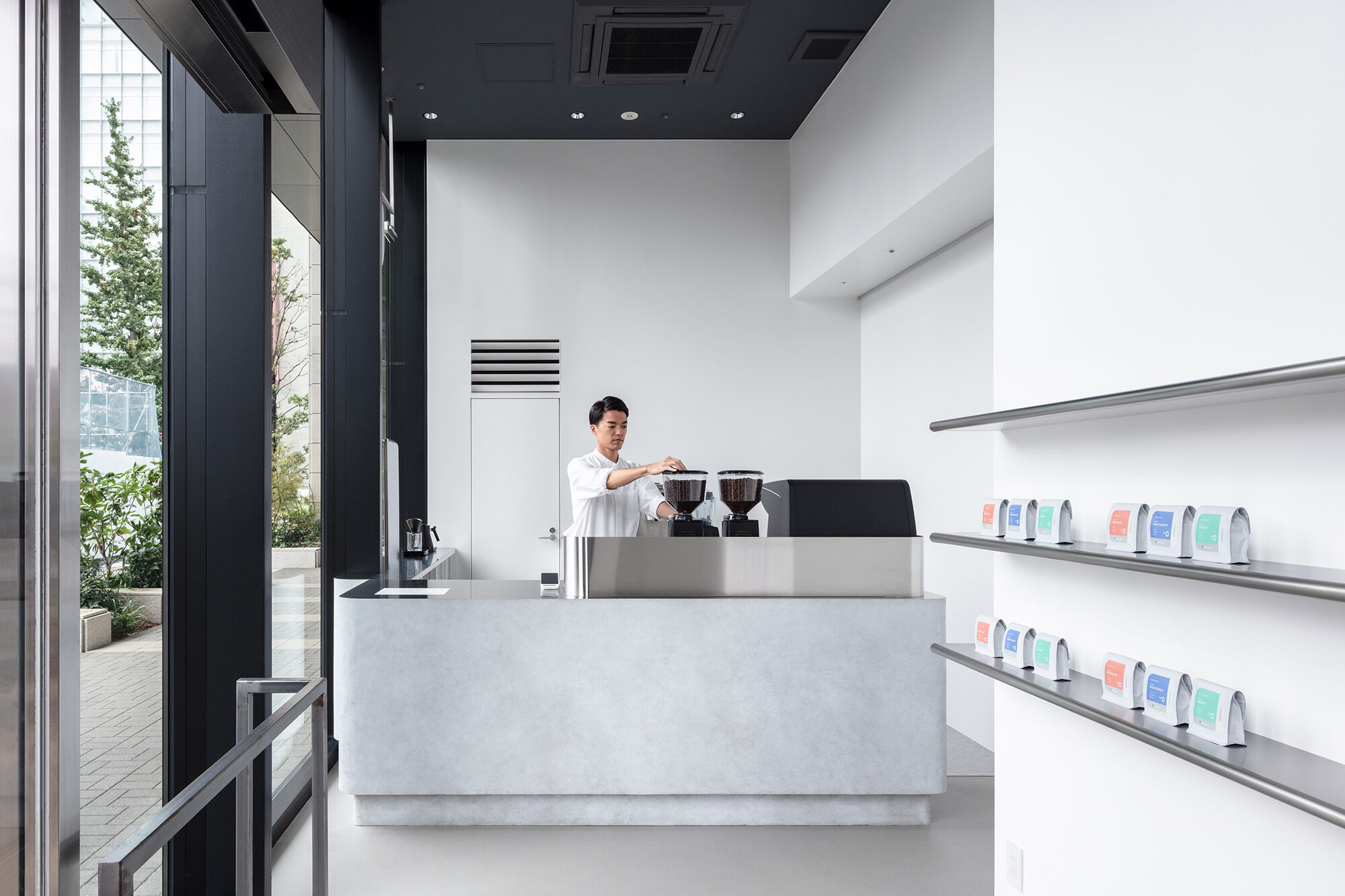 カフェイン抽出の研究を行うブランドの先進性を伝えるため、コーヒースタンドらしい要素は最小限に抑え、ラボのような印象に仕上げました。その一方で、外に向けてコーヒーを淹れる様子を見せることによって、バリスタの働く姿がディスプレイとして機能するように考えました。小さな店舗を大きなショーウィンドウのように扱うことで、コーヒースタンドとしての認知を向上させることに貢献しています。