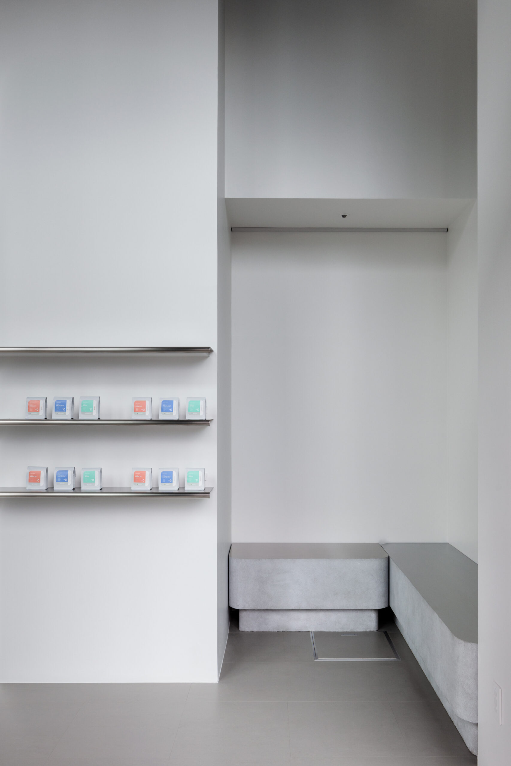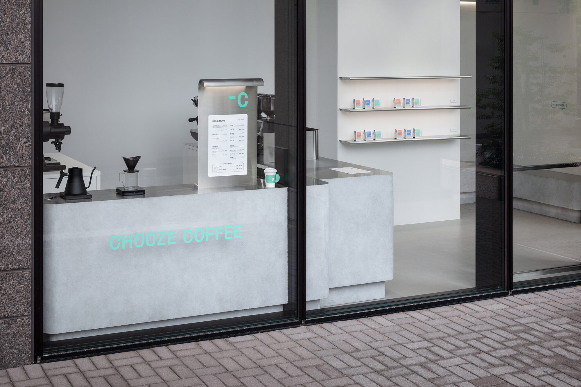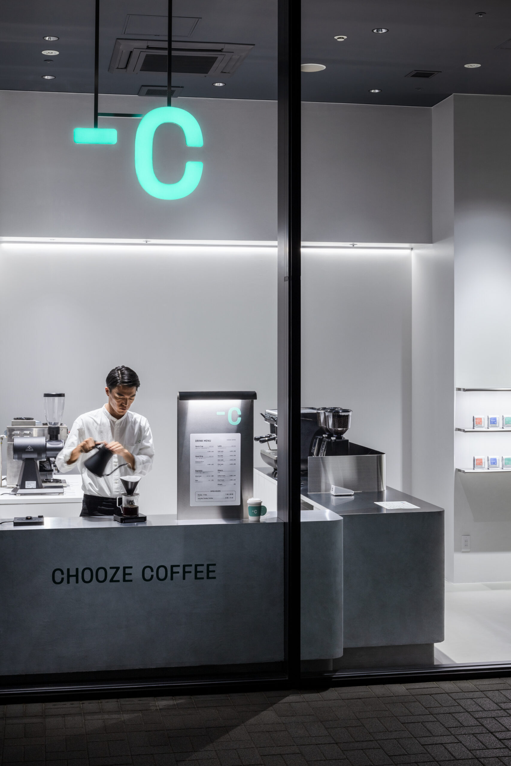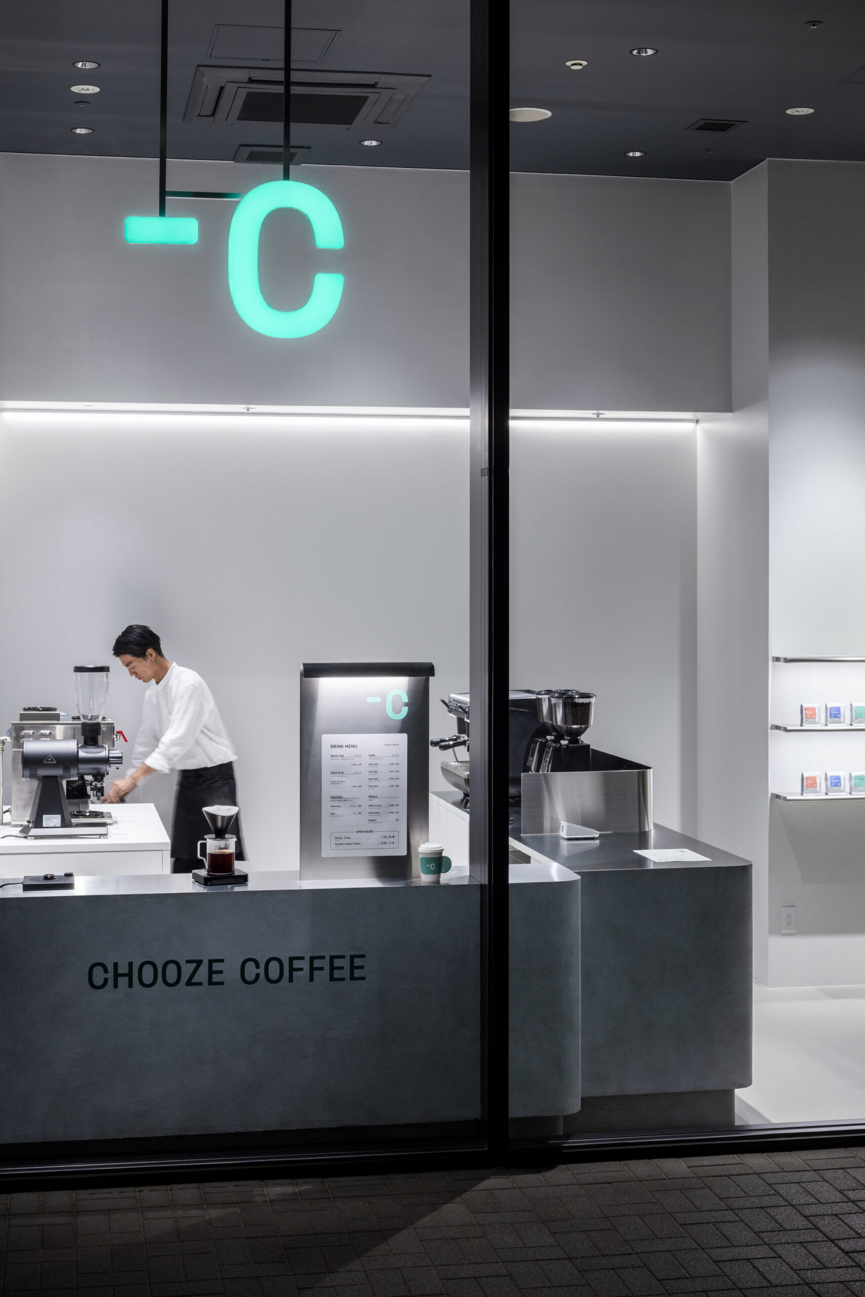 CHOOZE COFFEEは、高品質なスペシャルティコーヒーを用いたデカフェ豆を使用し、カフェイン量を選ぶ新しい体験を提案するコーヒーブランドです。コンディションに合わせたコーヒーを提供する場として、最適な空間を形にすることを試みました。店舗はオフィスワーカーが集うエリアに位置することから、緊張と緩和の交点となるバランスを模索しました。白やステンレスを基調とした無機質な空間でありながら、ブランドロゴに共通する柔らかな曲線や左官によるテクスチャーも取り入れています。