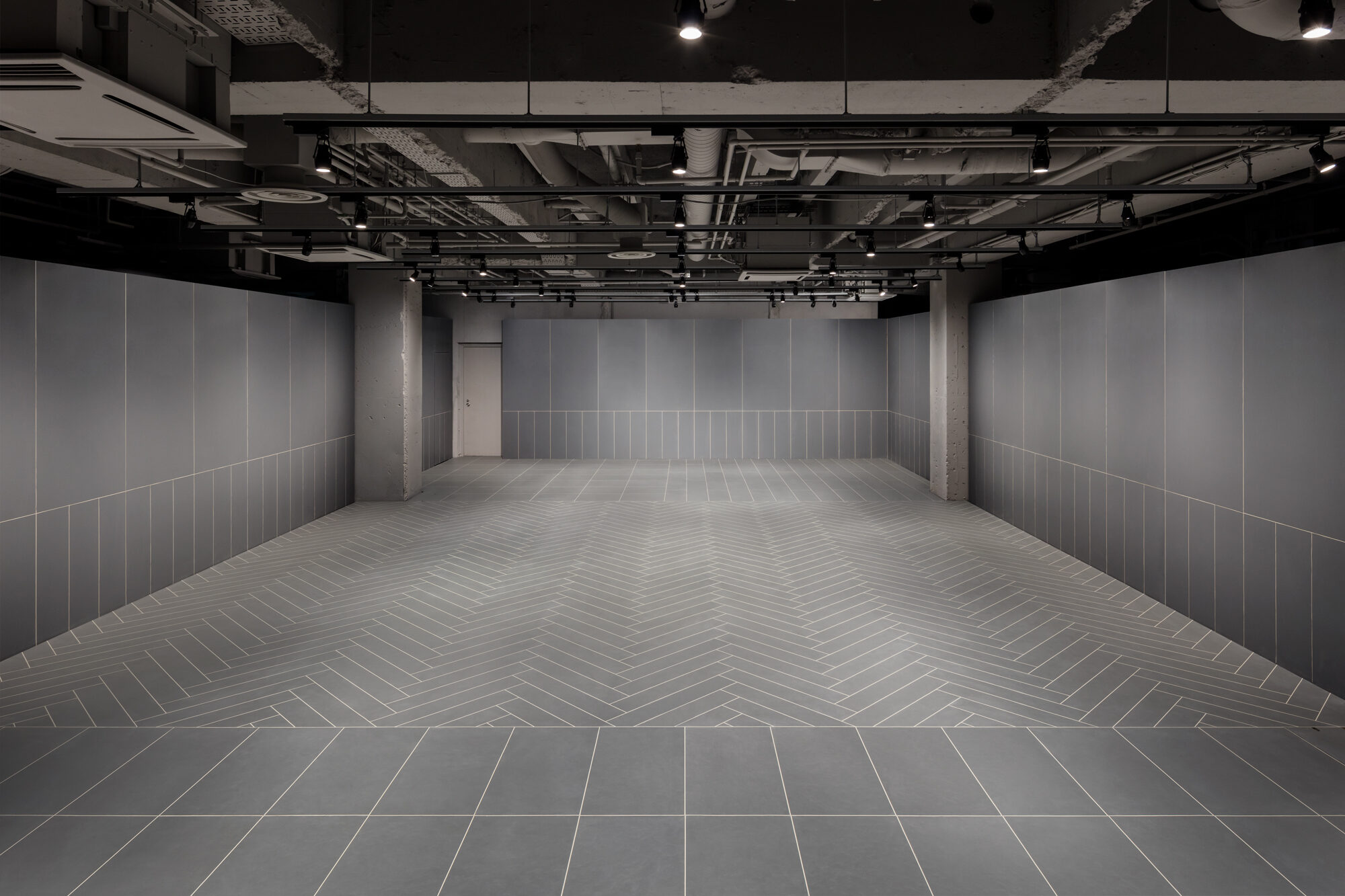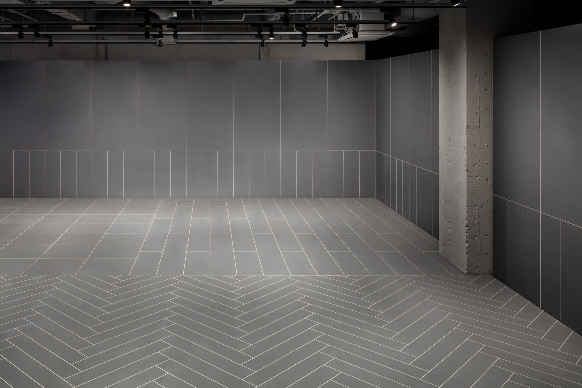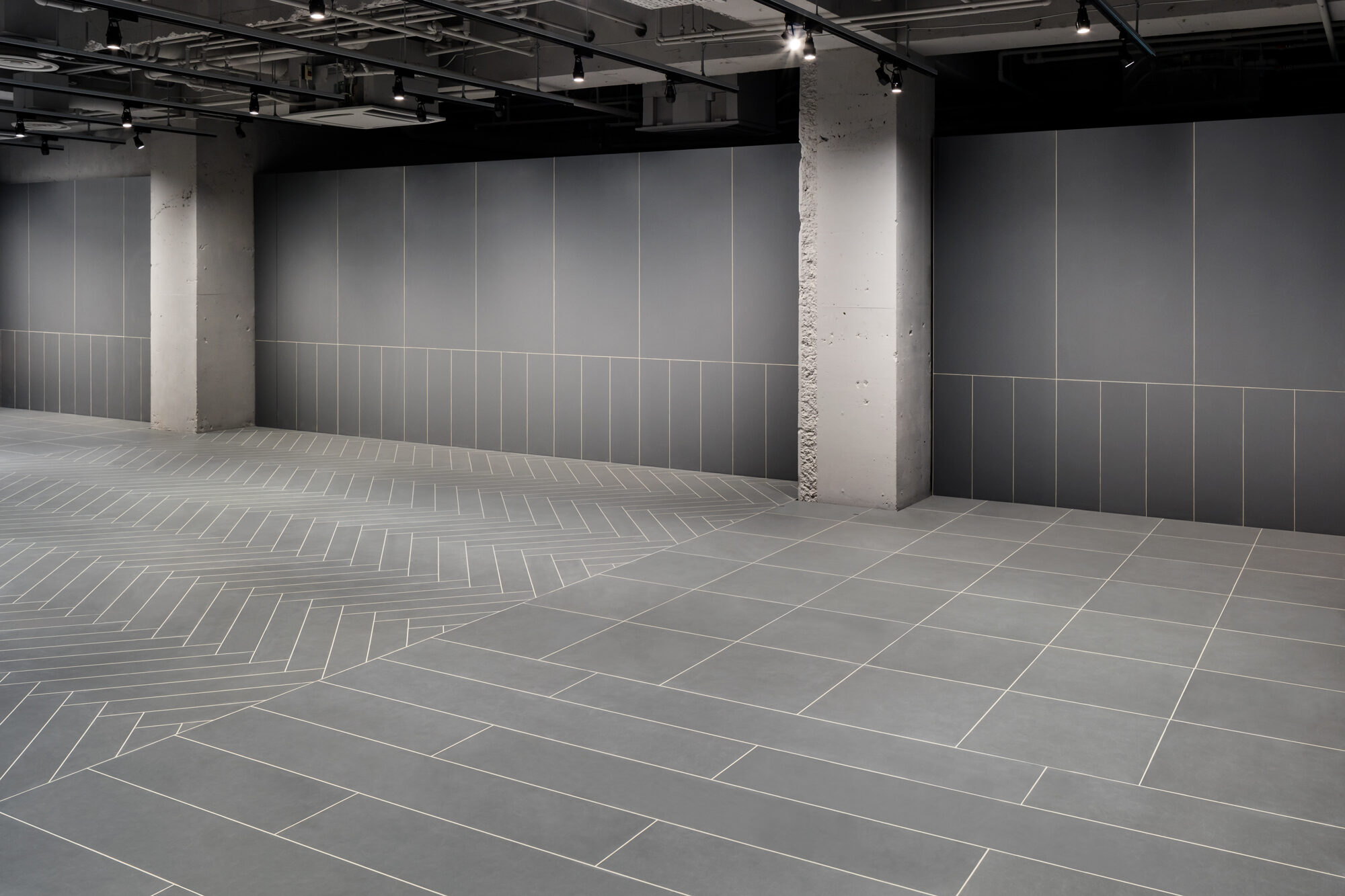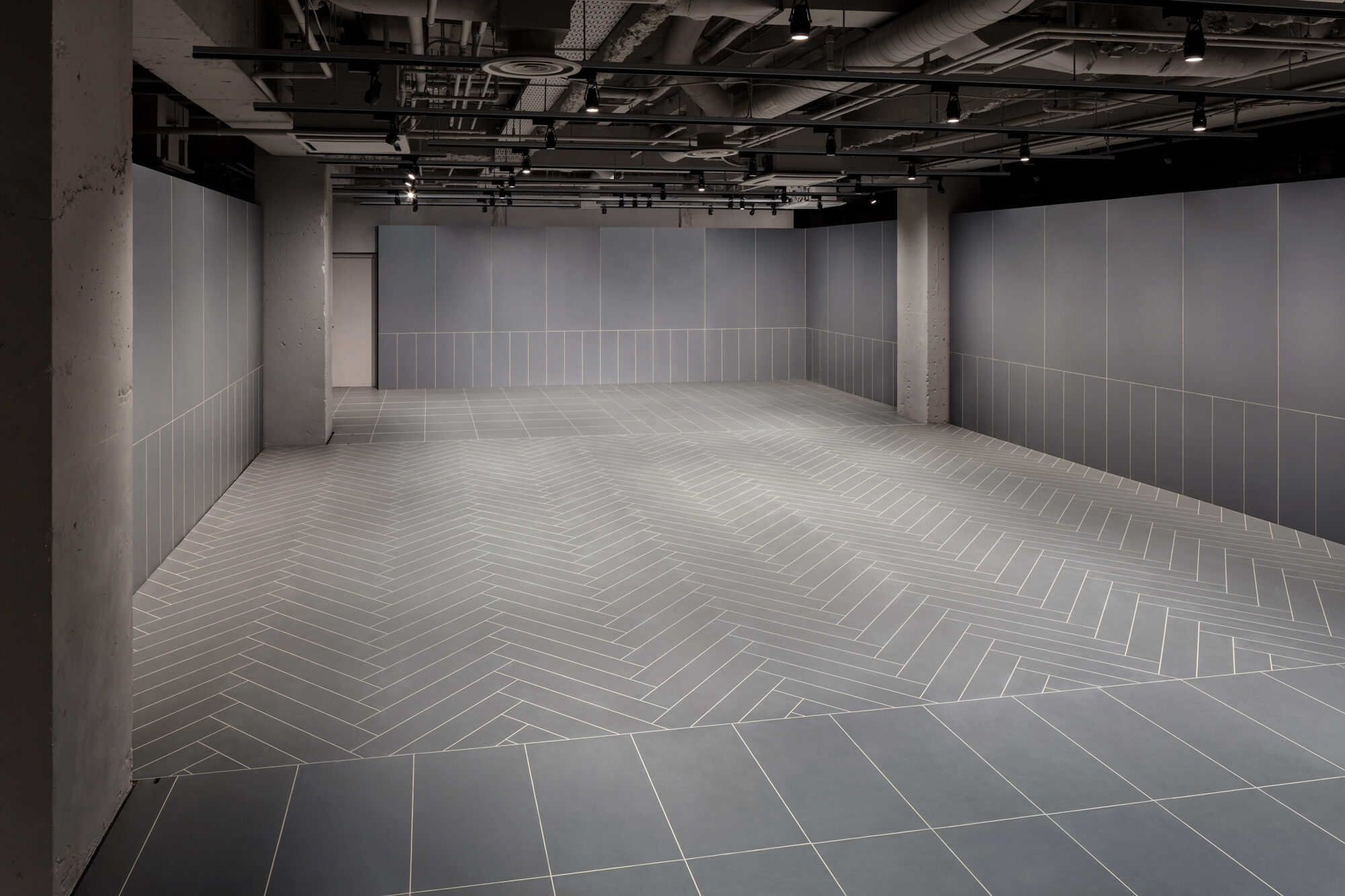 そこで、マットなダークグレーの面材にベージュの目地材を収めることで、目地が生み出す「線」に表情を与え、特徴づけることを試みました。これにより、タイルやヘリンボーンフローリングの気配が感じられます。一つの大きな空間をグラフィカルな線によって、緩やかに分節しました。また、床と壁に施された「線」は、メジャーのような役割も果たし、オフィスに設置した際のスケール感が捉えやすくなるという実用性も備えています。ショールームにおける実務的な確認作業を楽しいコミュニケーションに変換することを目指しました。