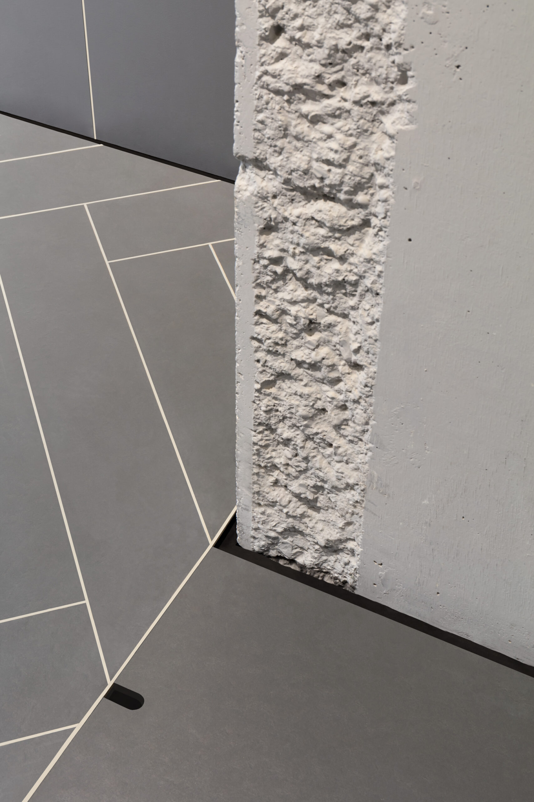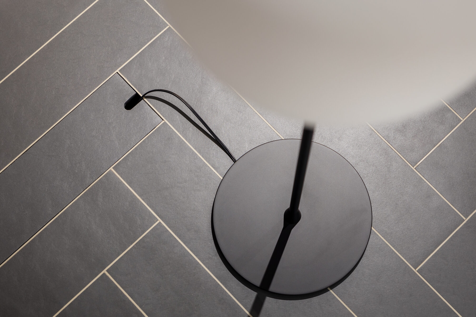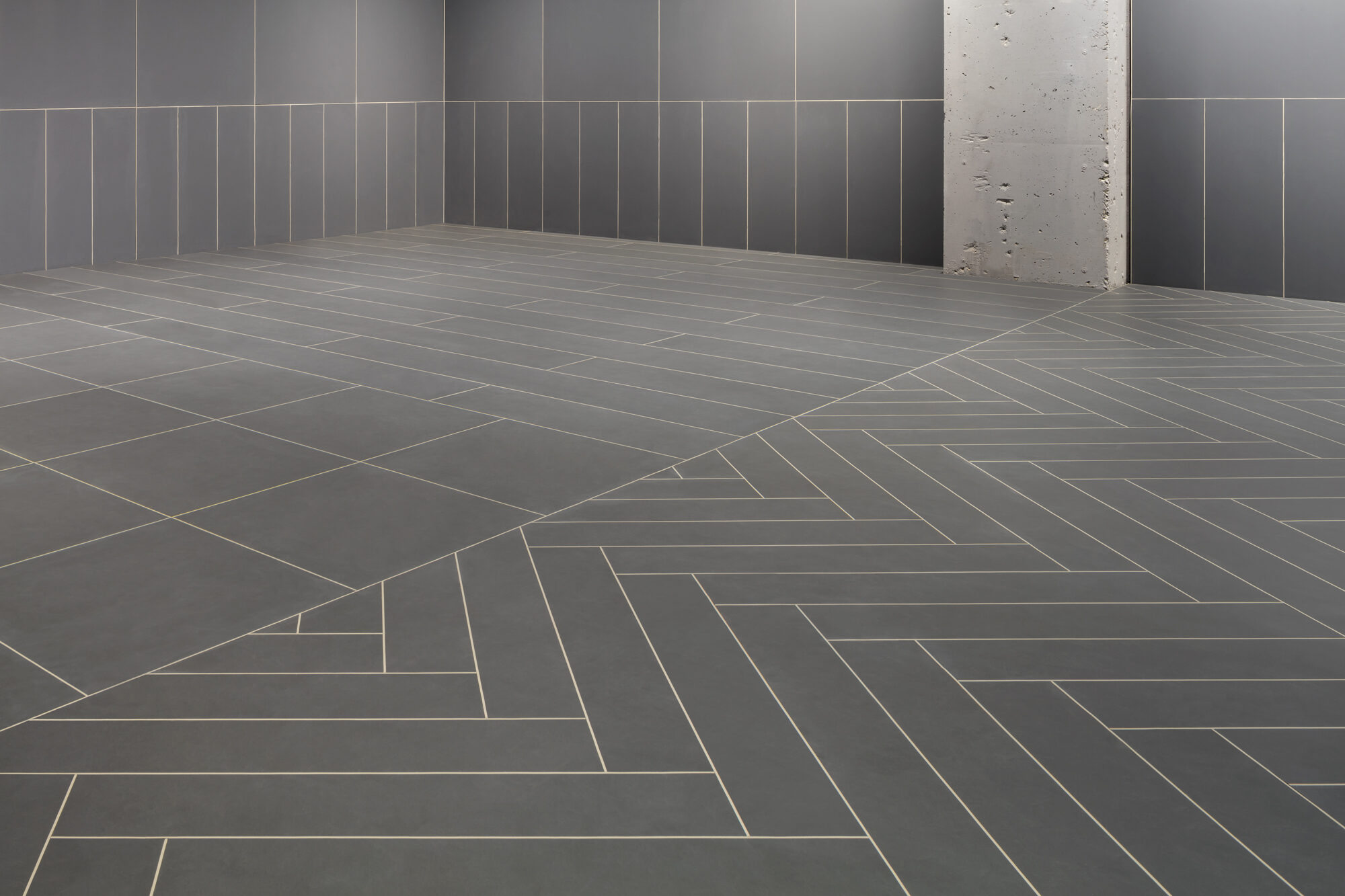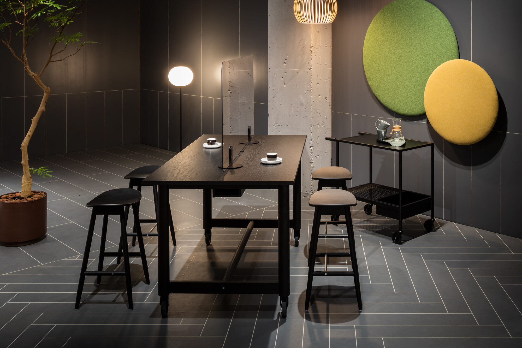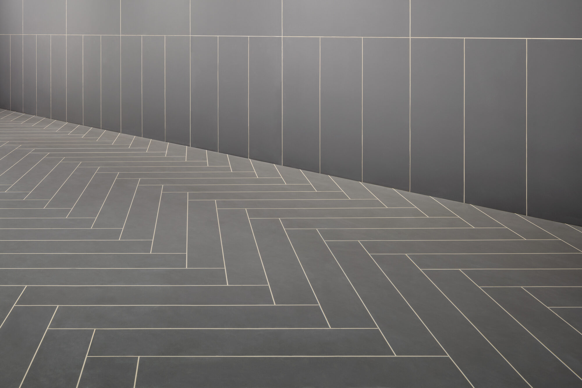 そこで、マットなダークグレーの面材にベージュの目地材を収めることで、目地が生み出す「線」に表情を与え、特徴づけることを試みました。これにより、タイルやヘリンボーンフローリングの気配が感じられます。一つの大きな空間をグラフィカルな線によって、緩やかに分節しました。また、床と壁に施された「線」は、メジャーのような役割も果たし、オフィスに設置した際のスケール感が捉えやすくなるという実用性も備えています。ショールームにおける実務的な確認作業を楽しいコミュニケーションに変換することを目指しました。