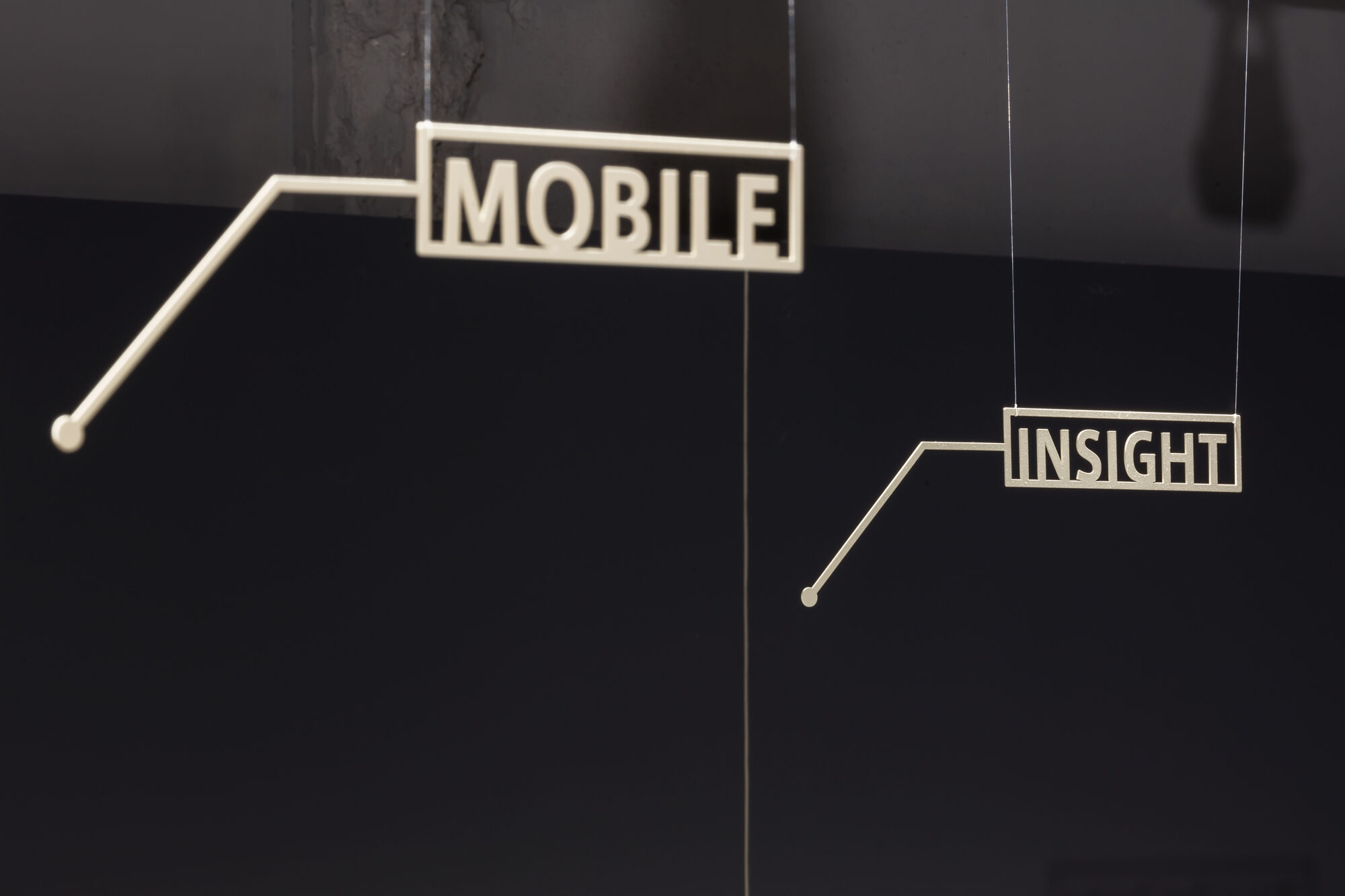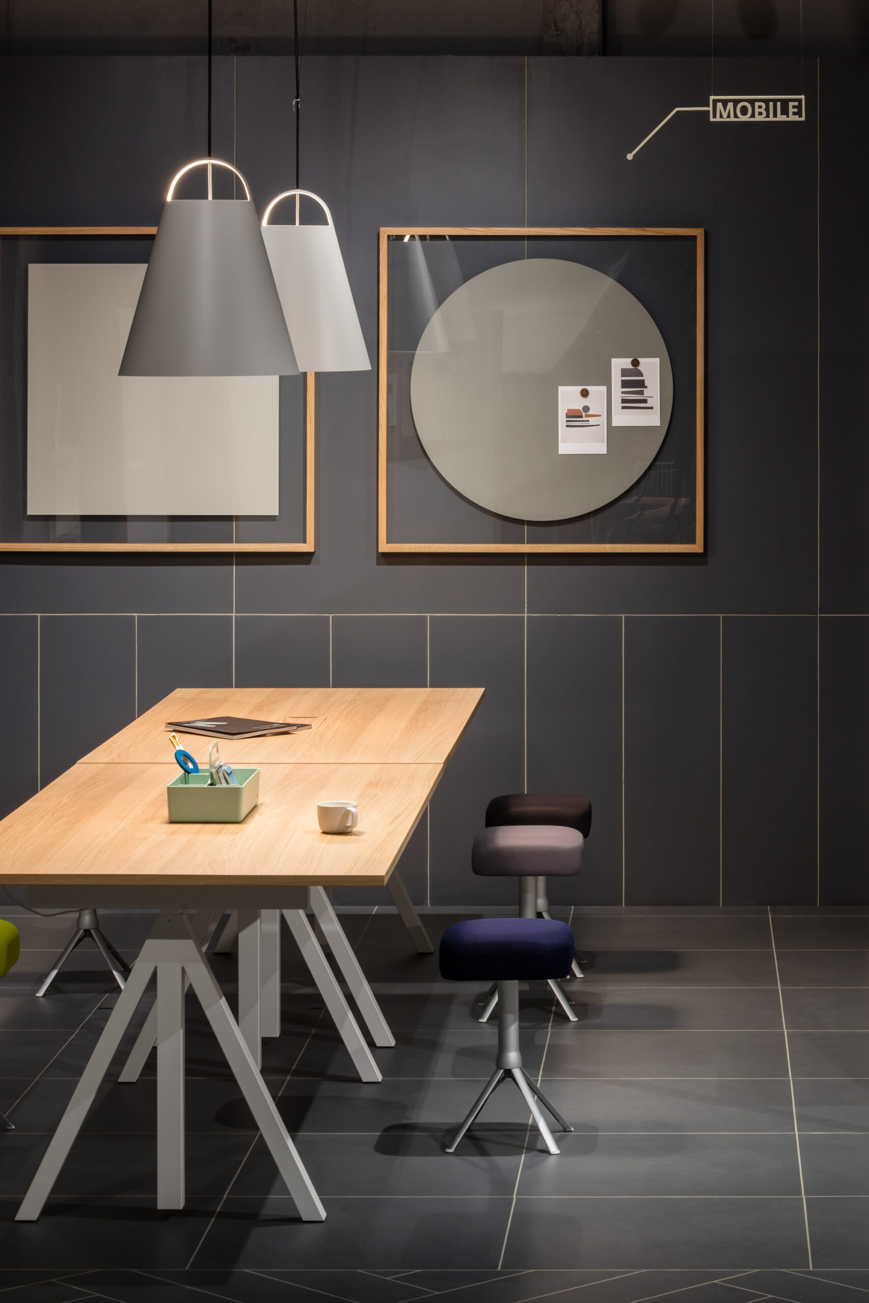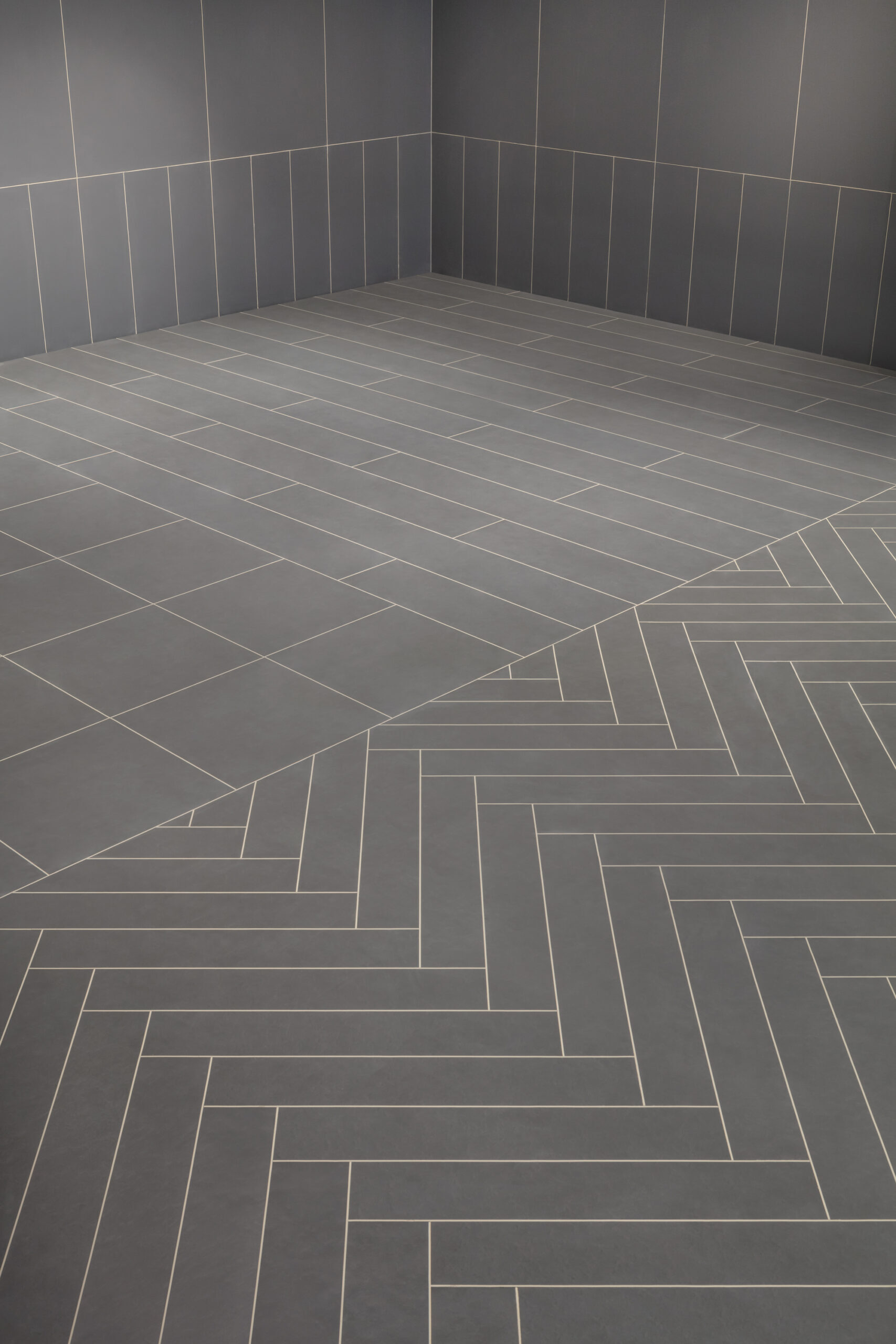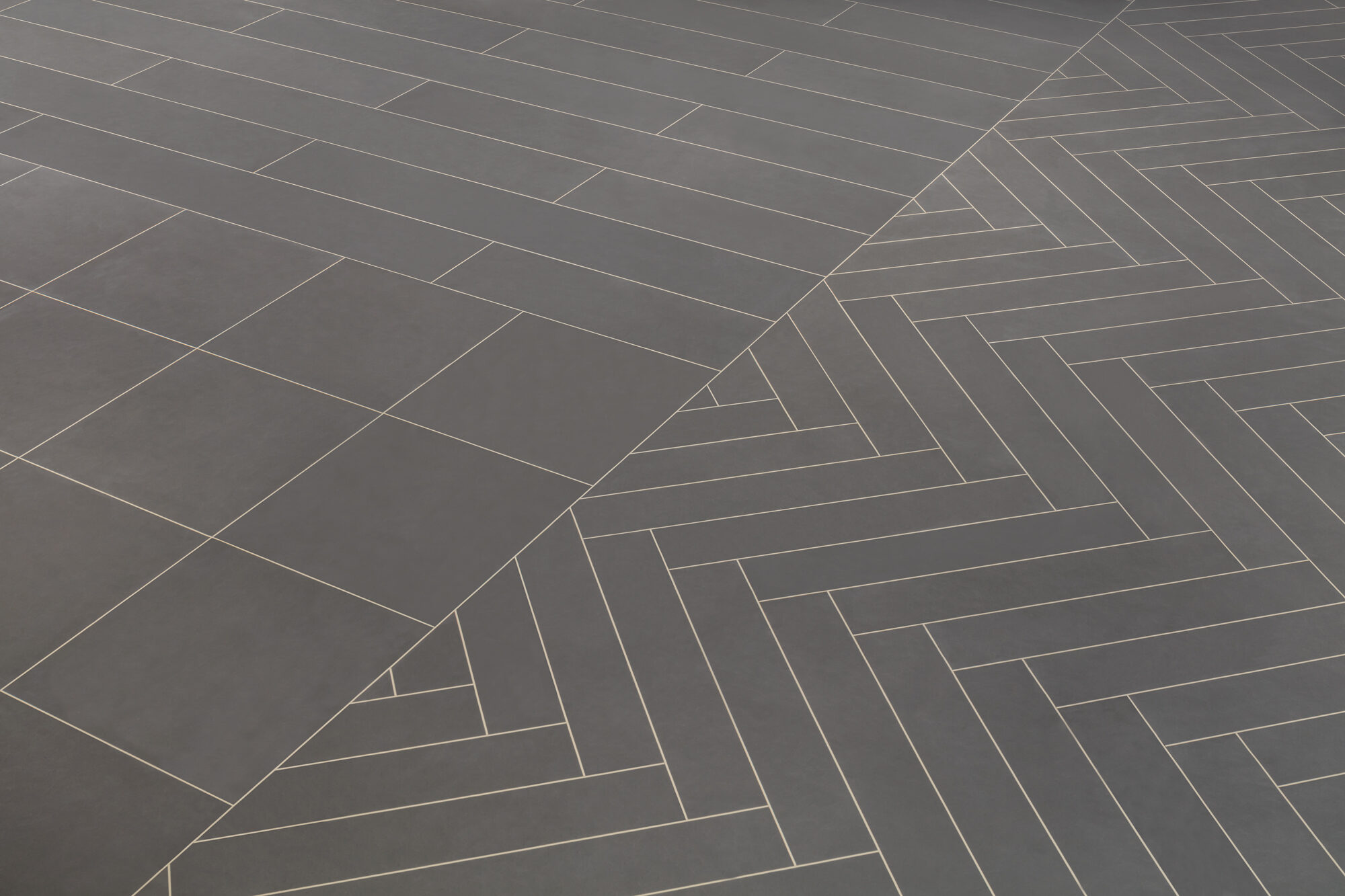 そこで、マットなダークグレーの面材にベージュの目地材を収めることで、目地が生み出す「線」に表情を与え、特徴づけることを試みました。これにより、タイルやヘリンボーンフローリングの気配が感じられます。一つの大きな空間をグラフィカルな線によって、緩やかに分節しました。また、床と壁に施された「線」は、メジャーのような役割も果たし、オフィスに設置した際のスケール感が捉えやすくなるという実用性も備えています。ショールームにおける実務的な確認作業を楽しいコミュニケーションに変換することを目指しました。