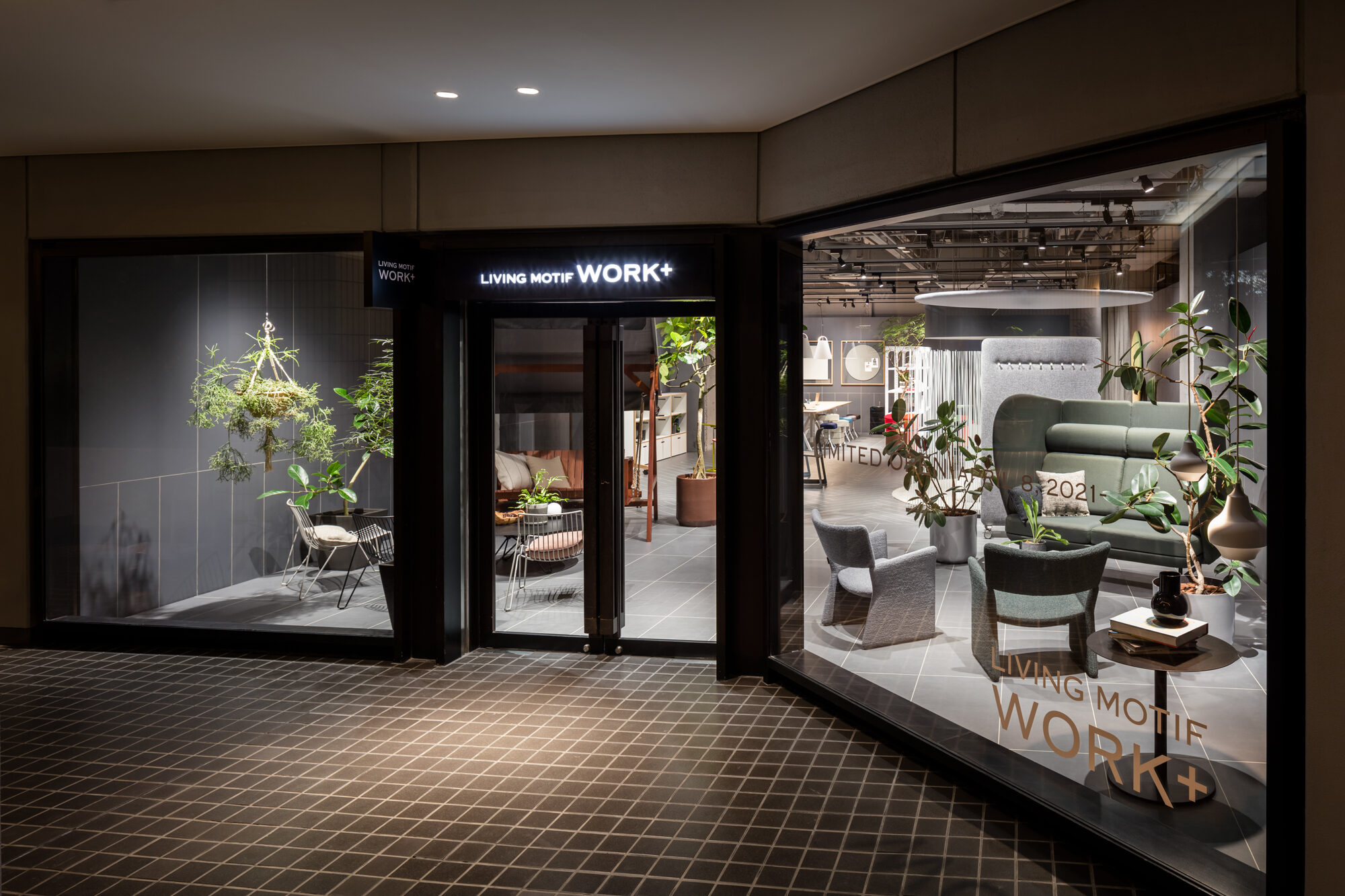 LIVING MOTIF WORK+は、インテリアショップであるLIVING MOTIFが運営するショールームです。複数のブランドを取り扱う強みを活かし、オフィス家具を組み合わせたワークユニットによる空間を提案します。ワークユニットによって作り出される空間の魅力を伝えるため、ショールーム自体は床と壁のみのミニマルな構成としています。ワークユニットはあらゆるインテリアに合うように考えられたものです。そのため、ショールームとしては、素材によってイメージが偏ってしまわないようにしながらも、オフィス空間を想起しやすいような工夫が必要だと考えました。
