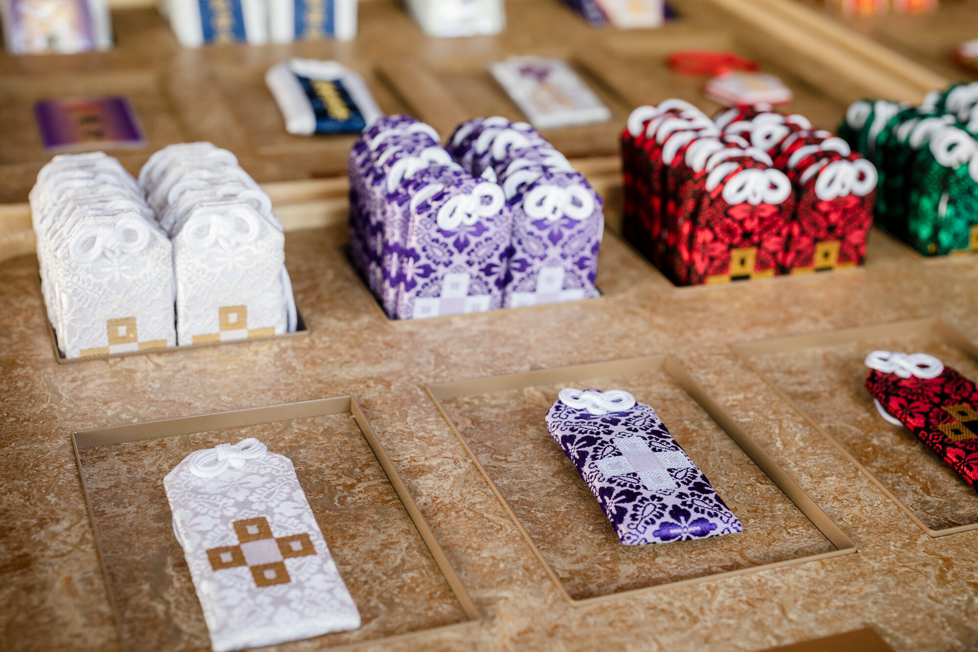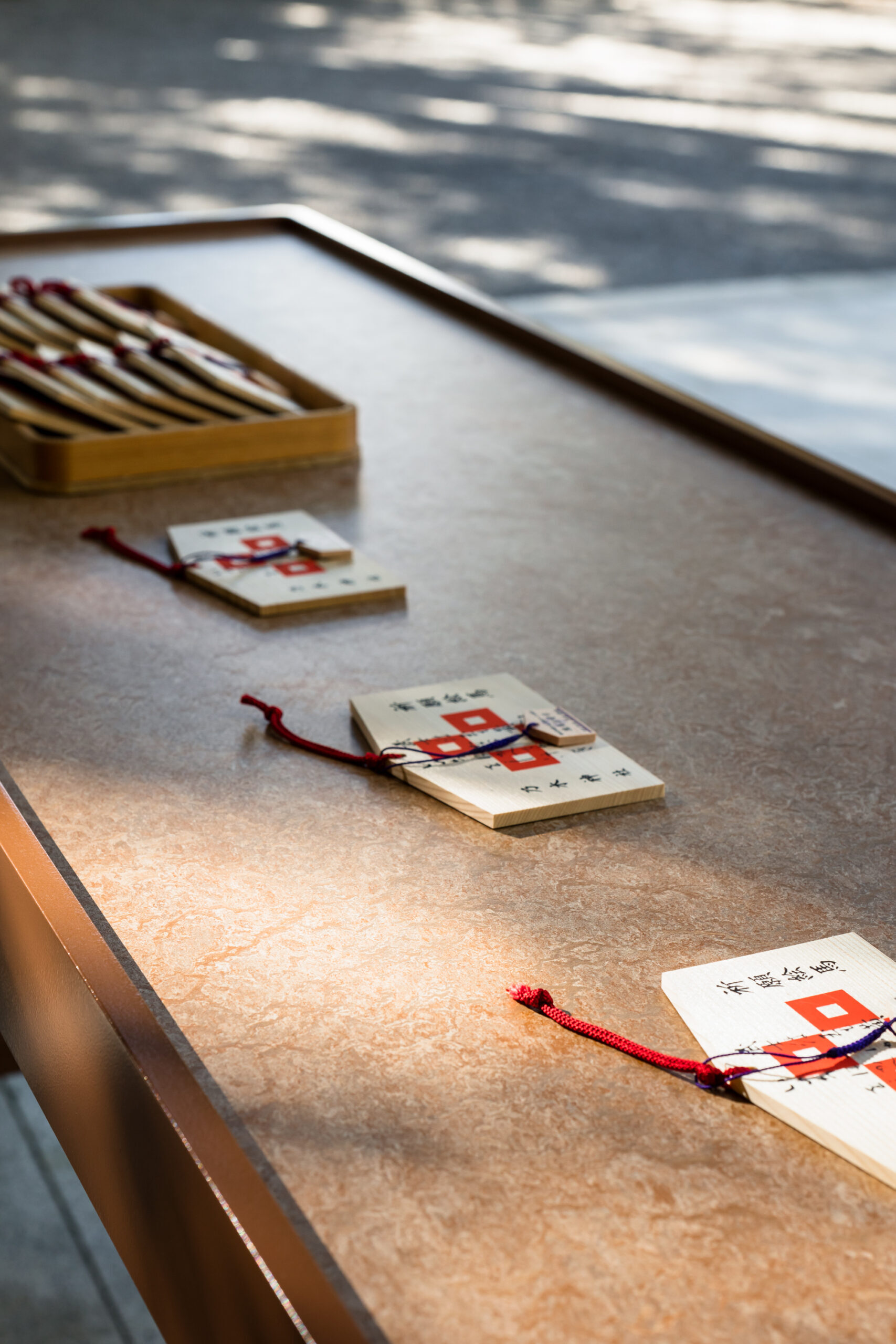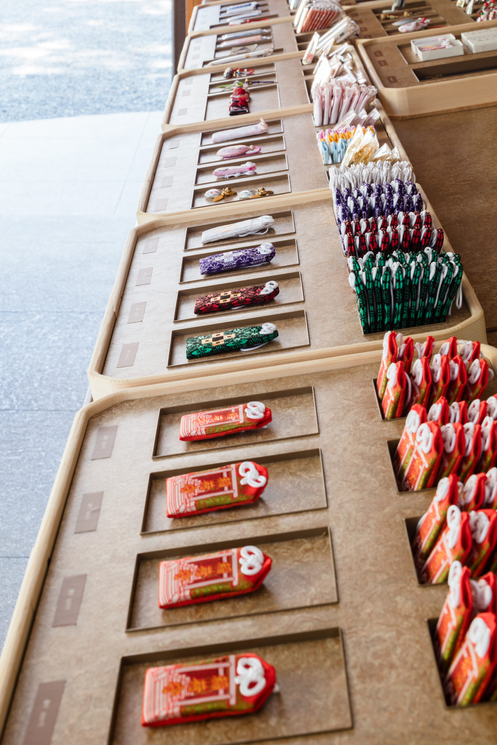また、季節や催しによって可変性の高い空間であることも重要であった為、既製のキャスター付き工作台と組み合わせることで、コストを抑えつつも、機能的な什器を実現しました。折敷を用いたお守りを陳列する為の什器は、多様なお守りの種類を把握しやすいように、 カテゴリーで分類しました。サインには、おみくじの引き方が理解出来るグラフィックを施し、より多くの方に文化を伝えていくことが出来る授与所を目指しました。