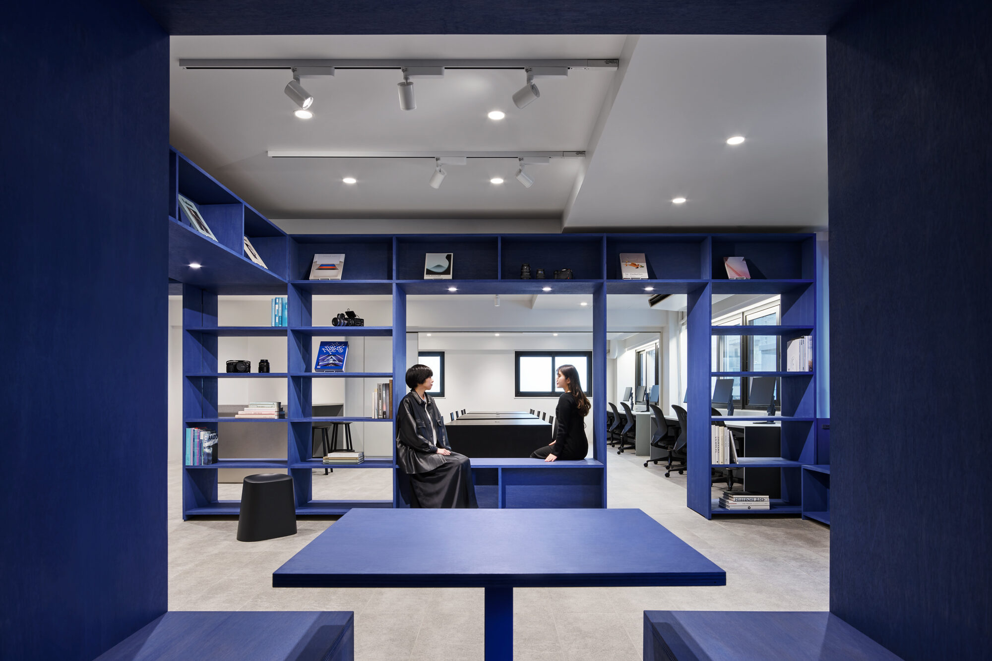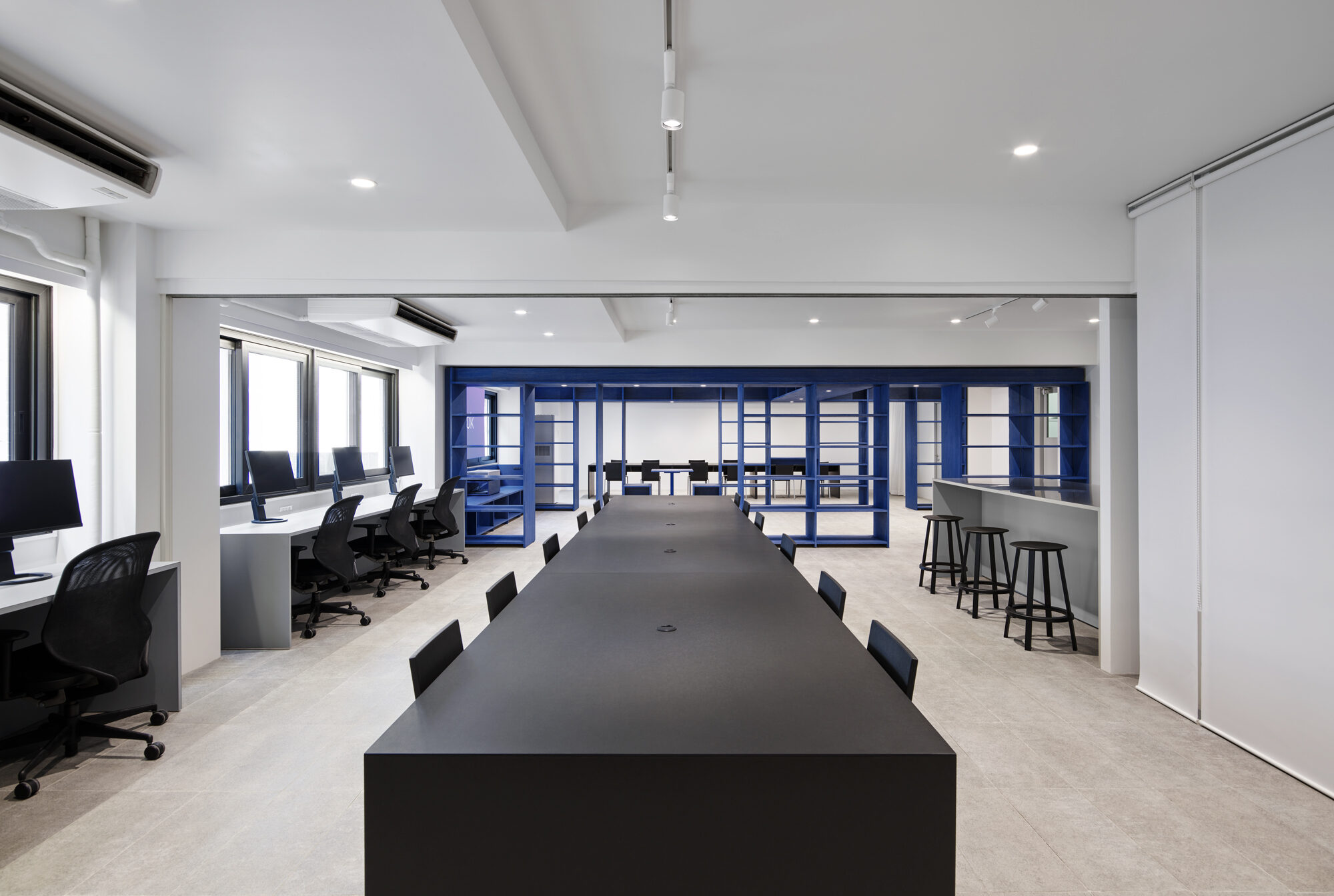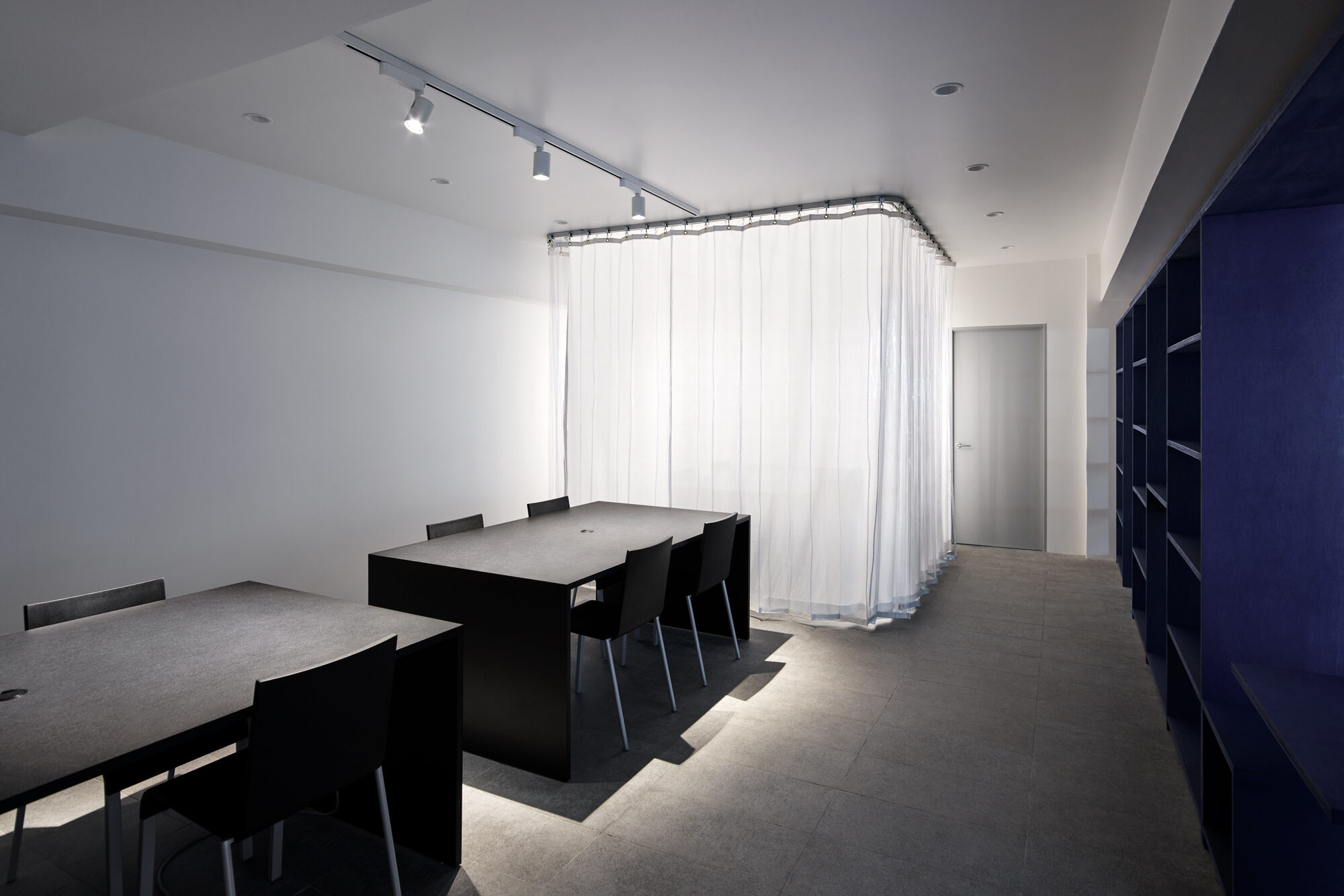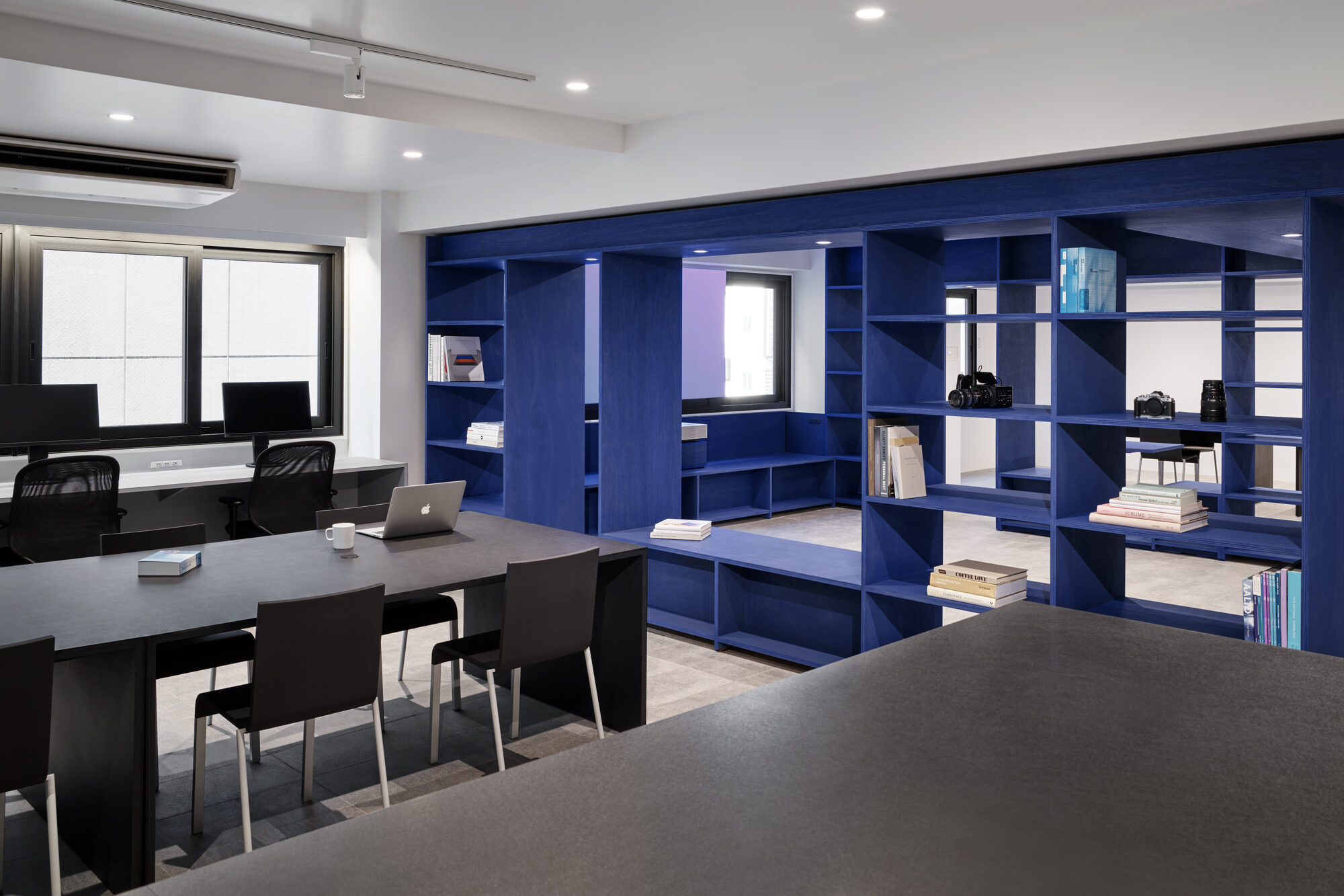 また、業務内容や気分に寄り添うために、家具には様々なマテリアルを採用しています。本棚はVookのビジョン・ビジュアルから着想を得たブルーで染色し、木の質感が感じられる触覚性の高い仕上げにしています。耐久性の高い紙材の積層によるワークテーブル、リノリウムによるモニターカウンター、キッチンの延長として活用されるステンレスのハイカウンターなど、ブルーを引き立てるモノトーンの家具にもそれぞれ質感を与えました。また、ライブラリーやミーティングルームに設けたサインはアルミ染色によるもので、ビジョン・ビジュアルを実写化したような表現を目指しました。リモートワークが普及した現代においては、1つの空間で複数のオンラインミーティングが同時に行われるシーンも増えてきました。この状況に対応するため、オンラインミーティングに活用できる居場所をオフィス全体に散りばめています。また、一時的に距離を確保できるように、分割可能なテーブル、可動壁、防音性の高いカーテンブースなどを積極的に取り入れています。そして、それらが視覚的に意識されないように整理し、クリエイティビティを補完する整然とした余白と、出社が楽しみになる「集うための場」の実現を目指しました。