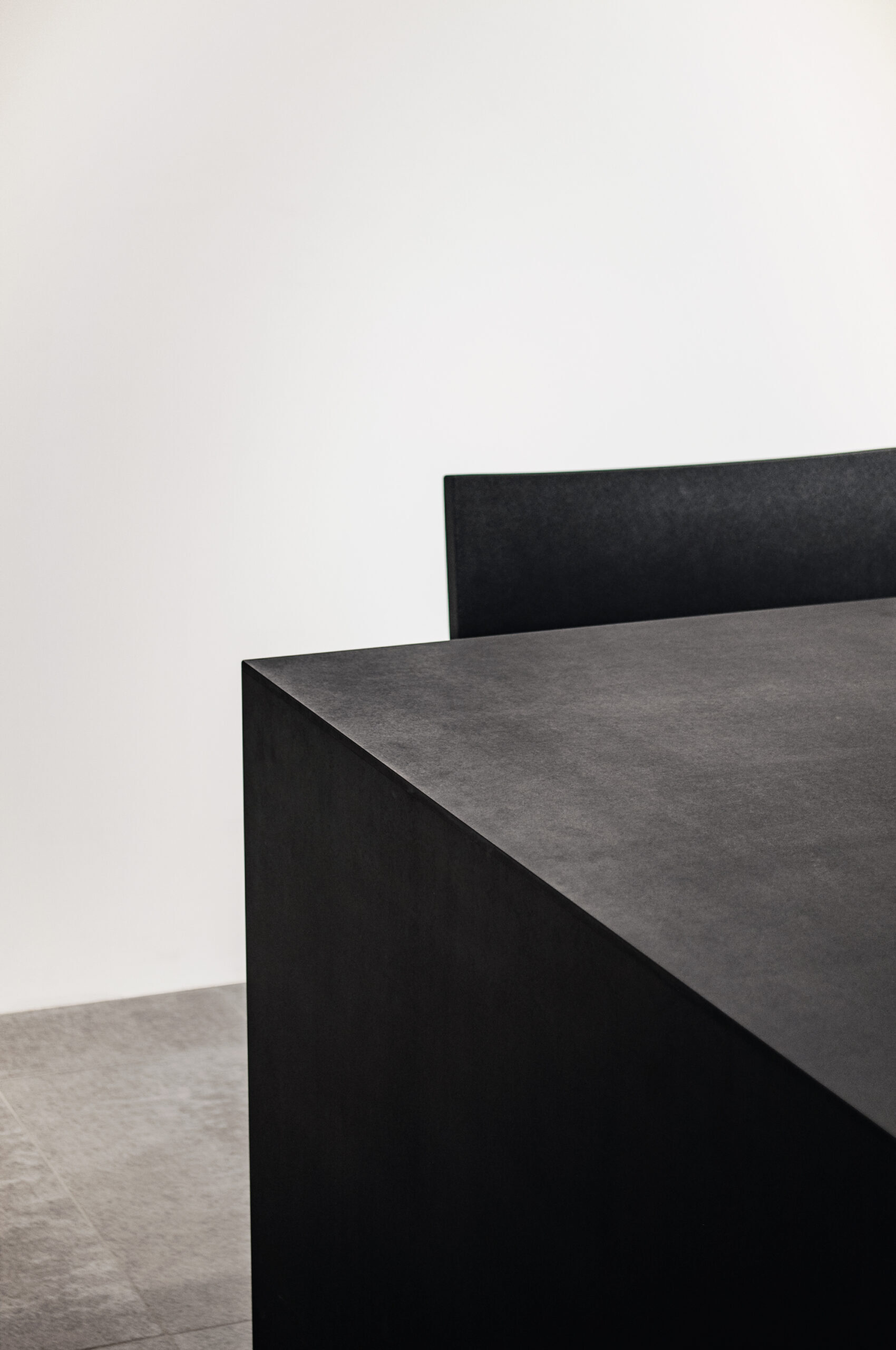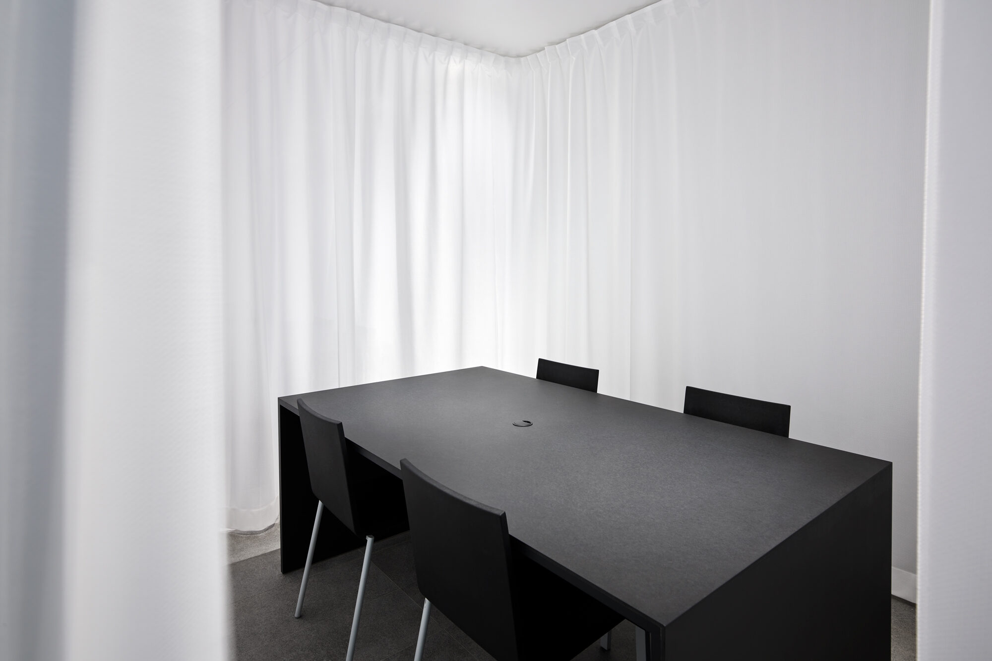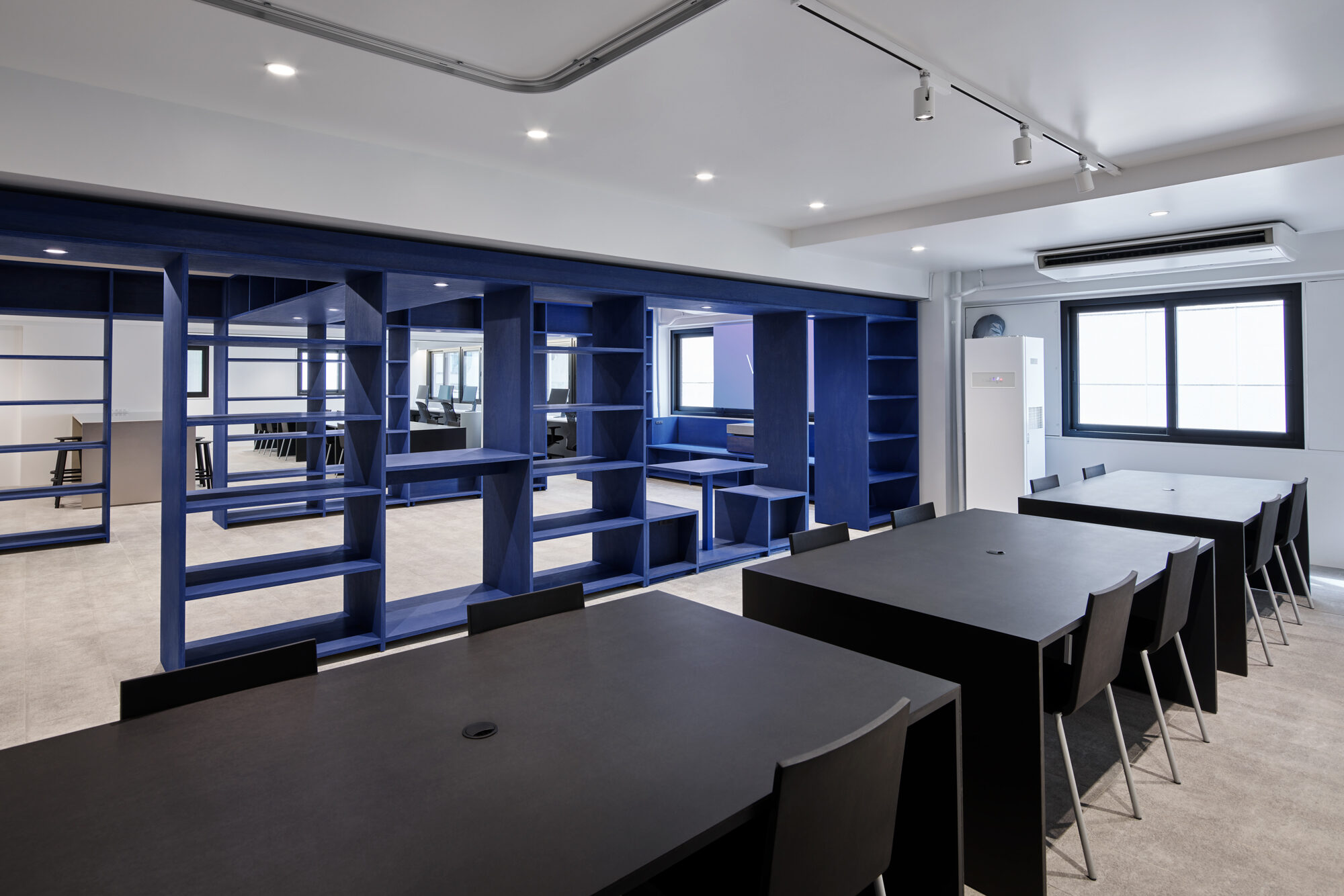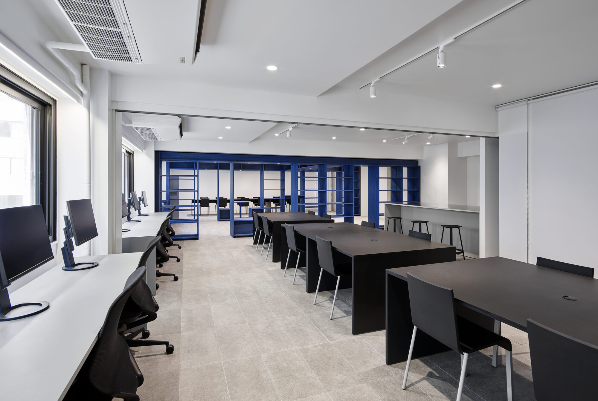 また、業務内容や気分に寄り添うために、家具には様々なマテリアルを採用しています。本棚はVookのビジョン・ビジュアルから着想を得たブルーで染色し、木の質感が感じられる触覚性の高い仕上げにしています。耐久性の高い紙材の積層によるワークテーブル、リノリウムによるモニターカウンター、キッチンの延長として活用されるステンレスのハイカウンターなど、ブルーを引き立てるモノトーンの家具にもそれぞれ質感を与えました。また、ライブラリーやミーティングルームに設けたサインはアルミ染色によるもので、ビジョン・ビジュアルを実写化したような表現を目指しました。リモートワークが普及した現代においては、1つの空間で複数のオンラインミーティングが同時に行われるシーンも増えてきました。この状況に対応するため、オンラインミーティングに活用できる居場所をオフィス全体に散りばめています。また、一時的に距離を確保できるように、分割可能なテーブル、可動壁、防音性の高いカーテンブースなどを積極的に取り入れています。そして、それらが視覚的に意識されないように整理し、クリエイティビティを補完する整然とした余白と、出社が楽しみになる「集うための場」の実現を目指しました。