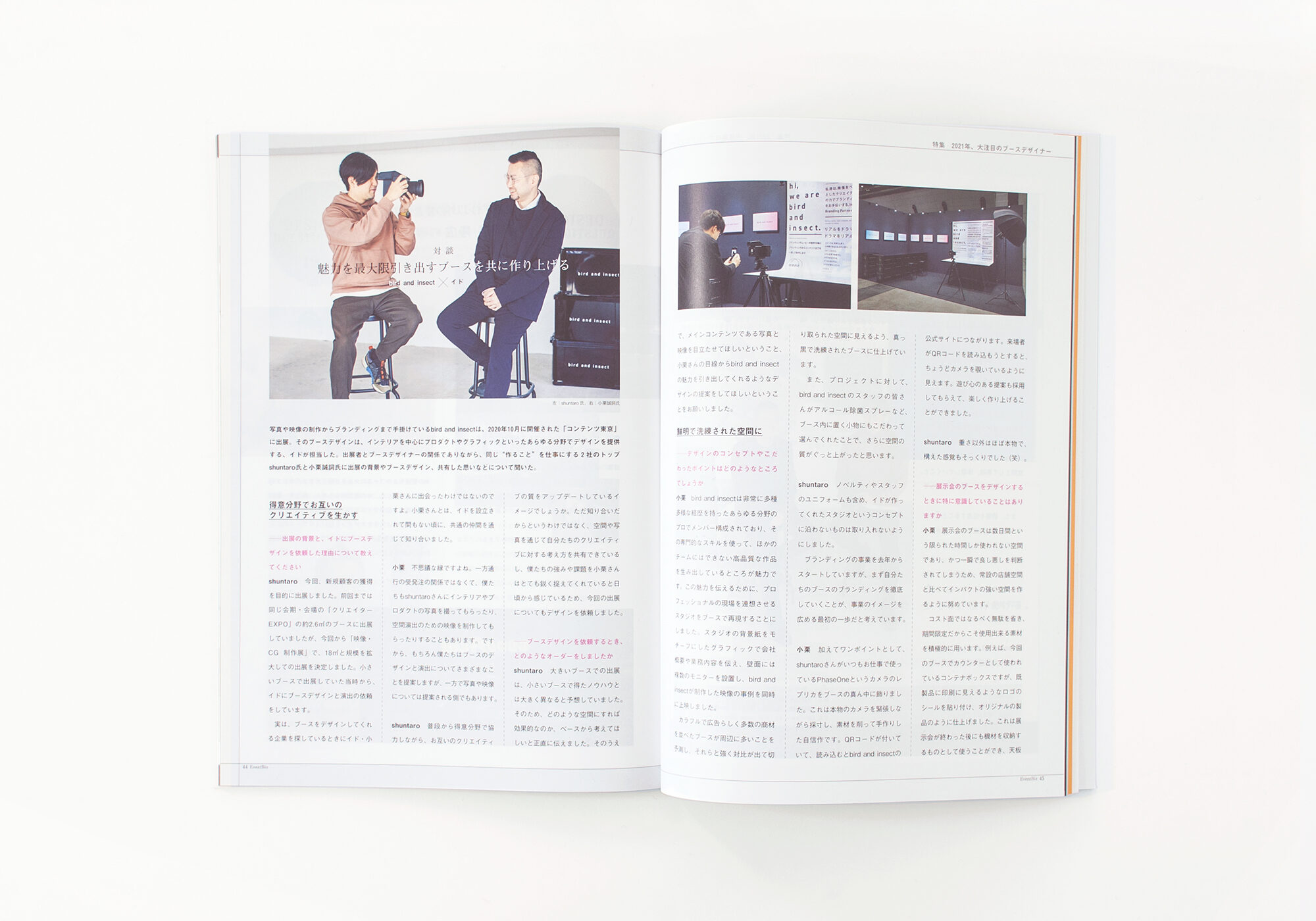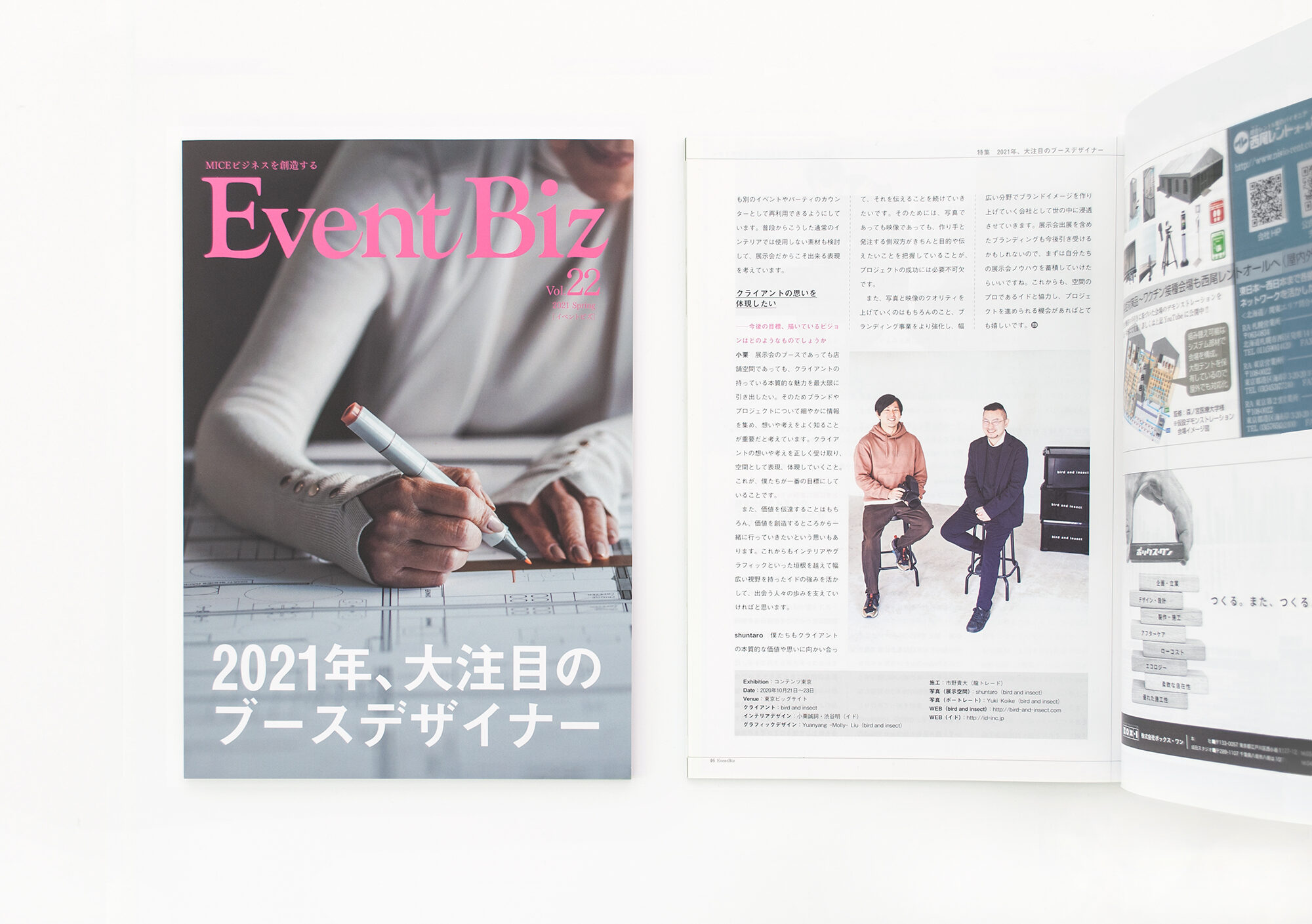 ブースデザインについてのインタビューが Event Biz Vol.22 に掲載されました。bird and insect代表のshuntaroさんとbird and insect Exhibition -CONTENTS TOKYO 2020- の展示ブースデザインについて、クリエイティブなコラボレーションについてお話させていただきました。