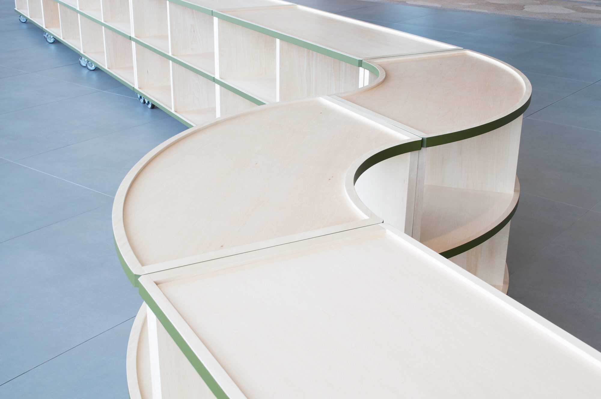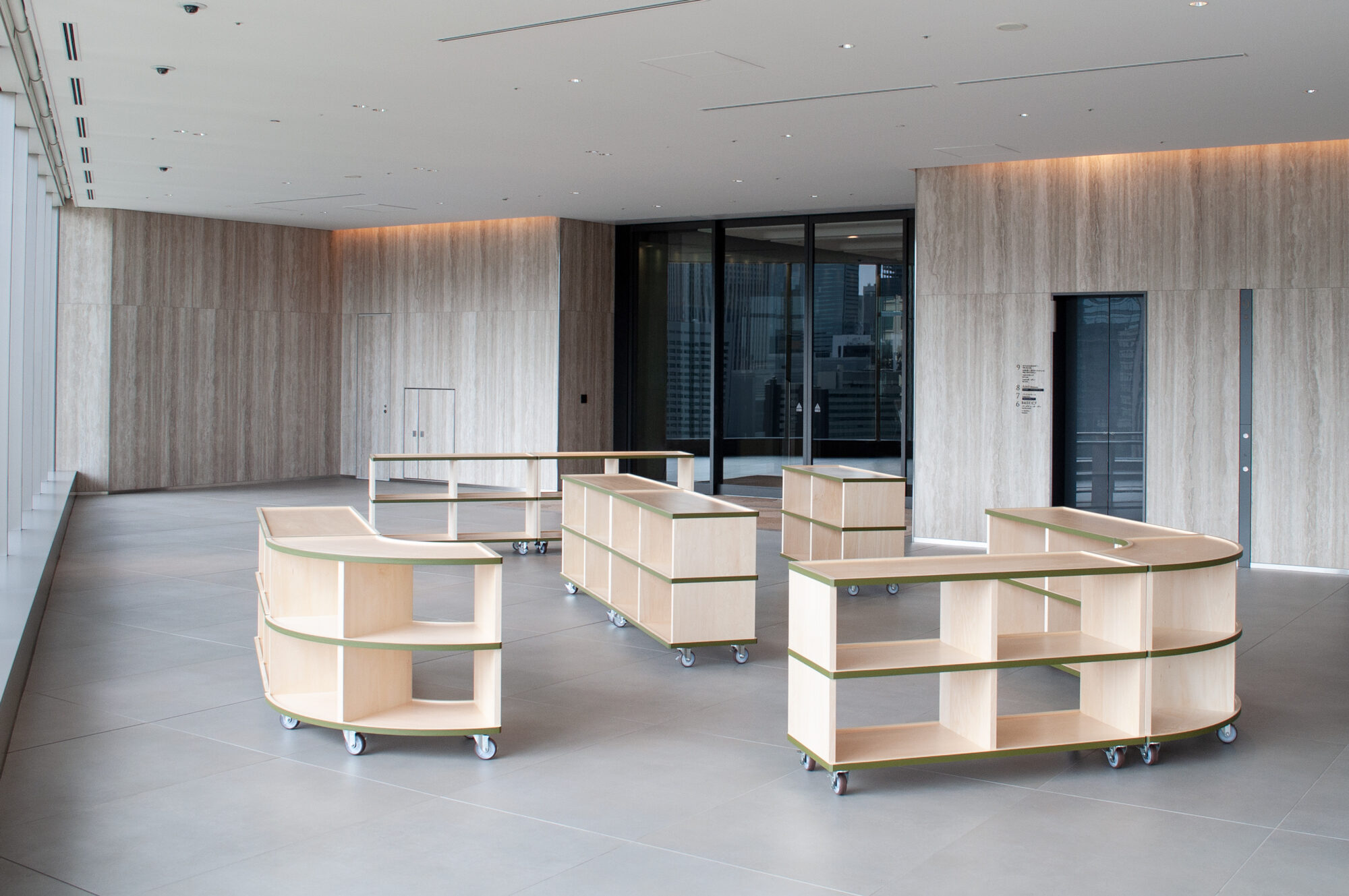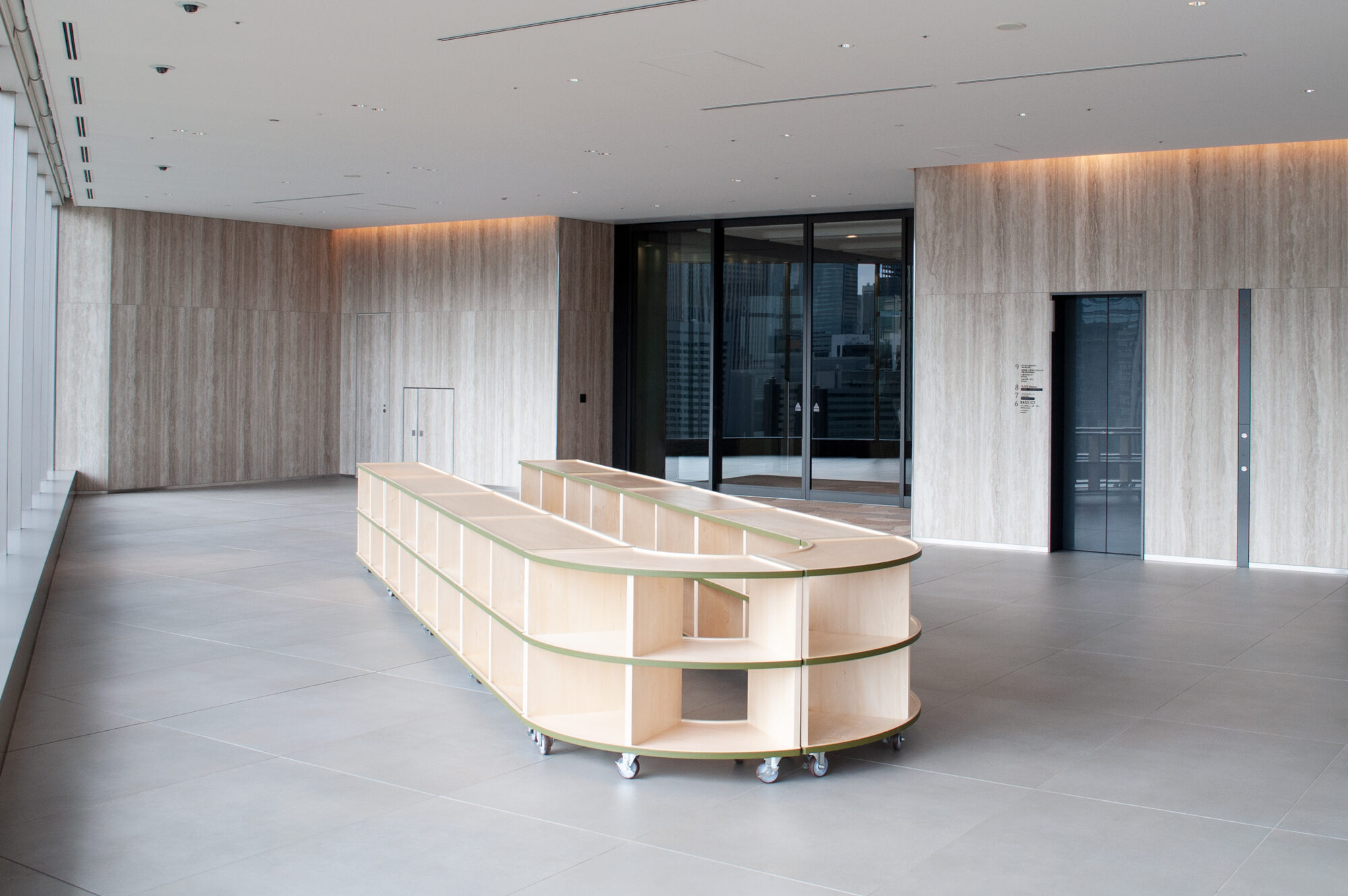 Various pop-up events for office workers are held on the office floor of Tokyo Midtown Hibiya. This furniture is designed to be able to be freely connected and rearranged to accommodate a variety of events. Although there are only two types, straight and curved, a new space is created each time by combining them.