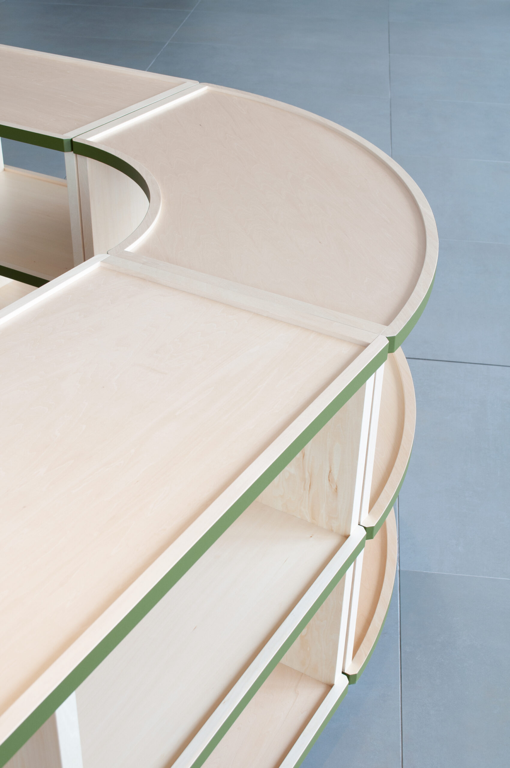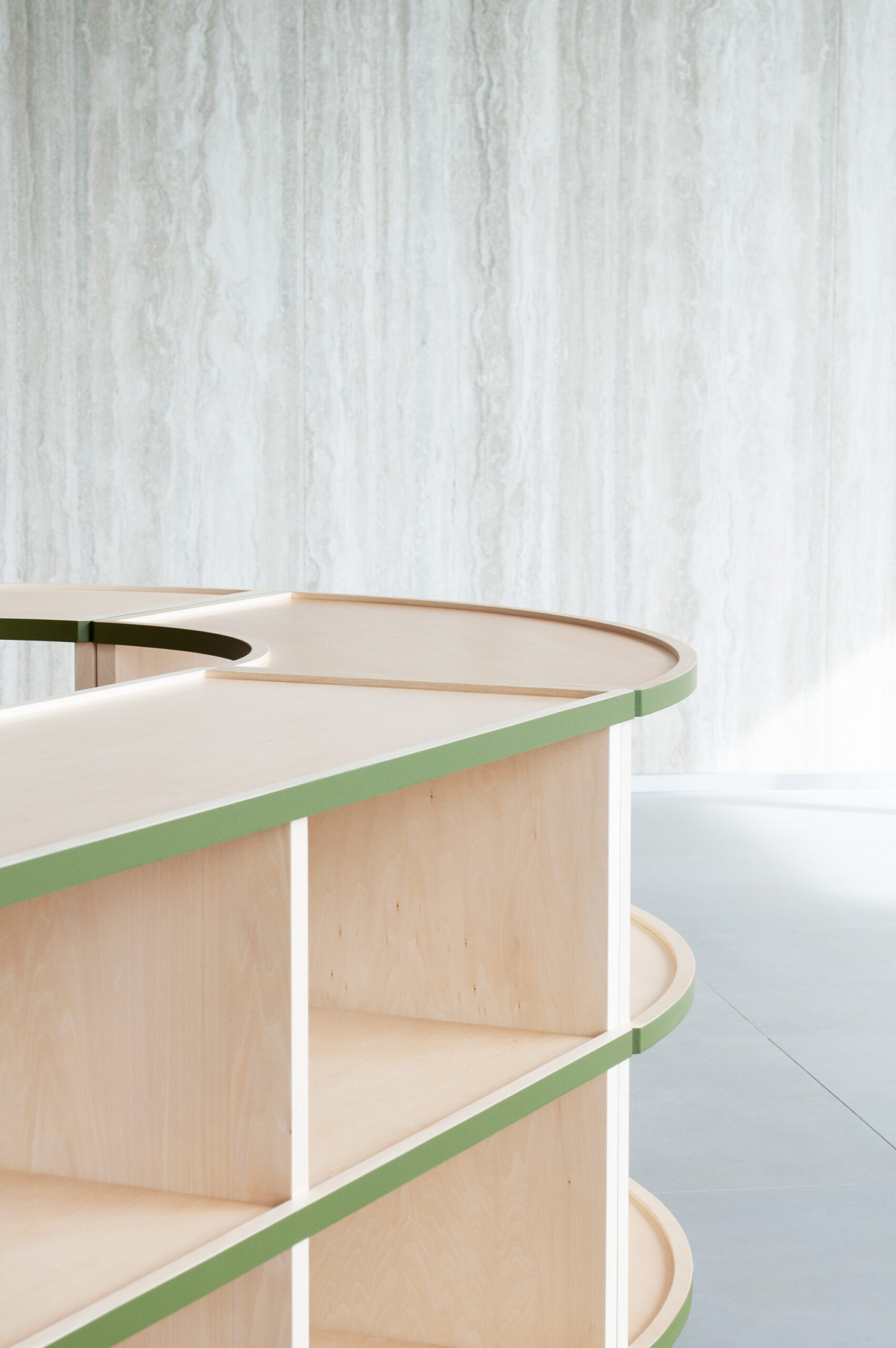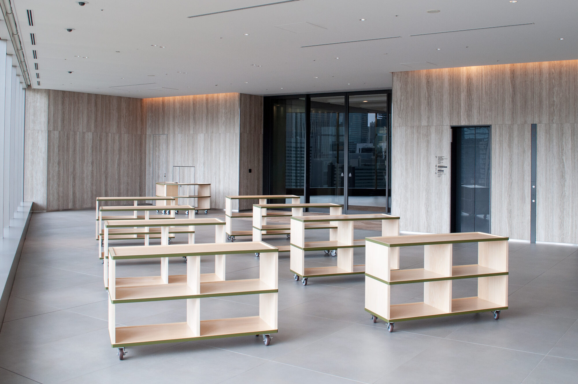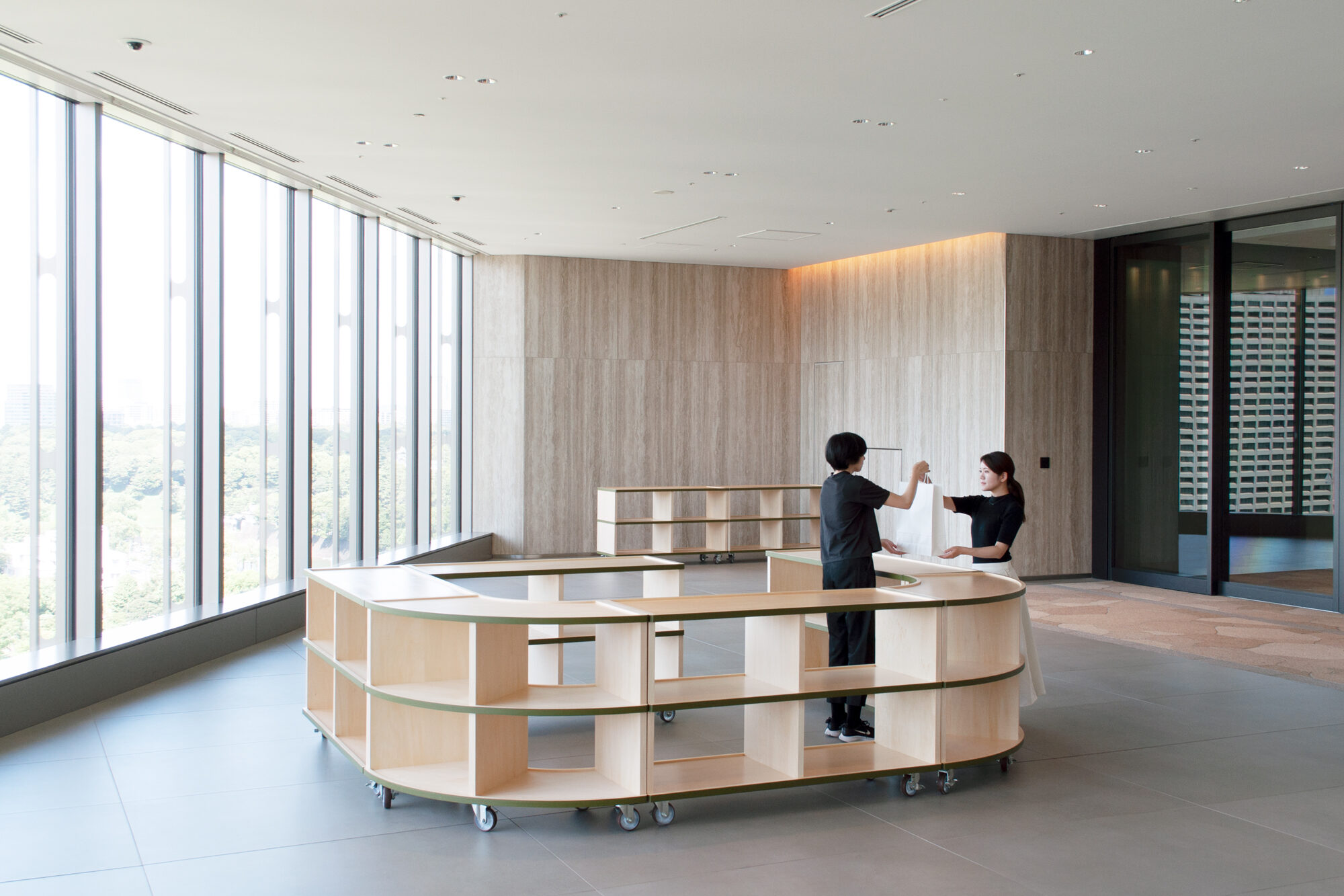 The edges of the wooden furniture have green lines reminiscent of nearby Hibiya Park. The green line emphasizes the connection of the shelves. As a result, the fluidity of space increases. The vertical members are set back slightly to emphasize the flow of the horizontal plane. In addition, the shelves are shaped like a tray with a slight recess to prevent items on display from falling. We responded to the high-quality atmosphere of the facility’s environment with a series of detailed innovations.