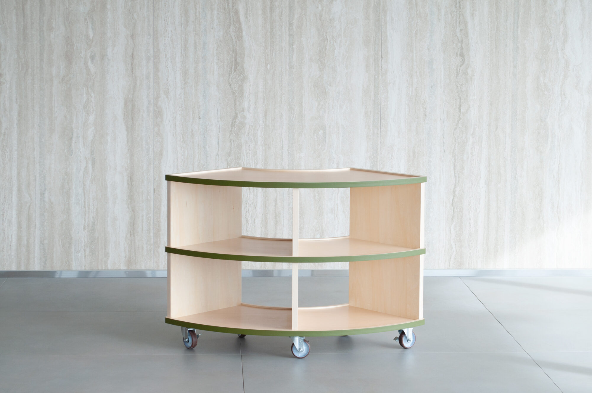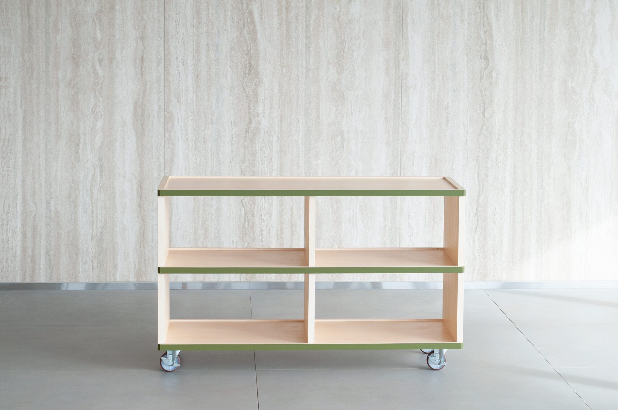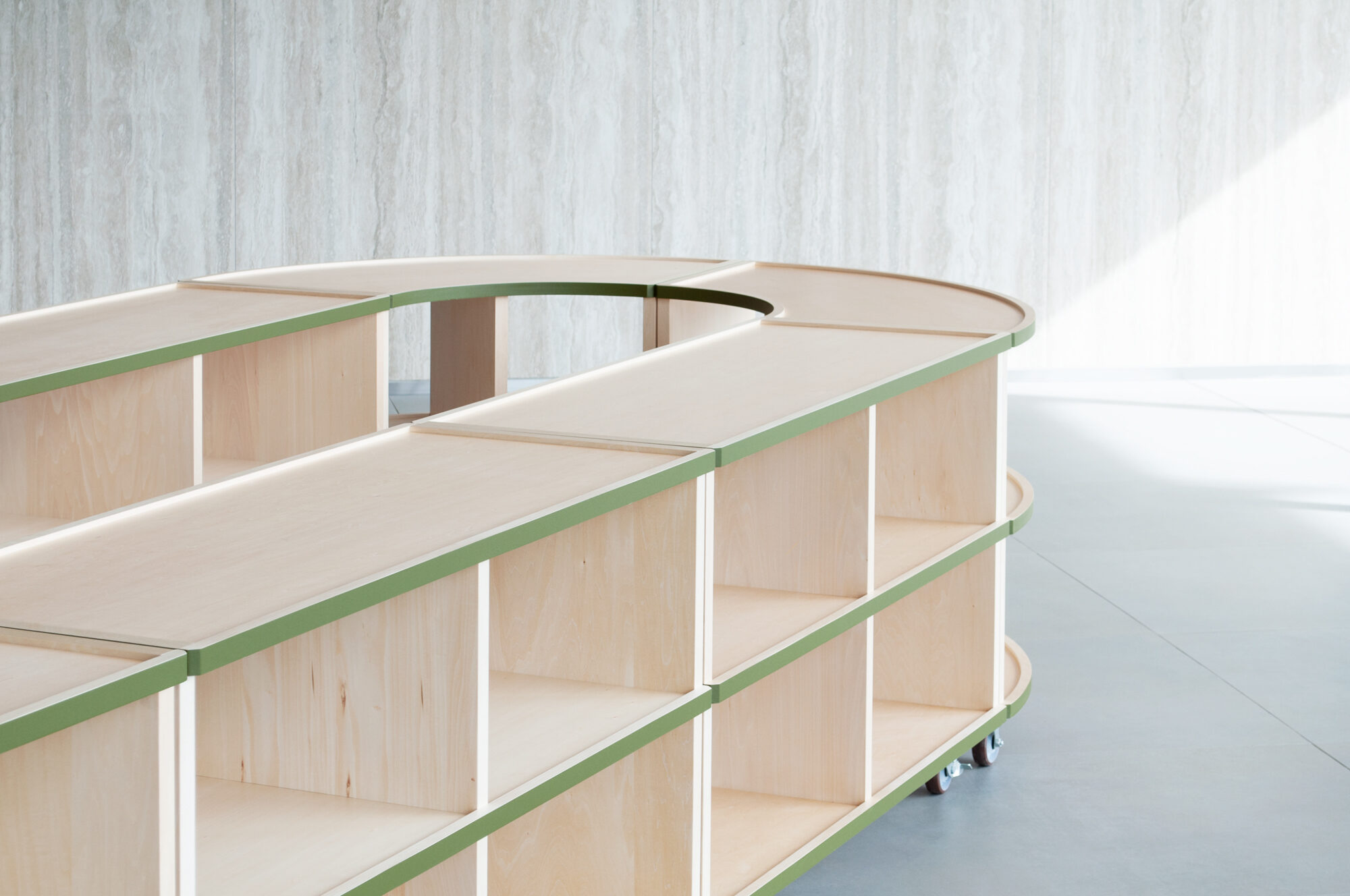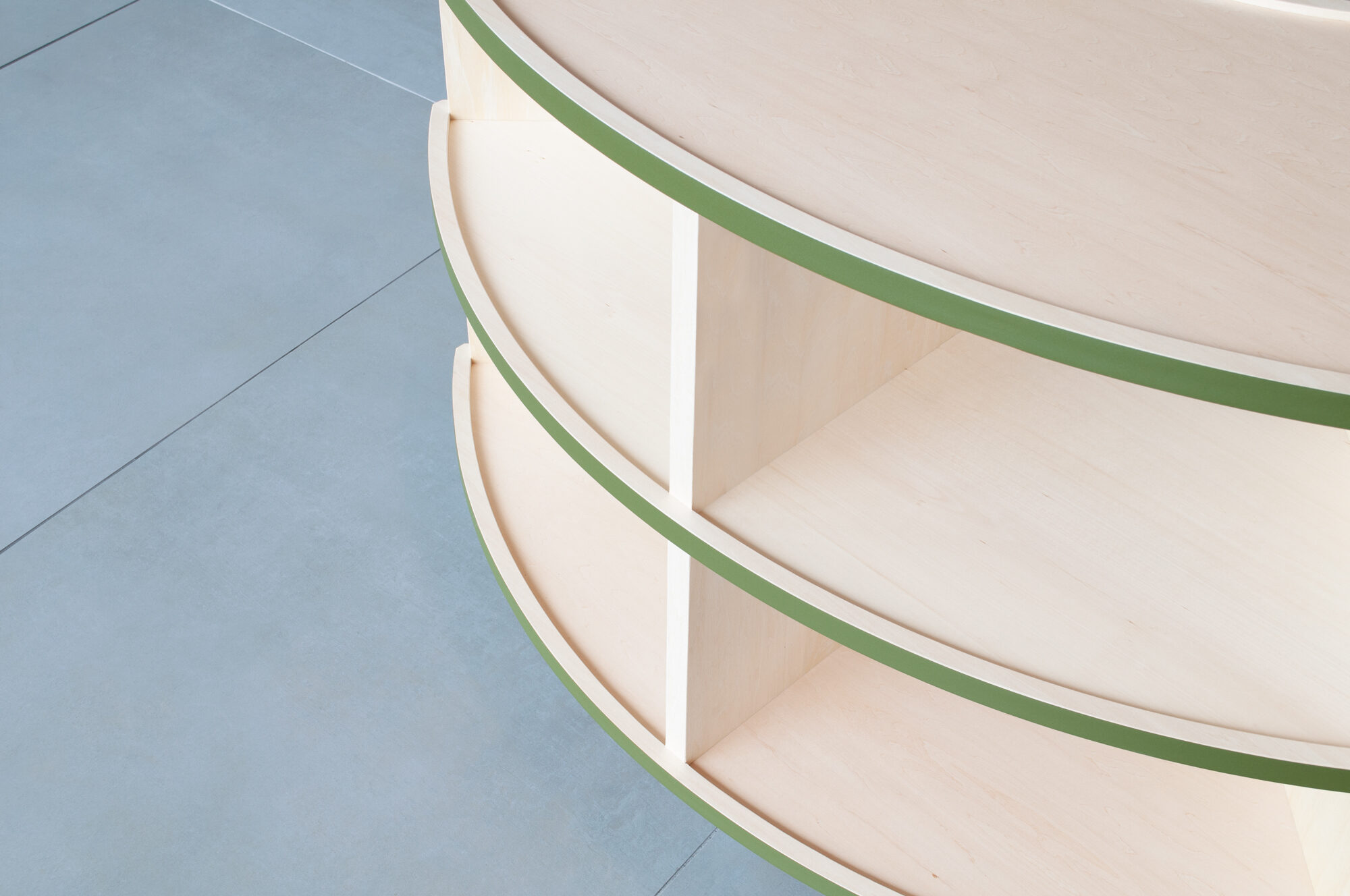 The edges of the wooden furniture have green lines reminiscent of nearby Hibiya Park. The green line emphasizes the connection of the shelves. As a result, the fluidity of space increases. The vertical members are set back slightly to emphasize the flow of the horizontal plane. In addition, the shelves are shaped like a tray with a slight recess to prevent items on display from falling. We responded to the high-quality atmosphere of the facility’s environment with a series of detailed innovations.