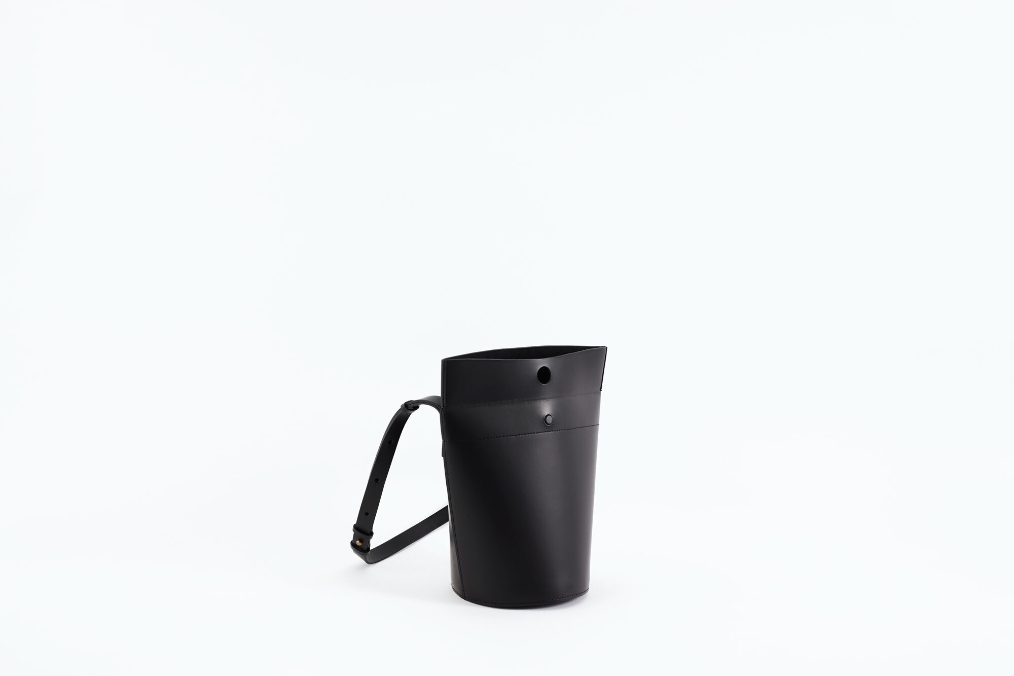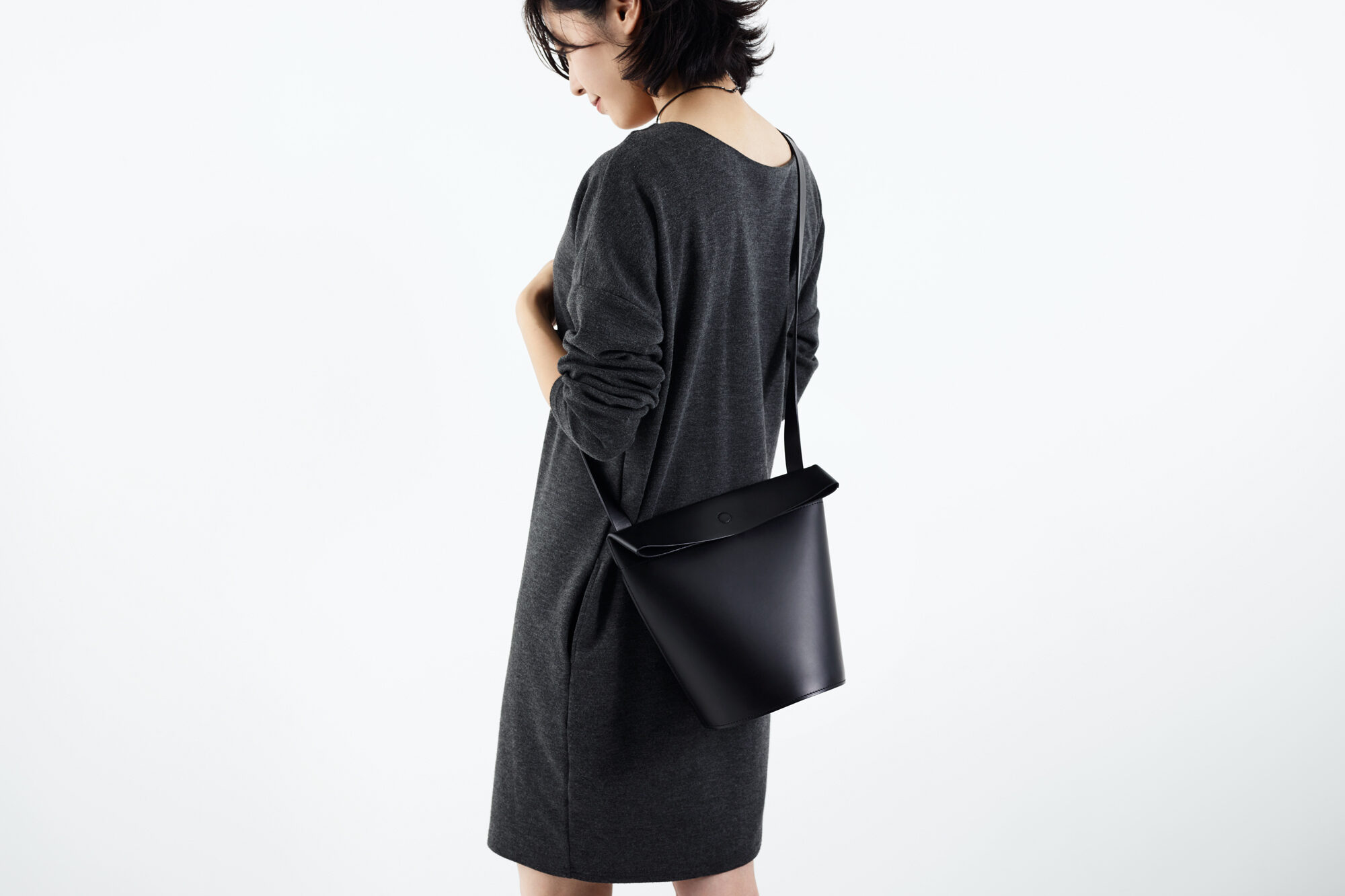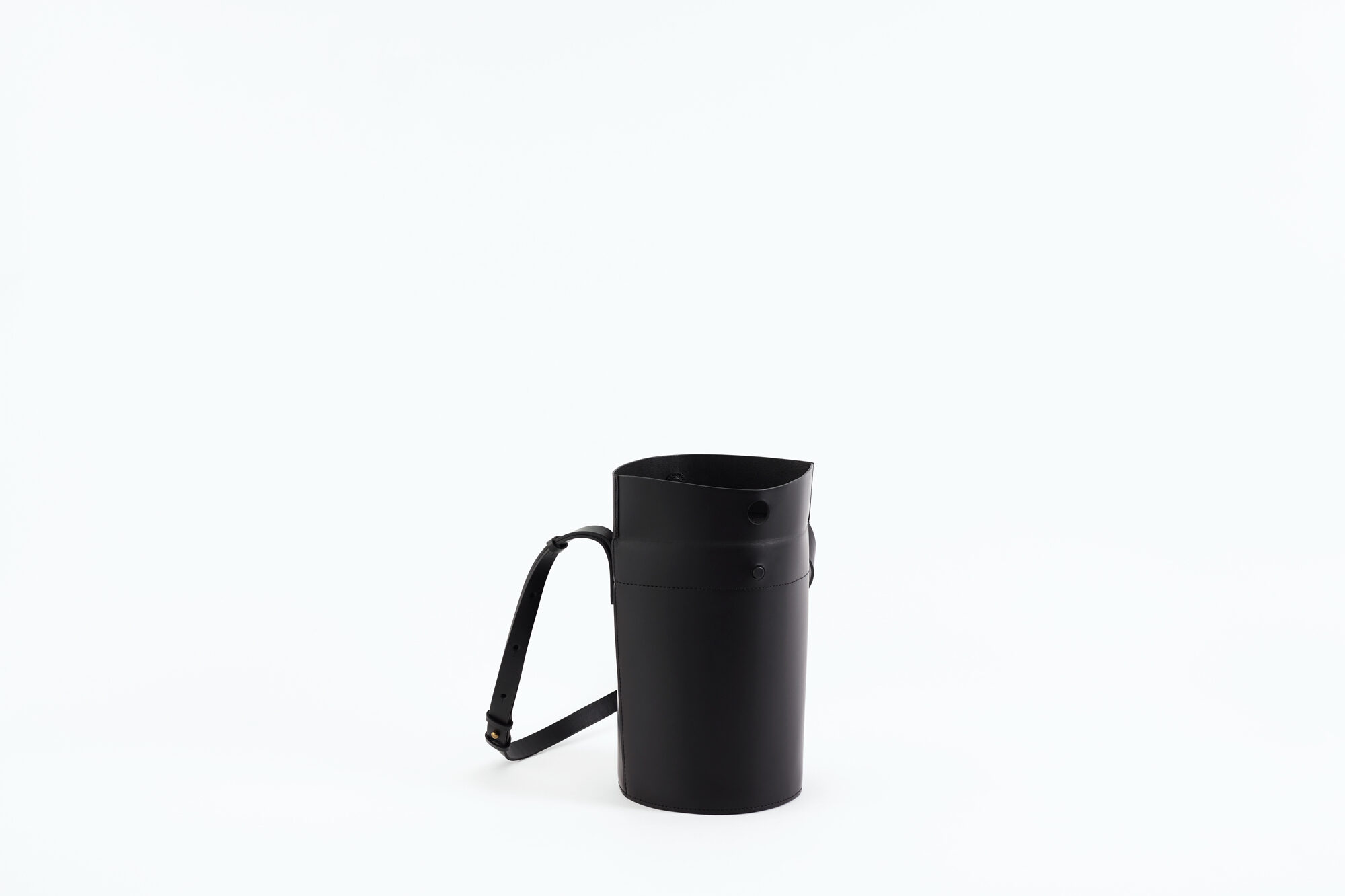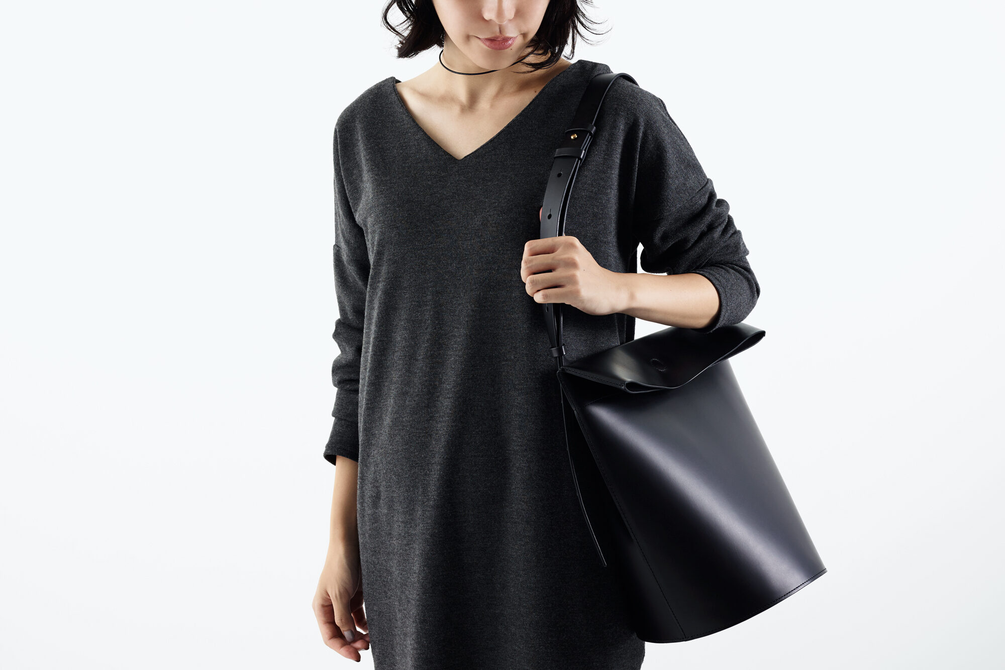 使っている時はもちろん、置かれている時の景色を大切に考えました。円筒の端を折り曲げたような造形は、安定感があり、しっかりと自立します。また、丸底のおかげで中が見やすい作りになっています。マグネットの留め具や持ち手のステッチも丸く仕上げることで、高い強度と統一感が生まれました。