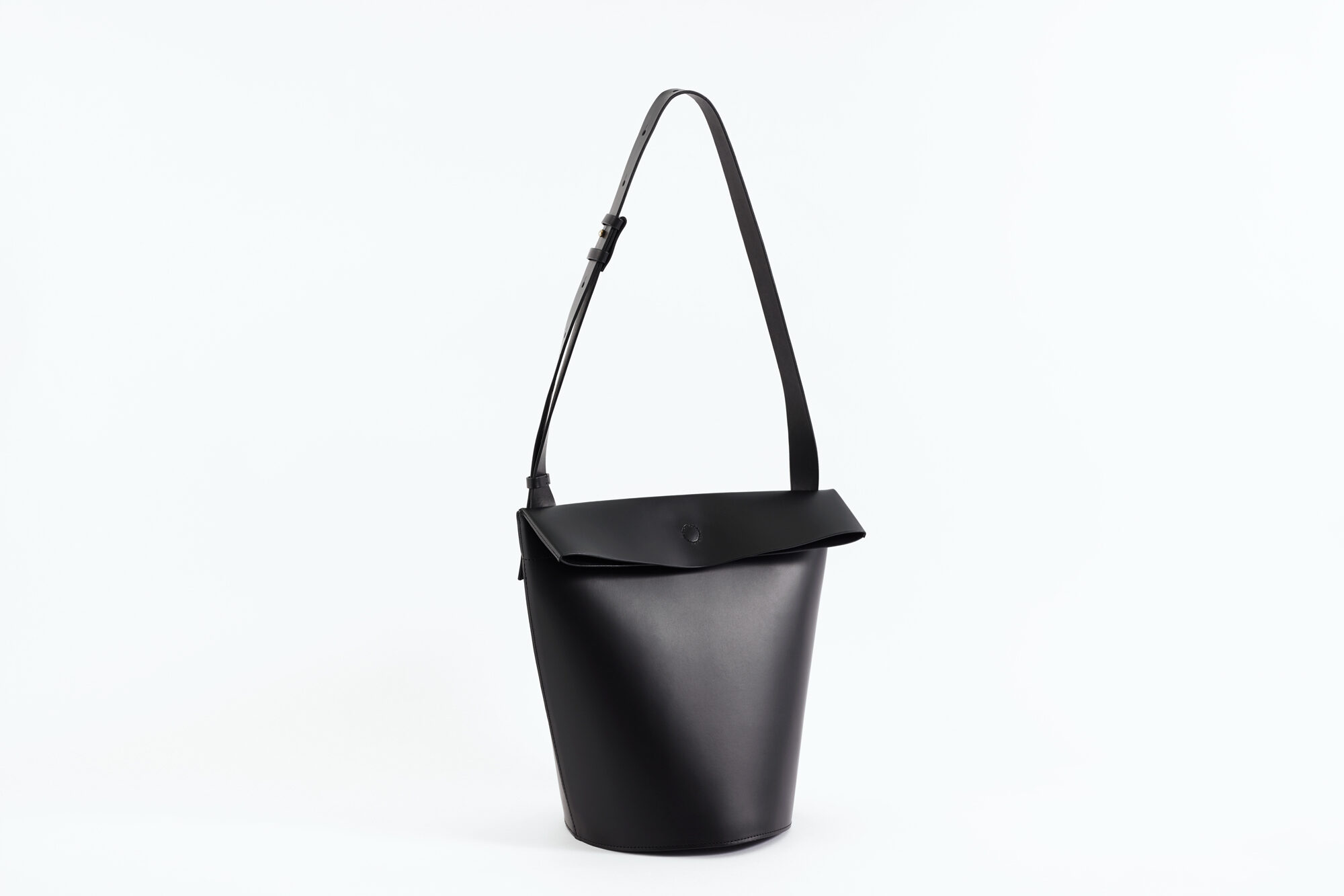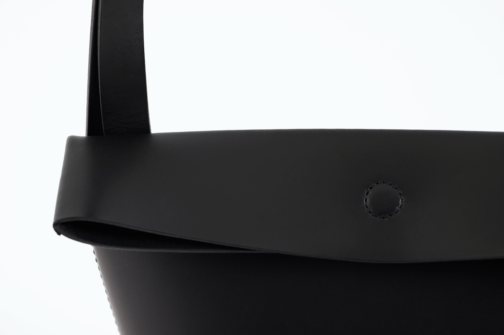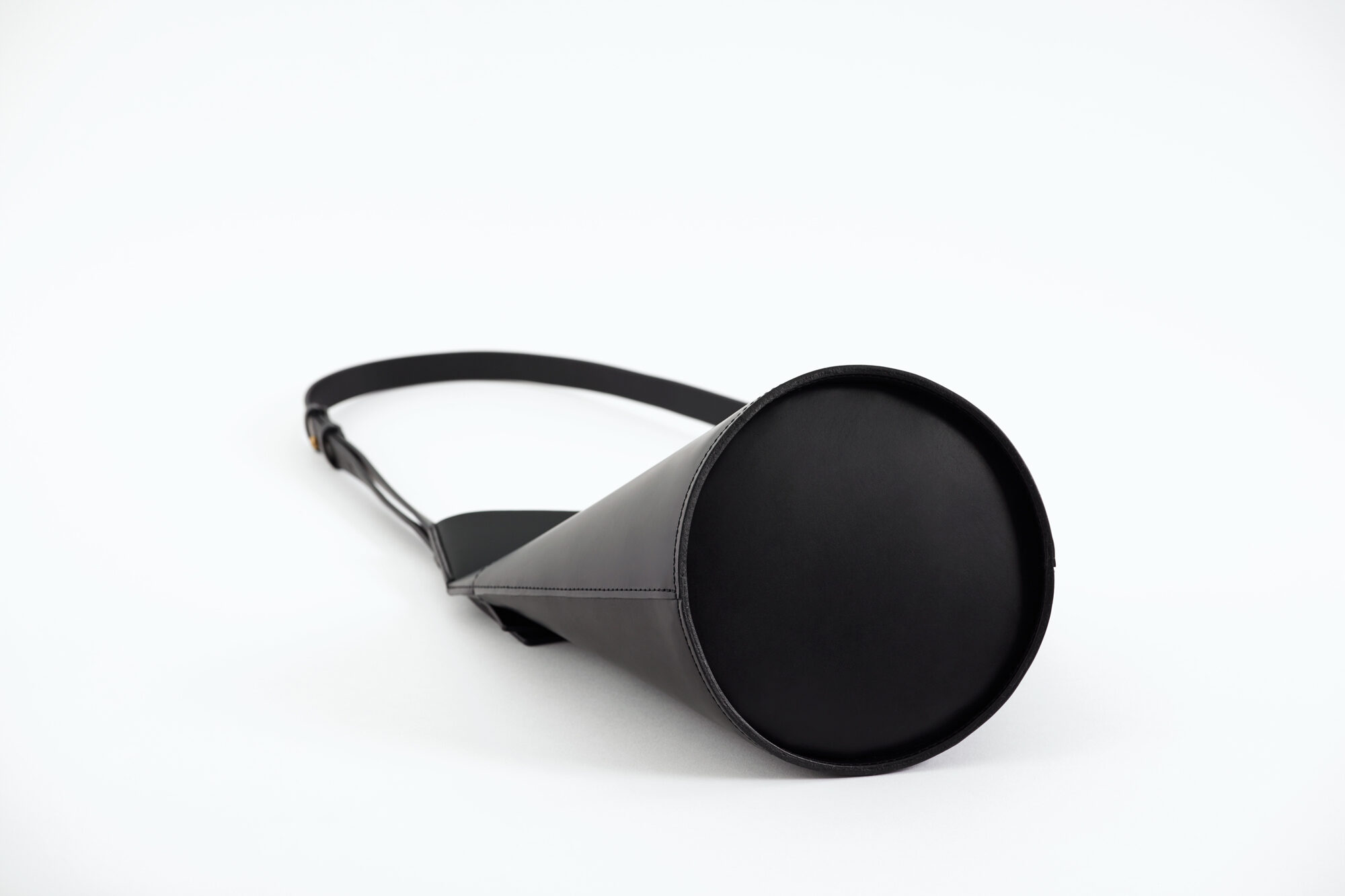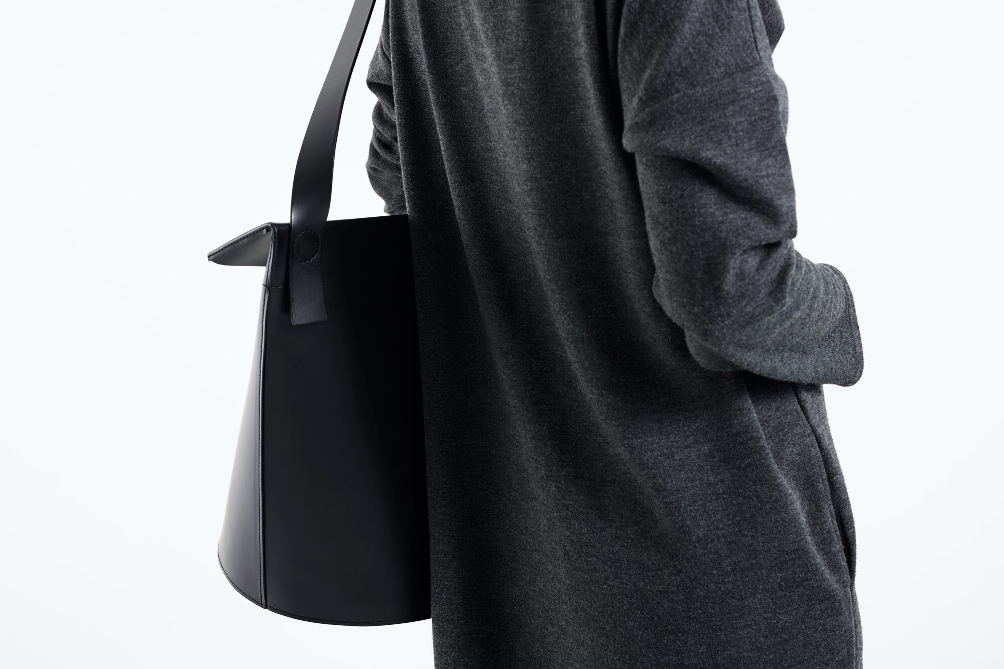 使っている時はもちろん、置かれている時の景色を大切に考えました。円筒の端を折り曲げたような造形は、安定感があり、しっかりと自立します。また、丸底のおかげで中が見やすい作りになっています。マグネットの留め具や持ち手のステッチも丸く仕上げることで、高い強度と統一感が生まれました。