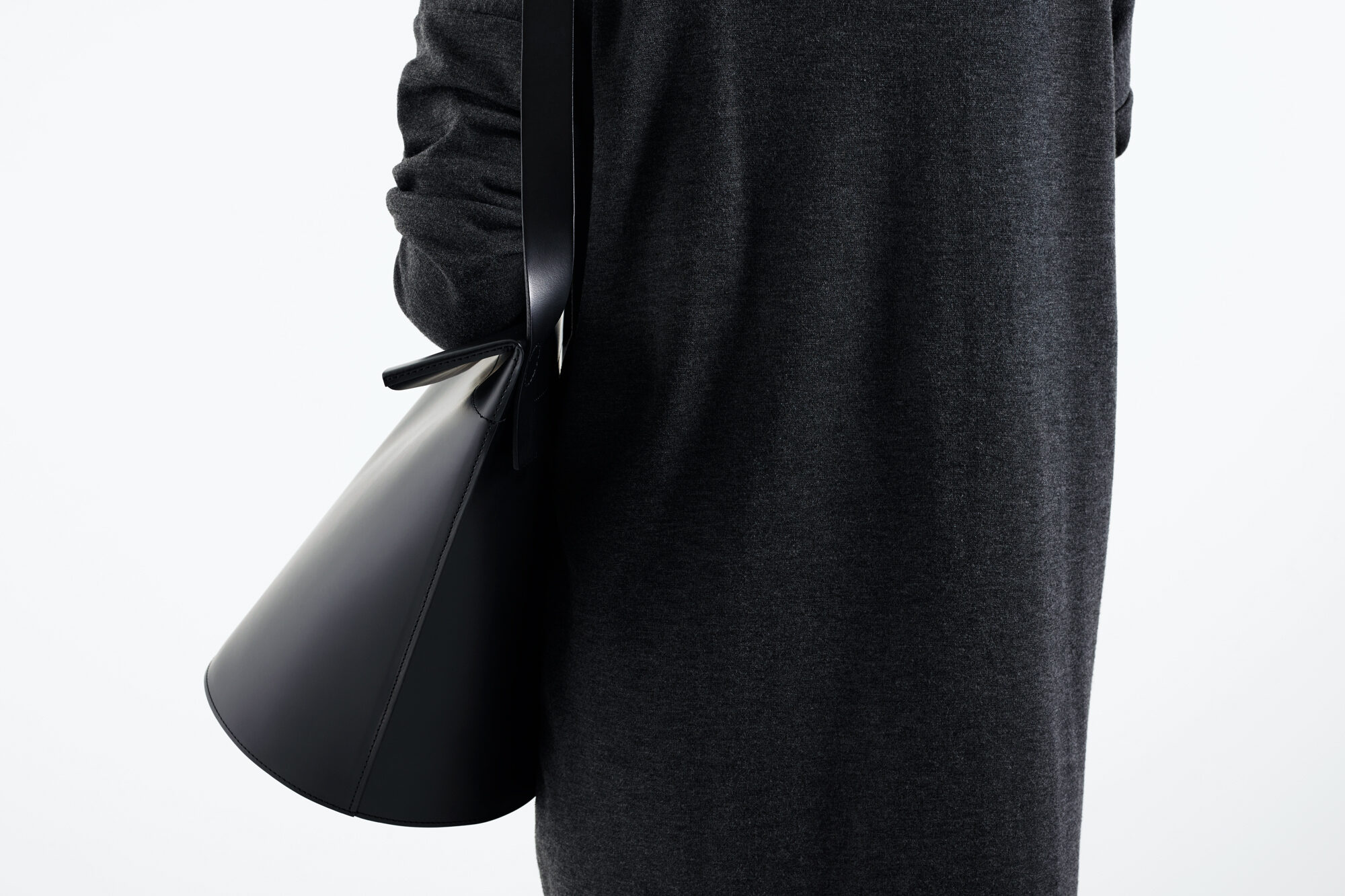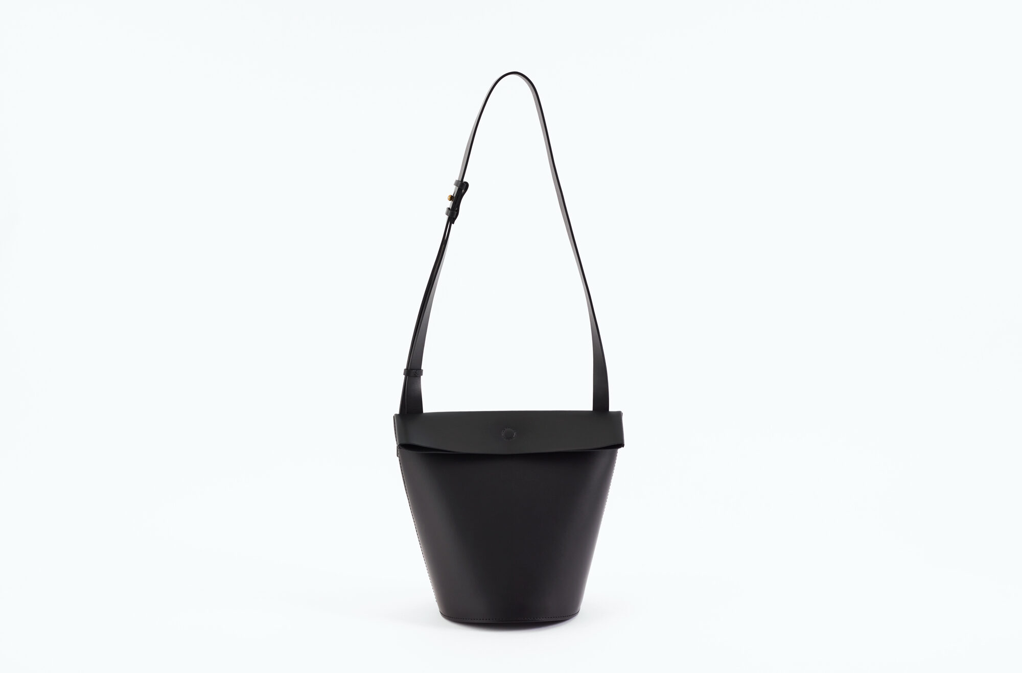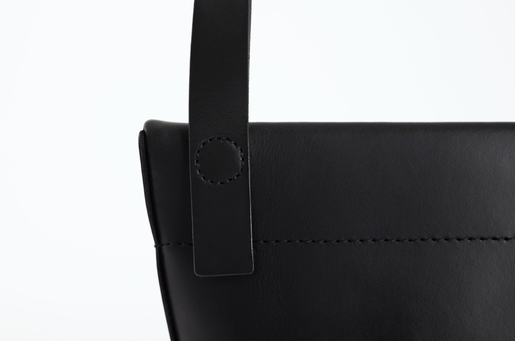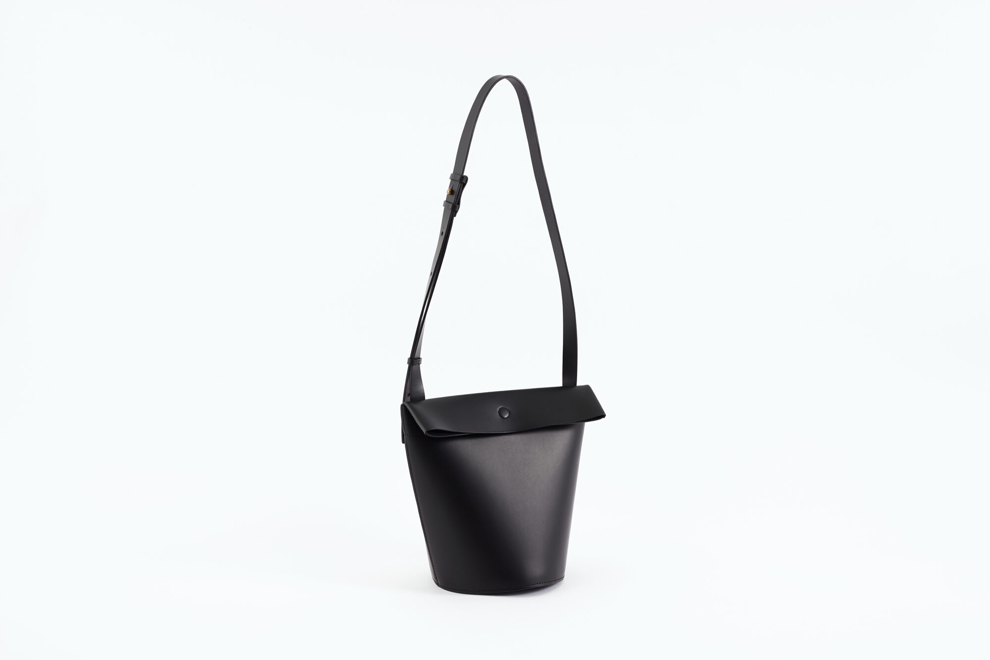 使っている時はもちろん、置かれている時の景色を大切に考えました。円筒の端を折り曲げたような造形は、安定感があり、しっかりと自立します。また、丸底のおかげで中が見やすい作りになっています。マグネットの留め具や持ち手のステッチも丸く仕上げることで、高い強度と統一感が生まれました。