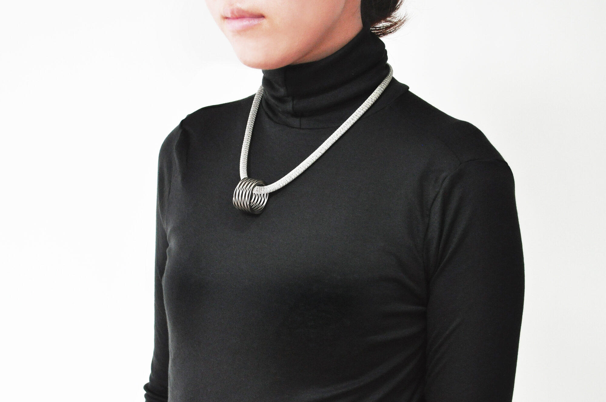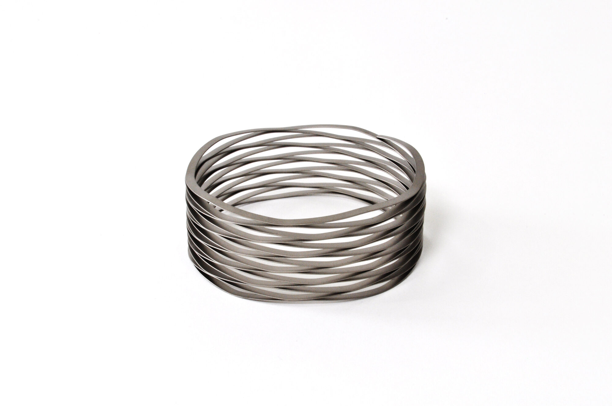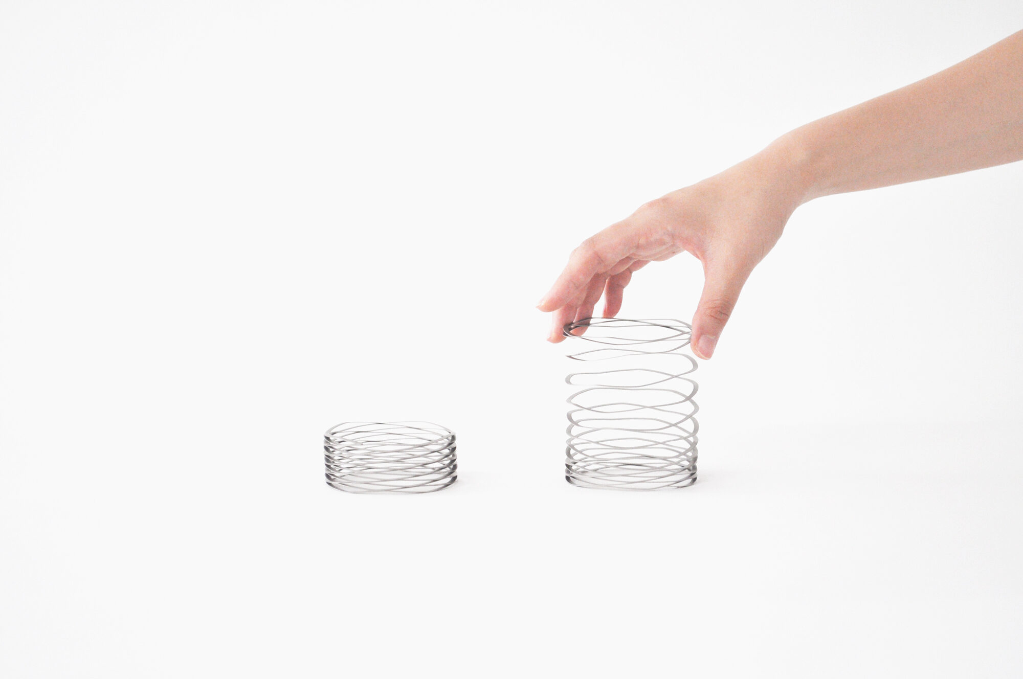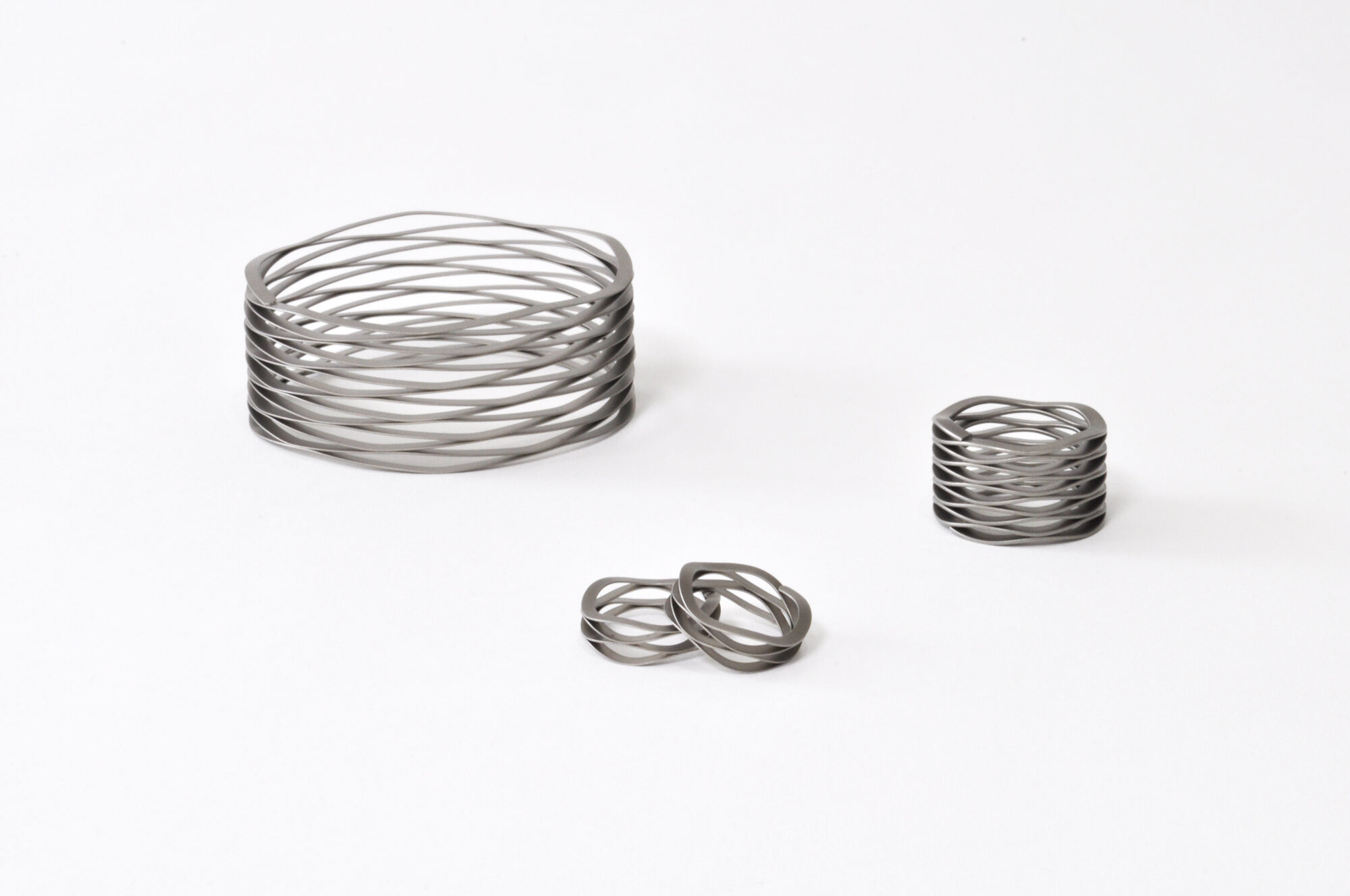 工業製品のパーツに用いられるバネをアクセサリーに見立てました。省スペースを目的に開発されたバネは、シートメタルで曲線を描いているもので、魅力を引き出す為に、アイテムごとにその厚みや波の高さ等を調整しました。