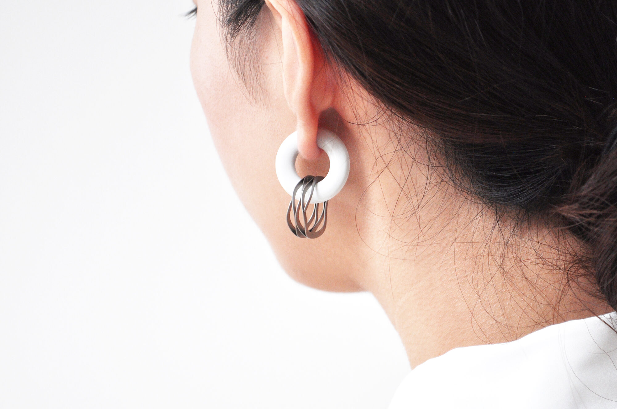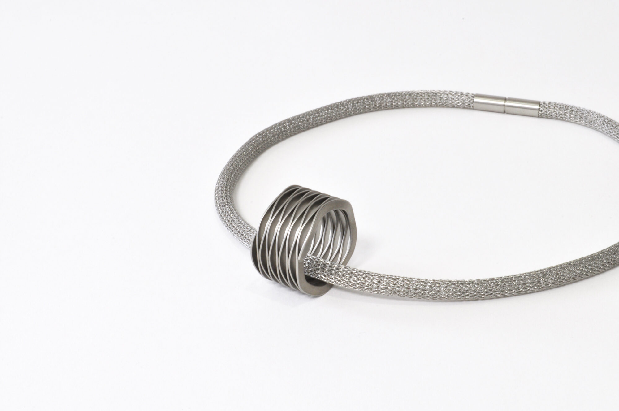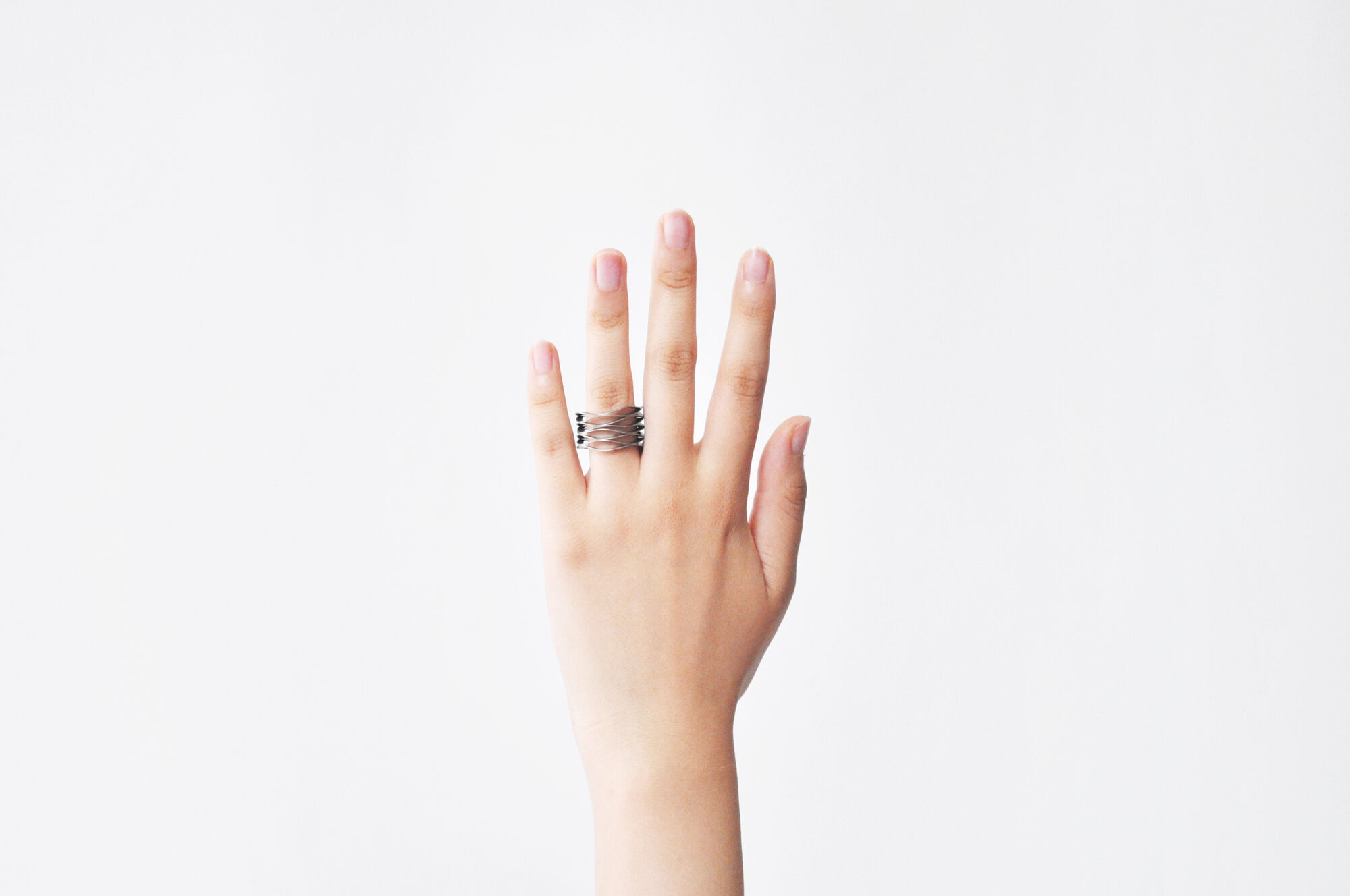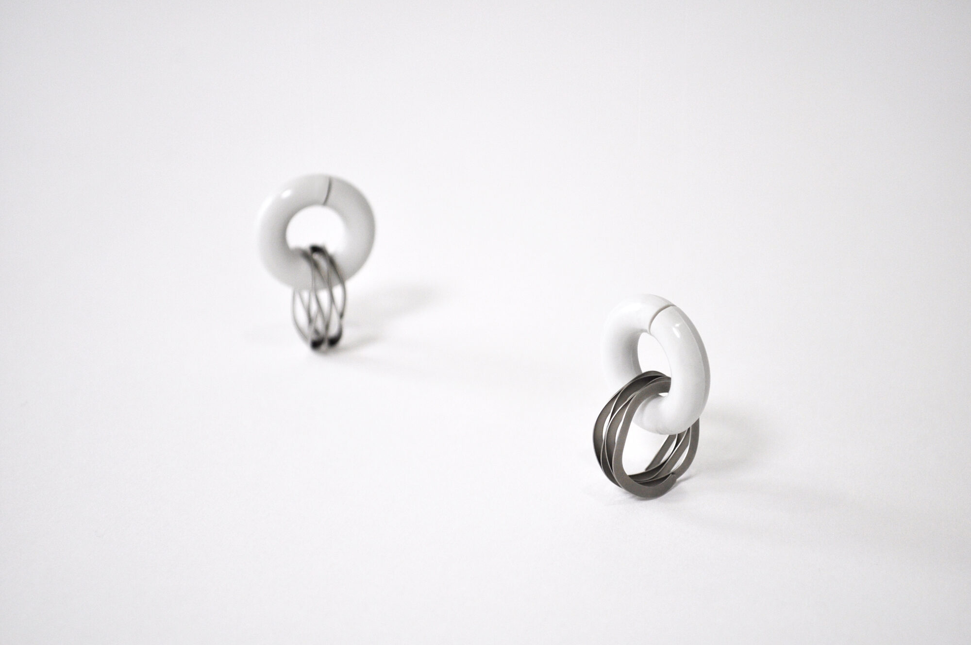 工業製品のパーツに用いられるバネをアクセサリーに見立てました。省スペースを目的に開発されたバネは、シートメタルで曲線を描いているもので、魅力を引き出す為に、アイテムごとにその厚みや波の高さ等を調整しました。