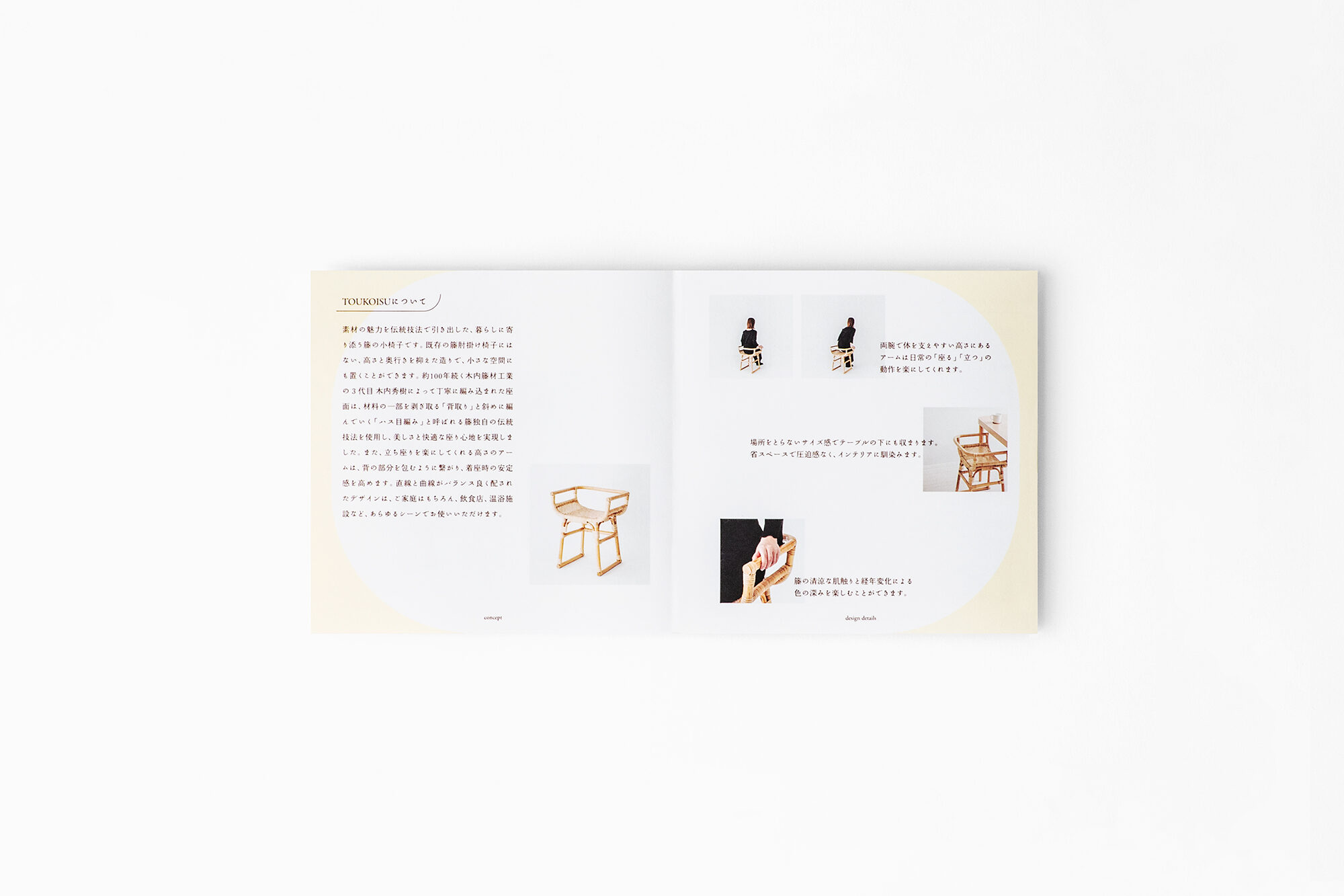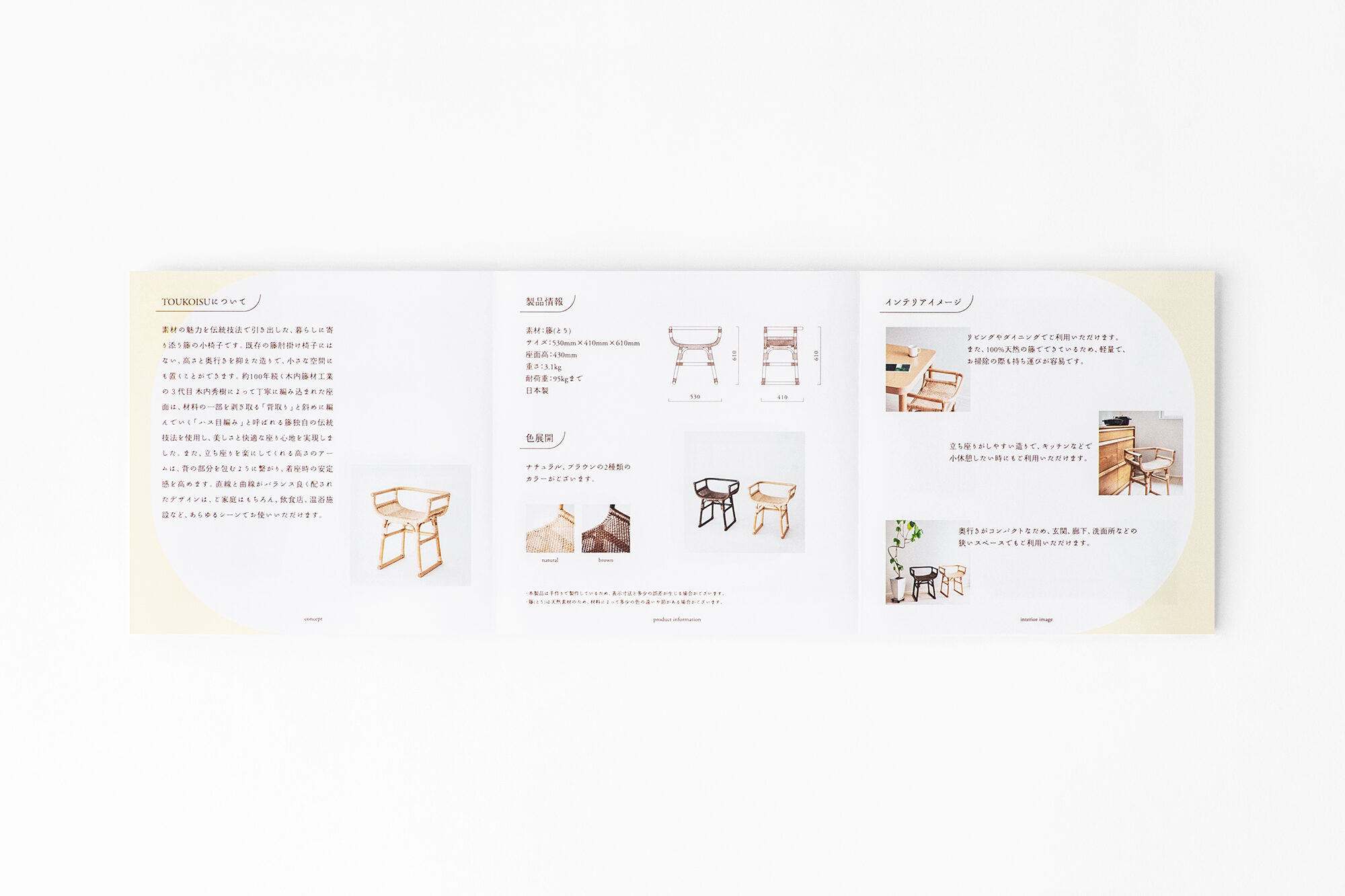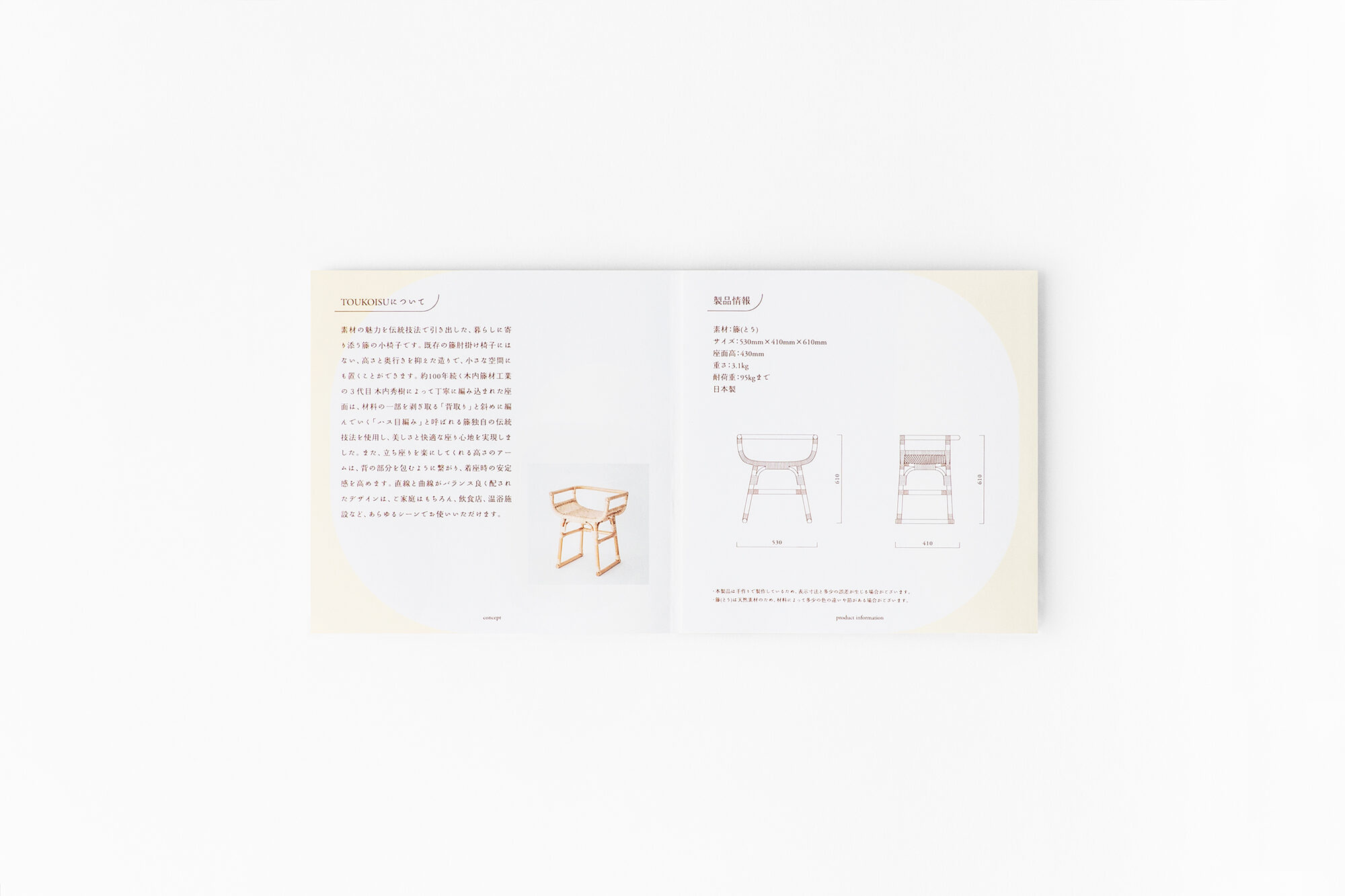 TOUKOISUは、約100年続く木内籐材工業の3代目で東京都伝統工芸士の木内秀樹氏が手掛ける暮らしに寄り添う籐の小椅子です。従来の籐肘掛け椅子にはない、高さと奥行きを抑えた造りで、小さな空間にも置くことができます。手仕事で丁寧に編み込まれた座面は材料の一部を剥ぎ取る「背取り」と斜めに編んでいく「ハス目編み」と呼ばれる籐独自の伝統技法を使用し、美しさと快適な座り心地を実現しました。また、立ち座りを楽にしてくれる高さのアームは、背を包むように繋がり、着座時の安定感を高めます。直線と曲線がバランス良く配された造りは、住空間、飲食店、温浴施設等、あらゆるシーンで活躍が期待出来ます。プロダクトに合わせて、カタログなどのグラフィックも手掛けました。