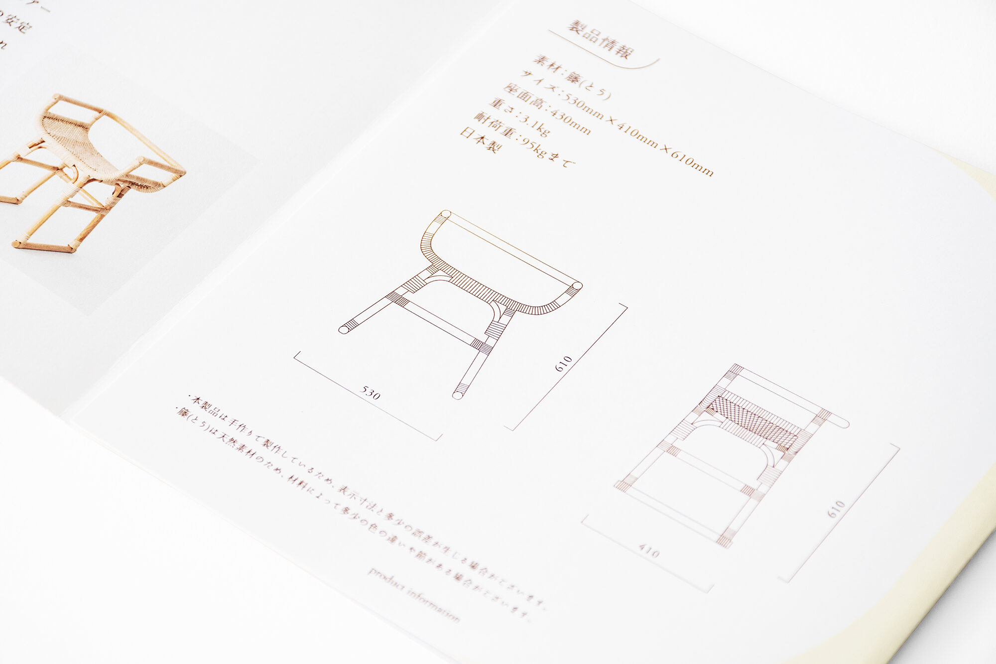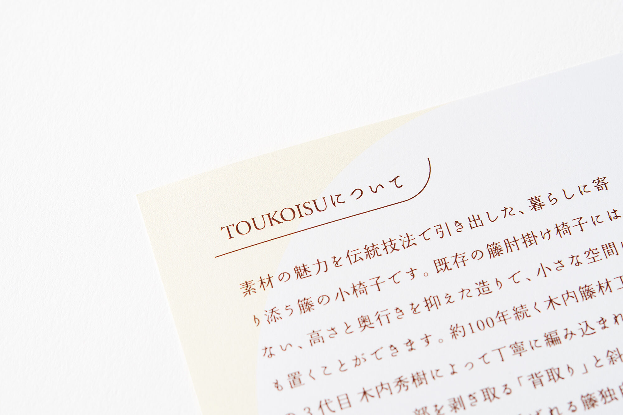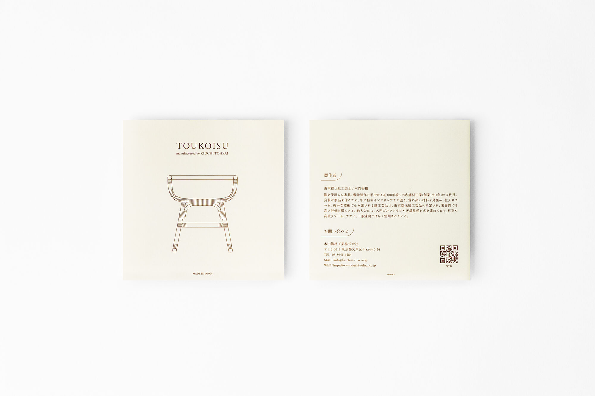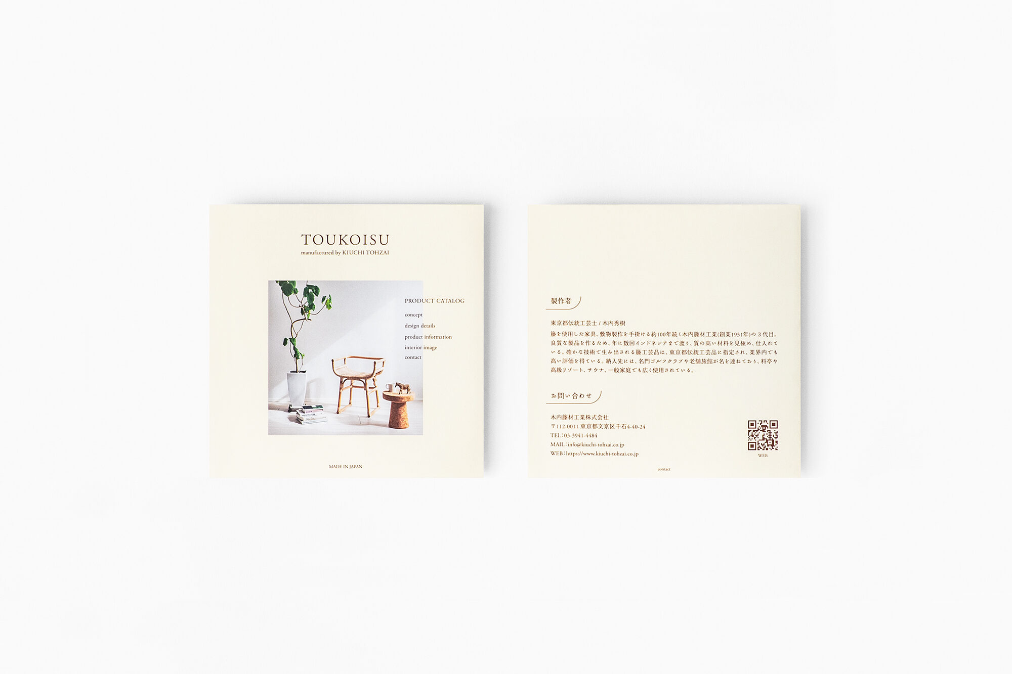 TOUKOISUは、約100年続く木内籐材工業の3代目で東京都伝統工芸士の木内秀樹氏が手掛ける暮らしに寄り添う籐の小椅子です。従来の籐肘掛け椅子にはない、高さと奥行きを抑えた造りで、小さな空間にも置くことができます。手仕事で丁寧に編み込まれた座面は材料の一部を剥ぎ取る「背取り」と斜めに編んでいく「ハス目編み」と呼ばれる籐独自の伝統技法を使用し、美しさと快適な座り心地を実現しました。また、立ち座りを楽にしてくれる高さのアームは、背を包むように繋がり、着座時の安定感を高めます。直線と曲線がバランス良く配された造りは、住空間、飲食店、温浴施設等、あらゆるシーンで活躍が期待出来ます。プロダクトに合わせて、カタログなどのグラフィックも手掛けました。